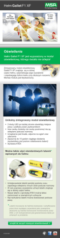 Hełm Gallet F1 XF Hej, Twój hełm mnie oślepia! Nie wiem, co masz na myśli. Oświetlenie Hełm Gallet F1 XF jest wyposażony w moduł oświetleniowy, którego światło nie oślepia! Zintegrowany moduł oświetleniowy Gallet F1 XF znajduje się w dolnej części hełmu, optymalizując jego wyważenie i zapobiegając bólom karku przy dłuższym noszeniu. Montaż modułu jest błyskawiczny. Unikalny zintegrowany moduł oświetleniowy 2 diody LED po każdej stronie oświetlają miejsce pracy i podłoże przed użytkownikiem Inne osoby (koledzy lub osoby postronne) nie są oślepiane podczas rozmowy Urządzenie jest trwałe, odporne na ogień oraz uderzenia Zapewnia do 10 godzin ciągłego działania (wyświetlany jest poziom naładowania baterii) Aprobata ATEX Można także użyć standardowych latarek* wpinanych do hełmu • Umiejscowienie latarki poniżej poziomu oczu zapobiega oślepianiu innych osób podczas rozmowy • W celu poprawy wyważenia uchwyt latarki znajduje się w dolnej części hełmu • Nasze latarki z aprobatą ATEX można łatwo zamocować w zewnętrznym uchwycie • Kąt nachylenia latarki można dostosować podczas pracy * Latarki mocowane do hełmów testowane i certyfikowane przez biuro wydające zezwolenia jako zewnętrzne akcesoria są również technicznie monitorowane przez MSA, a ich funkcjonalność jest gwarantowana także po zmianach w produkcie. przejdź do naszych rozwiązań oświetleniowych » © 2016 MSA