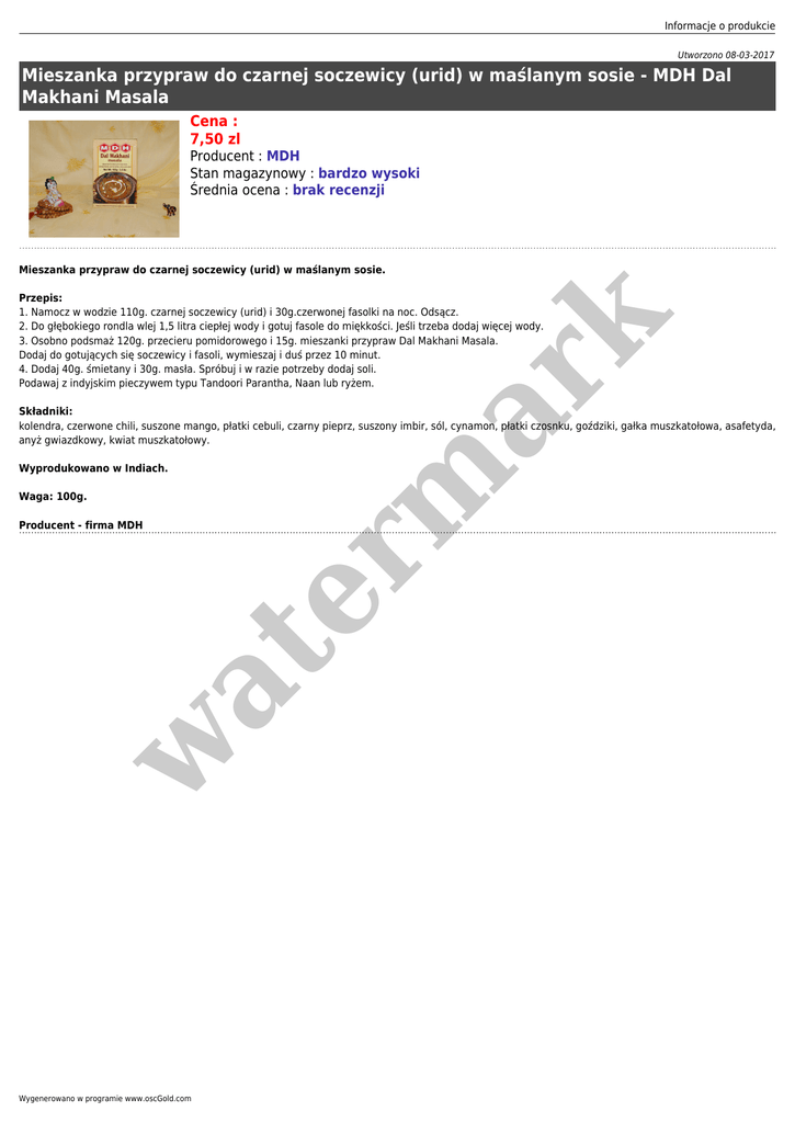 Informacje o produkcie Utworzono 08-03-2017 Mieszanka przypraw do czarnej soczewicy (urid) w maślanym sosie - MDH Dal Makhani Masala Cena : 7,50 zl Producent : MDH Stan magazynowy : bardzo wysoki Średnia ocena : brak recenzji Mieszanka przypraw do czarnej soczewicy (urid) w maślanym sosie. er m ar k Przepis: 1. Namocz w wodzie 110g. czarnej soczewicy (urid) i 30g.czerwonej fasolki na noc. Odsącz. 2. Do głębokiego rondla wlej 1,5 litra ciepłej wody i gotuj fasole do miękkości. Jeśli trzeba dodaj więcej wody. 3. Osobno podsmaż 120g. przecieru pomidorowego i 15g. mieszanki przypraw Dal Makhani Masala. Dodaj do gotujących się soczewicy i fasoli, wymieszaj i duś przez 10 minut. 4. Dodaj 40g. śmietany i 30g. masła. Spróbuj i w razie potrzeby dodaj soli. Podawaj z indyjskim pieczywem typu Tandoori Parantha, Naan lub ryżem. Składniki: kolendra, czerwone chili, suszone mango, płatki cebuli, czarny pieprz, suszony imbir, sól, cynamon, płatki czosnku, goździki, gałka muszkatołowa, asafetyda, anyż gwiazdkowy, kwiat muszkatołowy. Wyprodukowano w Indiach. Waga: 100g. w at Producent - firma MDH Wygenerowano w programie www.oscGold.com