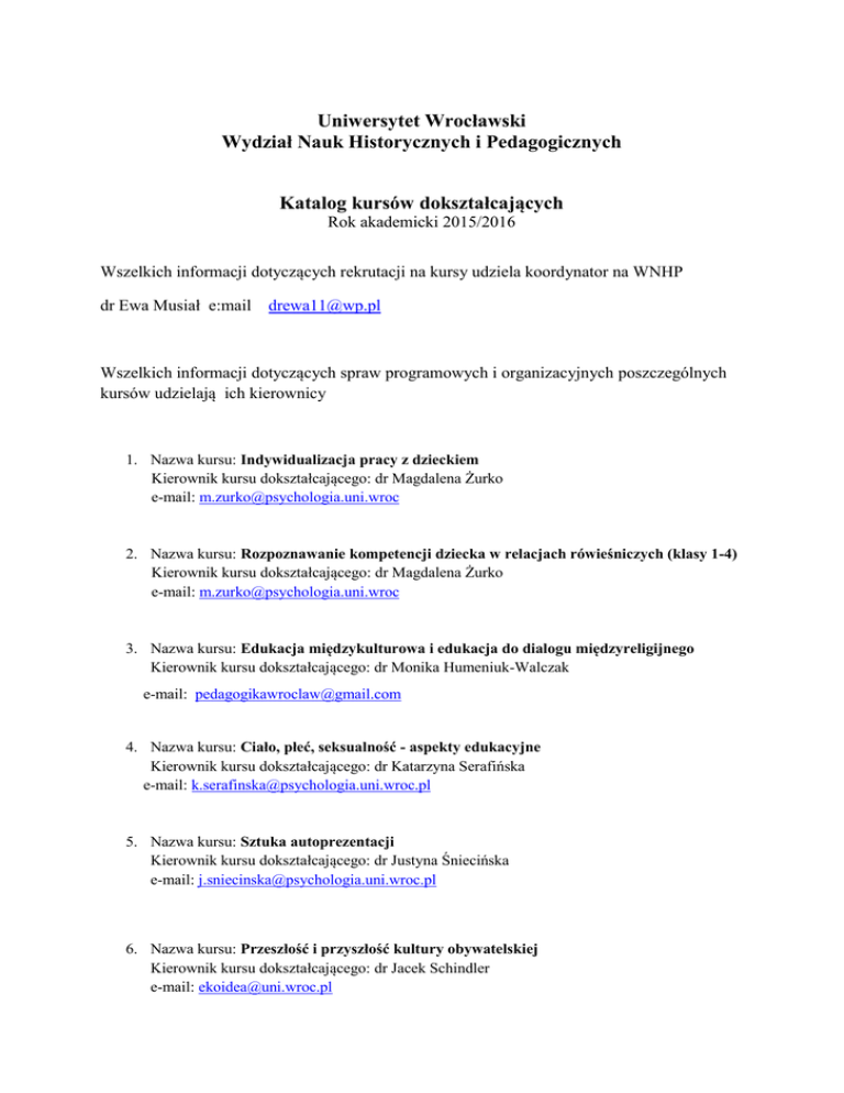 Uniwersytet Wrocławski Wydział Nauk Historycznych i Pedagogicznych Katalog kursów dokształcających Rok akademicki 2015/2016 Wszelkich informacji dotyczących rekrutacji na kursy udziela koordynator na WNHP dr Ewa Musiał e:mail [email protected] Wszelkich informacji dotyczących spraw programowych i organizacyjnych poszczególnych kursów udzielają ich kierownicy 1. Nazwa kursu: Indywidualizacja pracy z dzieckiem Kierownik kursu dokształcającego: dr Magdalena Żurko e-mail: [email protected] 2. Nazwa kursu: Rozpoznawanie kompetencji dziecka w relacjach rówieśniczych (klasy 1-4) Kierownik kursu dokształcającego: dr Magdalena Żurko e-mail: [email protected] 3. Nazwa kursu: Edukacja międzykulturowa i edukacja do dialogu międzyreligijnego Kierownik kursu dokształcającego: dr Monika Humeniuk-Walczak e-mail: [email protected] 4. Nazwa kursu: Ciało, płeć, seksualność - aspekty edukacyjne Kierownik kursu dokształcającego: dr Katarzyna Serafińska e-mail: [email protected] 5. Nazwa kursu: Sztuka autoprezentacji Kierownik kursu dokształcającego: dr Justyna Śniecińska e-mail: [email protected] 6. Nazwa kursu: Przeszłość i przyszłość kultury obywatelskiej Kierownik kursu dokształcającego: dr Jacek Schindler e-mail: [email protected] 7. Nazwa kursu: Psychologia dla polityków Kierownik kursu dokształcającego: dr Jarosław Klebaniuk e-mail: [email protected] 8. Nazwa kursu: Zostałem wychowawcą i co dalej? Integracja zespołu klasowego Kierownik kursu dokształcającego: dr Ewa Musiał [email protected] 9. Nazwa kursu: Metody i techniki aktywizujące w pracy z uczniami Kierownik kursu dokształcającego: dr Ewa Musiał [email protected] 10. Nazwa kursu: Diagnozowanie potrzeb i metody aktywizacji seniorów Kierownik kursu dokształcającego: dr Bogna Bartosz, dr Małgorzata Malec-Rawiński e-mail: [email protected] [email protected]) 11. Nazwa kursu: Psychologia jedzenia i psychodietetyka Kierownik kursu dokształcającego: dr Bianka Lewandowska e-mail: [email protected] 12. Nazwa kursu: Elementy psychologii twórczości – innowacyjne i aktywne metody pracy z dzieckiem młodszym w szkolnej przestrzeni edukacyjnej Kierownik kursu dokształcającego: dr Bogna Bartosz e-mail: [email protected] 13. Nazwa kursu: Jak wychowywać zdrowe dziecko, czyli satysfakcja z macierzyństwa i ojcostwa Kierownik kursu dokształcającego: doc. Alina Czapiga e-mail: [email protected] 14. Nazwa kursu: Kryzysy - jako szansa dla rozwoju osobistego i zawodowego Kierownik kursu dokształcającego: dr hab. Alicja Senejko e-mail: [email protected] 15. Nazwa kursu: Wykorzystanie metody dramy w edukacji wczesnoszkolnej Kierownik kursu dokształcającego: dr Elżbieta Jezierska Wiejak e-mail: [email protected] 16. Nazwa kursu: Wykorzystanie metody projektów w edukacji wczesnoszkolnej Kierownik kursu dokształcającego: dr Elżbieta Jezierska Wiejak e-mail: [email protected] 17. Nazwa kursu: Praca w grupach różnowiekowych w szkole Kierownik kursu dokształcającego: dr Elżbieta Jezierska Wiejak e-mail: [email protected] 18. Nazwa kursu: Edukacja zdrowotna w szkole: program wychowawczy, program profilaktyki, edukacja zdrowotna- razem czy osobno? Kierownik kursu dokształcającego: Joanna Malinowska e-mail: [email protected] 19. Nazwa kursu: Integracja treści czy wiedzy? Organizacja zajęć zindywidualizowanych na I etapie kształcenia Kierownik kursu dokształcającego: Joanna Malinowska e-mail: [email protected] 20. Nazwa kursu: Uczeń jako badacz na zajęciach z edukacji środowiskowej Kierownik kursu dokształcającego: Joanna Malinowska e-mail: [email protected] 21. Nazwa kursu: Zarządzanie klasą szkolną – społeczne uczenie się dzieci Kierownik kursu dokształcającego: Joanna Malinowska e-mail: [email protected] 22. Nazwa kursu: Gotowość szkolna dzieci Kierownik kursu dokształcającego: Halina Dmochowska e-mail: [email protected] 23. Nazwa kursu: W magicznym świecie muzyki – wybrane metody edukacji muzycznej w pracy z dziećmi Kierownik kursu dokształcającego: dr Marta Kondracka-Szala [email protected] 24. Nazwa kursu: Elementy coachingu i tutoringu w pracy z młodzieżą ze szkół ponadgimnazjalnych Kierownik kursu dokształcającego: dr Marek Podgórny e-mail: [email protected] 25. Nazwa kursu: Ekologia i kultura dźwięku Kierownik kursu dokształcającego: dr hab. Renata Tańczuk e-mail : [email protected] Szczegółowe informacje dotyczące kursów dostępne są na stronach internetowych: www.pedagogika..uni.wroc.pl www.psychologia.uni.wroc.pl www.kulturoznawstwo.uni.wroc.pl