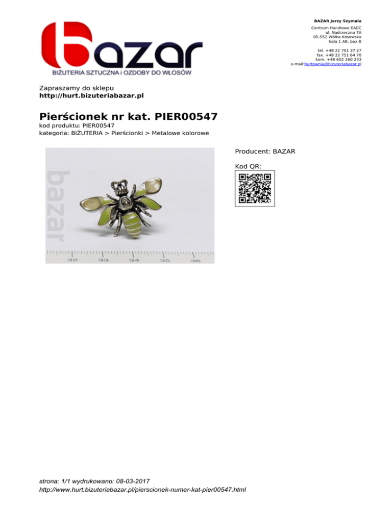 BAZAR Jerzy Szymala Centrum Handlowe EACC ul. Nadrzeczna 7A 05-552 Wólka Kosowska hala 1 AB, box B tel. +48 22 701 37 27 fax. +48 22 751 64 70 kom. +48 602 260 233 e-mail:[email protected] Zapraszamy do sklepu http://hurt.bizuteriabazar.pl Pierścionek nr kat. PIER00547 kod produktu: PIER00547 kategoria: BIŻUTERIA > Pierścionki > Metalowe kolorowe Producent: BAZAR Kod QR: strona: 1/1 wydrukowano: 08-03-2017 http://www.hurt.bizuteriabazar.pl/pierscionek-numer-kat-pier00547.html