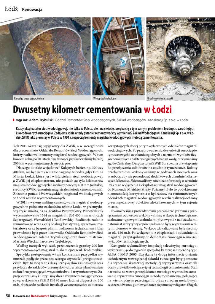Łódź Renowacja Rurociąg przed czyszczeniem Wykop technologiczny Uruchomienie narzucarki Dwusetny kilometr cementowania w Łodzi ❚❚ mgr inż. Adam Trybulski, Oddział Remontów Sieci Wodociągowych, Zakład Wodociągów i Kanalizacji Sp. z o.o. w Łodzi Każdy eksploatator sieci wodociągowej, nie tylko w Polsce, ale i na świecie, boryka się z tym samym problemem brudnych, zarośniętych i skorodowanych rurociągów. Zadajemy sobie wtedy pytanie: remontować czy wymieniać? Zakład Wodociągów i Kanalizacji Sp. z o.o. w Łodzi (ZWiK) jako pierwszy w Polsce w 1991 r. rozpoczął remonty magistral wodociągowych metodą cementowania. Rok 2011 okazał się wyjątkowy dla ZWiK, a w szczególności dla pracowników Oddziału Remontów Sieci Wodociągowych, którzy realizowali remonty magistral wodociągowych. W tym bowiem roku, po 20 latach działalności, przekroczyliśmy barierę 200 km wycementowanych rurociągów. Dlaczego to takie wyjątkowe? Kolejnych barier, np. 300 czy 400 km, nie będziemy w stanie osiągnąć w Łodzi, gdyż Gmina Miasta Łodzi, która jest właścicielem sieci wodociągowej, a ZWiK jej eksploatatorem, nie posiada aż tylu kilometrów magistral wodociągowych o średnicy powyżej 400 mm (od takiej średnicy ZWiK remontuje magistrale metodą cementowania). Znacznie ponad 95% wszystkich magistral wodociągowych w Łodzi zostało wycementowanych. W 2011 r. wykonywaliśmy cementowanie magistral wodociągowych w północno-zachodnim rejonie Łodzi, w przemysłowej części miasta, na os. Teofilów Przemysłowy. Planowaliśmy wycementowanie 1564 m magistrali DN 400 mm w ulicach Szparagowej, Wersalskiej i Teofilowskiej. Realizacja zadania remontowego wraz z całą obsługą logistyczną, sprzętową, materiałową oraz bezpośrednim nadzorem technicznym i bhp prowadzona była przez kierownika Oddziału Remontów Sieci Wodociągowych Adama Trybulskiego oraz dwóch mistrzów: Mariana Więcka i Jarosława Trębskiego. Według naszych wyliczeń, przekroczenie granicy 200 km wycementowanych magistral miało miejsce w ul. Teofilowskiej. Specyfika postępowania w tym konkretnym przypadku wymuszała podjęcie przez nas szeregu czynności przygotowawczych. Było to związane z dużą liczbą węzłów zasuwowych oraz przyłączy do zakładów przemysłowych, a także planowaniem zadań firm pracujących w systemie dwu- i trzyzmianowym. Zaprojektowaliśmy i ułożyliśmy dwa naziemne rurociągi tymczasowe, wykonane z PEHD DN 90 mm o łącznej długości ok. 300 m.b., służące do zasilania instalacji wewnętrznych u odbiorców 58 Nowoczesne Budownictwo Inżynieryjne Marzec – Kwiecień 2012 korzystających do tej pory z wyłączonych odcinków magistral wodociągowych. Po przeprowadzeniu dezynfekcji rurociągów tymczasowych i uzyskaniu zgodnych z normami wyników fizykochemicznych i bakteriologicznych badań wody, otrzymaliśmy zgodę Centralnej Dyspozytorni ZWiK Sp. z o.o. na przystąpienie do przełączania odbiorców na zasilanie tymczasowe. Roboty przełączeniowe wykonywaliśmy w godzinach nocnych oraz w soboty, aby nie powodować dodatkowych utrudnień dla naszych klientów. Skierowaliśmy również informację o terminie i zakresie wyłączenia z eksploatacji magistral wodociągowych do Komendy Miejskiej Straży Pożarnej. Było to podyktowane niemożnością korzystania z hydrantów na remontowanych odcinkach magistral wodociągowych w celu realizacji ochrony przeciwpożarowej obiektów zlokalizowanych w tym rejonie miasta. Równocześnie z prowadzonymi pracami związanymi z przełączaniem odbiorców wykonywaliśmy wykopy technologiczne, szalowane typowymi szalunkami płytowymi z nadstawkami, natomiast szczyty wykopów szalowane były wypraskami wbitymi pionowo w ziemię. Wykopy zlokalizowane były średnio co ok. 120 m.b. Po wyłączeniu z eksploatacji i odwodnieniu magistrali przystąpiliśmy do demontażu rurociągu w miejscu wykopów technologicznych. Następnie wykonaliśmy inspekcję telewizyjną rurociągu, wykorzystując do tego celu specjalną kamerę samojezdną typu ALFA 01/MD 2005. Uzyskane tą drogą informacje o stanie technicznym wewnętrznej ścianki rurociągu były pomocne dla wybrania skutecznej metody jej wyczyszczenia oraz dla oceny prawidłowości przyjętej technologii cementowania. Stan narostów na wewnętrznej ściance rurociągu wymusił zastosowanie czyszczenia rurociągu metodą mechaniczną, polegającą na wielokrotnym przeciąganiu przez rurociąg metalowych czyszczaków oraz gumowych tarcz za pomocą wciągarek (Bagela Renowacja RW10, Varia). Proces czyszczenia, kontrolowany na bieżąco z wykorzystaniem kamery TV, trwał do momentu całkowitego usunięcia osadów, produktów korozji itp. 30 czerwca 2011 r. z zapałem przystąpiliśmy do cementowania odcinka magistrali o długości 120 m – tego dnia przekroczyliśmy dwusetny kilometr wyremontowanych tą metodą magistral wodociągowych. Dzięki bardzo doświadczonemu, wysoce wykwalifikowanemu kilkunastoosobowemu zespołowi monterów roboty przebiegły bardzo sprawnie i bez jakichkolwiek zakłóceń. Sam proces cementowania rurociągu o średnicy DN 400 mm trwa krócej niż roboty przygotowawcze i towarzyszące: rozstawianie sprzętu, wciąganie węży do rurociągu, uruchomienie pompobetoniarki itp. Nakładanie wykładziny cementowo-piaskowej na wewnętrzną powierzchnię rurociągu odbywa się za pomocą specjalnego urządzenia przemieszczającego się przez rurociąg, wyposażonego w obrotową głowicę natryskową, ustawioną na specjalnym wózku jezdnym w osi rurociągu i napędzaną pneumatycznie sprężonym powietrzem doprowadzonym wężami ciśnieniowymi ze sprężarki Atlas Copco. Do rurociągu w wykopie początkowym wciągany jest zestaw węży składający się z liny stalowej, ciągnącej, węża gumowego, zbrojonego do transportu zaprawy cementowo-piaskowej i węża do transportu sprężonego powietrza, które to węże i linę w drugim końcu rurociągu w wykopie 