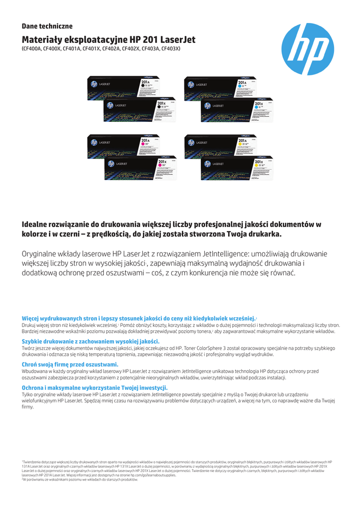 Dane techniczne Materiały eksploatacyjne HP 201 LaserJet (CF400A, CF400X, CF401A, CF401X, CF402A, CF402X, CF403A, CF403X) Idealne rozwiązanie do drukowania większej liczby profesjonalnej jakości dokumentów w kolorze i w czerni – z prędkością, do jakiej została stworzona Twoja drukarka. Oryginalne wkłady laserowe HP LaserJet z rozwiązaniem JetIntelligence: umożliwiają drukowanie większej liczby stron w wysokiej jakości , zapewniają maksymalną wydajność drukowania i dodatkową ochronę przed oszustwami – coś, z czym konkurencja nie może się równać. 1 Więcej wydrukowanych stron i lepszy stosunek jakości do ceny niż kiedykolwiek wcześniej. 1 Drukuj więcej stron niż kiedykolwiek wcześniej.1 Pomóż obniżyć koszty, korzystając z wkładów o dużej pojemności i technologii maksymalizacji liczby stron. Bardziej niezawodne wskaźniki poziomu pozwalają dokładniej przewidywać poziomy tonera,2 aby zagwarantować maksymalne wykorzystanie wkładów. Szybkie drukowanie z zachowaniem wysokiej jakości. Twórz jeszcze więcej dokumentów najwyższej jakości, jakiej oczekujesz od HP. Toner ColorSphere 3 został opracowany specjalnie na potrzeby szybkiego drukowania i odznacza się niską temperaturą topnienia, zapewniając niezawodną jakość i profesjonalny wygląd wydruków. Chroń swoją firmę przed oszustwami. Wbudowana w każdy oryginalny wkład laserowy HP LaserJet z rozwiązaniem JetIntelligence unikatowa technologia HP dotycząca ochrony przed oszustwami zabezpiecza przed korzystaniem z potencjalnie nieoryginalnych wkładów, uwierzytelniając wkład podczas instalacji. Ochrona i maksymalne wykorzystanie Twojej inwestycji. Tylko oryginalne wkłady laserowe HP LaserJet z rozwiązaniem JetIntelligence powstały specjalnie z myślą o Twojej drukarce lub urządzeniu wielofunkcyjnym HP LaserJet. Spędzaj mniej czasu na rozwiązywaniu problemów dotyczących urządzeń, a więcej na tym, co naprawdę ważne dla Twojej firmy. 1Twierdzenia dotyczące większej liczby drukowanych stron oparto na wydajności wkładów o największej pojemności do starszych produktów, oryginalnych błękitnych, purpurowych i żółtych wkładów laserowych HP 131A LaserJet oraz oryginalnych czarnych wkładów laserowych HP 131X LaserJet o dużej pojemności, w porównaniu z wydajnością oryginalnych błękitnych, purpurowych i żółtych wkładów laserowych HP 201X LaserJet o dużej pojemności oraz oryginalnych czarnych wkładów laserowych HP 201X LaserJet o dużej pojemności. Twierdzenie nie dotyczy oryginalnych czarnych, błękitnych, purpurowych i żółtych wkładów laserowych HP 201A LaserJet. Więcej informacji jest dostępnych na stronie hp.com/go/learnaboutsupplies. 2W porównaniu ze wskaźnikami poziomu we wkładach do starszych produktów. Dane techniczne | Materiały eksploatacyjne HP 201 LaserJet Informacje o zgodności Drukarki HP Color LaserJet Pro seria M252; Urządzenia wielofunkcyjne HP Color LaserJet Pro seria M277 Dane techniczne produktu P/N Opis Średnia wydajność kasety z tonerem * Wymiary (dł x szer x gł) Waga Kod UPC CF400A HP 201A oryginalny wkład laserowy, czarny 1500 stron 363 x 96 x 111 mm 0,75 kg 888793237946 CF400X HP 201X oryginalny wkład laserowy o dużej pojemności, czarny 2800 stron 363 x 102 x 111 mm 0,77 kg 888793237984 CF401A HP 201A oryginalny wkład laserowy, błękitny 1400 stron 363 x 96 x 111 mm 0,75 kg 888793237953 CF401X HP 201X oryginalny wkład laserowy o dużej pojemności, błękitny 2300 stron 363 x 96 x 111 mm 0,75 kg 888793237991 CF402A HP 201A oryginalny wkład laserowy, żółty 1400 stron 363 x 96 x 111 mm 0,75 kg 888793237960 CF402X HP 201X oryginalny wkład laserowy o dużej pojemności, żółty 2300 stron 363 x 96 x 111 mm 0,75 kg 888793238004 CF403A HP 201A oryginalny wkład laserowy, purpurowy 1400 stron 363 x 96 x 111 mm 0,75 kg 888793237977 CF403X HP 201X oryginalny wkład laserowy o dużej pojemności, purpurowy 2300 stron 363 x 96 x 111 mm 0,75 kg 888793238011 *Przybliżona średnia wydajność wkładu czarnego według normy ISO/IEC 19798. Przybliżona średnia wydajność wkładu błękitnego, żółtego, purpurowego według normy ISO/IEC 19798. Rzeczywista wydajność może się znacznie różnić w zależności od zawartości drukowanych stron i innych czynników. Szczegółowe informacje są dostępne na stronie hp.com/go/learnaboutsupplies. Gwarancja Gwarancja HP Premium Protection. HP gwarantuje, że ten produkt jest wolny od wad materiałowych i produkcyjnych. Aby uzyskać więcej informacji na temat materiałów konsumpcyjnych HP, odwiedź http://www.hp.com Produkt może odbiegać wyglądem od widocznego na ilustracjach. © Copyright 2015 Hewlett-Packard Development Company, L.P. Informacje zawarte w niniejszym dokumencie mogą ulec zmianie bez powiadomienia. Jedyne gwarancje, jakich firma HP udziela na produkty i usługi, są określone w oświadczeniach gwarancyjnych dostarczanych wraz z tymi produktami i usługami. Żadne informacje przedstawione w niniejszym dokumencie nie powinny być interpretowane jako dodatkowa gwarancja. Firma HP nie ponosi odpowiedzialności za błędy techniczne lub redakcyjne oraz braki występujące w niniejszym dokumencie. 4AA5-7036PLE, Luty 2015