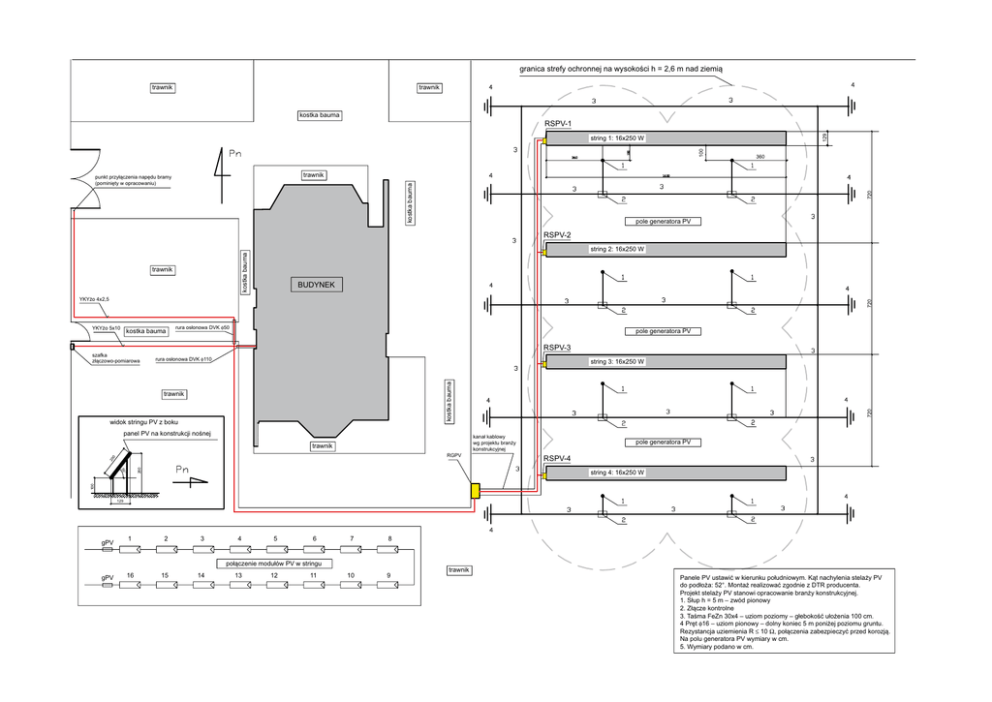 granica strefy ochronnej na wysokości h = 2,6 m nad ziemią trawnik trawnik kostka bauma RSPV-1 100 129 string 1: 16x250 W 360 trawnik 720 kostka bauma punkt przyłączenia napędu bramy (pominięty w opracowaniu) pole generatora PV RSPV-2 kostka bauma string 2: 16x250 W trawnik BUDYNEK 720 YKYżo 4x2,5 kostka bauma pole generatora PV RSPV-3 rura osłonowa DVK φ110 string 3: 16x250 W trawnik widok stringu PV z boku panel PV na konstrukcji nośnej trawnik kanał kablowy wg projektu branży konstrukcyjnej pole generatora PV RSPV-4 string 4: 16x250 W 100 ° 50 260 20 0 RGPV 720 szafka złączowo-pomiarowa rura osłonowa DVK φ50 kostka bauma YKYżo 5x10 129 gPV 1 2 3 16 15 14 4 5 6 7 8 10 9 połączenie modułów PV w stringu gPV 13 12 11 trawnik Panele PV ustawić w kierunku południowym. Kąt nachylenia stelaży PV do podłoża: 52°. Montaż realizować zgodnie z DTR producenta. Projekt stelaży PV stanowi opracowanie branży konstrukcyjnej. 1. Słup h = 5 m – zwód pionowy 2. Złącze kontrolne 3. Taśma FeZn 30x4 – uziom poziomy – głebokość ułożenia 100 cm. 4 Pręt φ16 – uziom pionowy – dolny koniec 5 m poniżej poziomu gruntu. Rezystancja uziemienia R ≤ 10 Ω, połączenia zabezpieczyć przed korozją. Na polu generatora PV wymiary w cm. 5. Wymiary podano w cm.