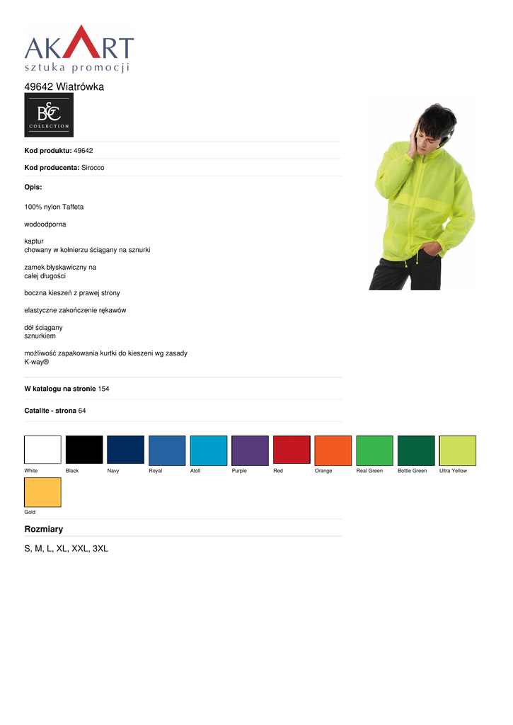 49642 Wiatrówka Kod produktu: 49642 Kod producenta: Sirocco Opis: 100% nylon Taffeta wodoodporna kaptur chowany w kołnierzu ściągany na sznurki zamek błyskawiczny na całej długości boczna kieszeń z prawej strony elastyczne zakończenie rękawów dół ściągany sznurkiem możliwość zapakowania kurtki do kieszeni wg zasady K-way® W katalogu na stronie 154 Catalite - strona 64 White Black Navy Gold Rozmiary S, M, L, XL, XXL, 3XL Royal Atoll Purple Red Orange Real Green Bottle Green Ultra Yellow