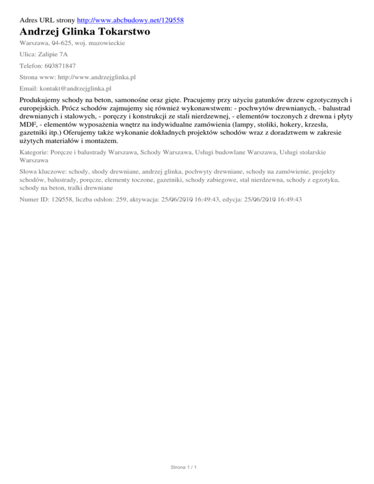 Adres URL strony http://www.abcbudowy.net/120558 Andrzej Glinka Tokarstwo Warszawa, 04-625, woj. mazowieckie Ulica: Zalipie 7A Telefon: 603871847 Strona www: http://www.andrzejglinka.pl Email: [email protected] Produkujemy schody na beton, samonośne oraz gięte. Pracujemy przy użyciu gatunków drzew egzotycznych i europejskich. Prócz schodów zajmujemy się również wykonawstwem: - pochwytów drewnianych, - balustrad drewnianych i stalowych, - poręczy i konstrukcji ze stali nierdzewnej, - elementów toczonych z drewna i płyty MDF, - elementów wyposażenia wnętrz na indywidualne zamówienia (lampy, stoliki, hokery, krzesła, gazetniki itp.) Oferujemy także wykonanie dokładnych projektów schodów wraz z doradztwem w zakresie użytych materiałów i montażem. Kategorie: Poręcze i balustrady Warszawa, Schody Warszawa, Usługi budowlane Warszawa, Usługi stolarskie Warszawa Słowa kluczowe: schody, shody drewniane, andrzej glinka, pochwyty drewniane, schody na zamówienie, projekty schodów, balustrady, poręcze, elementy toczone, gazetniki, schody zabiegowe, stal nierdzewna, schody z egzotyku, schody na beton, tralki drewniane Numer ID: 120558, liczba odsłon: 259, aktywacja: 25/06/2010 16:49:43, edycja: 25/06/2010 16:49:43 Strona 1 / 1