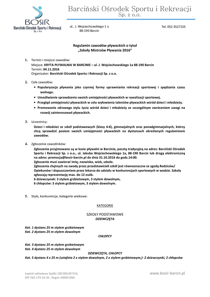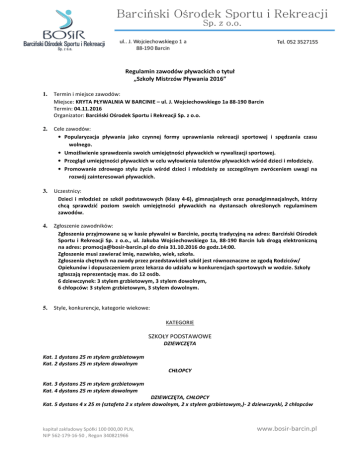 Regulamin zawodów pływackich o tytuł „Szkoły Mistrzów Pływania 2016” 1. Termin i miejsce zawodów: Miejsce: KRYTA PŁYWALNIA W BARCINIE – ul. J. Wojciechowskiego 1a 88-190 Barcin Termin: 04.11.2016 Organizator: Barciński Ośrodek Sportu i Rekreacji Sp. z o.o. 2. Cele zawodów: • Popularyzacja pływania jako czynnej formy uprawniania rekreacji sportowej i spędzania czasu wolnego. • Umożliwienie sprawdzenia swoich umiejętności pływackich w rywalizacji sportowej. • Przegląd umiejętności pływackich w celu wyłowienia talentów pływackich wśród dzieci i młodzieży. • Promowanie zdrowego stylu życia wśród dzieci i młodzieży ze szczególnym zwróceniem uwagi na rozwój zainteresowań pływackich. 3. Uczestnicy: Dzieci i młodzież ze szkół podstawowych (klasy 4-6), gimnazjalnych oraz ponadgimnazjalnych, którzy chcą sprawdzić poziom swoich umiejętności pływackich na dystansach określonych regulaminem zawodów. 4. Zgłoszenie zawodników: Zgłoszenia przyjmowane są w kasie pływalni w Barcinie, pocztą tradycyjną na adres: Barciński Ośrodek Sportu i Rekreacji Sp. z o.o., ul. Jakuba Wojciechowskiego 1a, 88-190 Barcin lub drogą elektroniczną na adres: [email protected] do dnia 31.10.2016 do godz.14:00. Zgłoszenie musi zawierać imię, nazwisko, wiek, szkoła. Zgłoszenia chętnych na zwody przez przedstawicieli szkół jest równoznaczne ze zgodą Rodziców/ Opiekunów i dopuszczeniem przez lekarza do udziału w konkurencjach sportowych w wodzie. Szkoły zgłaszają reprezentację max. do 12 osób. 6 dziewczynek: 3 stylem grzbietowym, 3 stylem dowolnym, 6 chłopców: 3 stylem grzbietowym, 3 stylem dowolnym. 5. Style, konkurencje, kategorie wiekowe: KATEGORIE SZKOŁY PODSTAWOWE DZIEWCZĘTA Kat. 1 dystans 25 m stylem grzbietowym Kat. 2 dystans 25 m stylem dowolnym CHŁOPCY Kat. 3 dystans 25 m stylem grzbietowym Kat. 4 dystans 25 m stylem dowolnym DZIEWCZĘTA, CHŁOPCY Kat. 5 dystans 4 x 25 m (sztafeta 2 x stylem dowolnym, 2 x stylem grzbietowym,)- 2 dziewczynki, 2 chłopców kapitał zakładowy Spółki 100 000,00 PLN, NIP 562-179-16-50 , Regon 340821966 www.bosir-barcin.pl GIMNAZJUM DZIEWCZĘTA Kat. 6 dystans 50 m stylem grzbietowym Kat. 7 dystans 50 m stylem dowolnym CHŁOPCY Kat. 8 dystans 50 m stylem grzbietowym Kat. 9 dystans 50 m stylem dowolnym DZIEWCZĘTA, CHŁOPCY Kat. 10 dystans 4 x 50 m (sztafeta stylem dowolnym) - 2 dziewczynki, 2 chłopców SZKOŁY PONADGIMNAZJALNE DZIEWCZĘTA Kat. 11 dystans 50 m stylem grzbietowym Kat. 12 dystans 50 m stylem dowolnym CHŁOPCY Kat. 13 dystans 50 m stylem grzbietowym Kat.14 dystans 50 m stylem dowolnym DZIEWCZĘTA, CHŁOPCY Kat 15 dystans 4 x 50 m (sztafeta stylem dowolnym) - 2 dziewczynki, 2 chłopców 6. Komisja sędziowska: sędziowie zostaną zaprezentowaniu przez organizatora w dniu zawodów. 7. Regulamin zawodów: - Uczestnik musi posiadać dokument tożsamości (legitymację szkolną), którą należy okazać przy wejściu na basen, - Wejście na basen dla uczestników na czas trwania zawodów jest bezpłatne, - Zawodnicy rywalizują w kategoriach indywidualnych i grupowych, - Start w każdej konkurencji odbywa się: * dla szkół podstawowych z wody w miejscu startowym * dla szkół gimnazjalnych i ponadgimnazjalnych - ze słupka startowego, - pomiar czasu: ręczny - temperatura wody: 28° - Każdy z uczestników może brać udział tylko w jednej kategorii wiekowej i w jednej konkurencji (z wyjątkiem biegów sztafetowych), - Zakończenie każdego odcinka uznawane jest po prawidłowym zakończeniu wyścigu, - Zabronione jest przeszkadzanie innemu pływakowi oraz używanie urządzeń lub ubioru, który pomagałby zwiększać szybkość, pływalność lub wytrzymałość (płetwy, łapki, rękawice, deski itp.), - Zawodnicy, którzy nie zgłoszą się na start po wywołaniu przez spikera lub nie pokonają właściwego dystansu będą nie klasyfikowani (DSQ), - Dyskwalifikacja zawodnika nastąpi również w przypadku: dotknięcia linii przez zawodnika, wykonania falstartu bądź w przypadku nieprawidłowego zakończenia wyścigu danym stylem, - Do ogólnej klasyfikacji szkół brane będą pod uwagę wyniki poszczególnych zawodników reprezentujących daną szkołę dla których ustala się następującą punktację: kapitał zakładowy Spółki 100 000,00 PLN, NIP 562-179-16-50 , Regon 340821966 www.bosir-barcin.pl 1 miejsce – 5 pkt. 2 miejsce – 3 pkt. 3 miejsce – 1 pkt. Taki sam sposób punktacji ustala się dla sztafet biorących udział w zawodach. - Najwyższy tytuł „Szkoła Mistrzów Pływania 2016” otrzymuje placówka, która zdobyła łącznie największą liczbę punktów. - Na teren hali basenowej wchodzą tylko osoby, które startują w zawodach oraz opiekunowie grup szkolnych, - Organizatorzy imprezy i sędziowie zastrzegają sobie prawo interpretacji regulaminu, - Wyniki będą ogłaszane na bieżąco przez spikera, po zawodach będą dostępne na stronie www.bosirbarcin.pl 8. Nagrody: Za zajęcie miejsc I-III w każdej kategorii wiekowej zawodnicy otrzymują medale. Najlepsza szkoła w swojej kategorii otrzyma puchar oraz certyfikat nadania tytułu. 9. Program zawodów i sprawy związane z zawodami: - godz. 9.00 – zbiórka zawodników w holu głównym pływalni, sprawdzenie listy obecności, - godz. 9.10 – przekroczenie bramki wejściowej, - godz. 9.30 – rozpoczęcie zawodów, - wręczanie pucharów w trakcie trwania zawodów 10. Postanowienia końcowe: Regulamin zawodów będzie wywieszony w holu głównym krytej pływalni oraz na stronie www.bosirbarcin.pl W sprawach spornych lub nie objętych regulaminem – decyduje organizator zawodów w porozumieniu z sędzią głównym. kapitał zakładowy Spółki 100 000,00 PLN, NIP 562-179-16-50 , Regon 340821966 www.bosir-barcin.pl