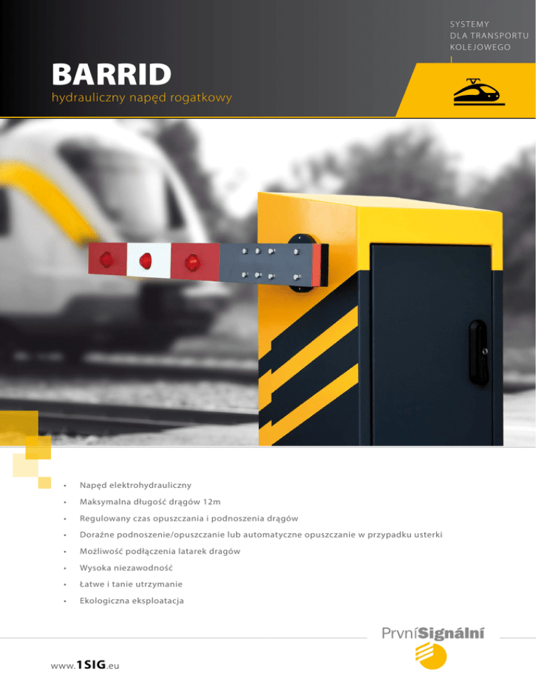 BARRID hydrauliczny napęd rogatkowy • Napęd elektrohydrauliczny • Maksymalna długość drągów 12m • Regulowany czas opuszczania i podnoszenia drągów • Doraźne podnoszenie/opuszczanie lub automatyczne opuszczanie w przypadku usterki • Możliwość podłączenia latarek dragów • Wysoka niezawodność • Łatwe i tanie utrzymanie • Ekologiczna eksploatacja www. 1SIG .eu SYSTEMY D L A T R A N S P O R T U KOLEJOWEGO BARRID przeznaczony jest do sterowania drągami rogatkowymi z jednostronnym lub dwustronnym mocowaniem. Czas opadania można regulować w zakresie 10 do 15 sekund. BARRID może współpracować ze stosowanymi urządzeniami zabezpieczenia ruchu na przejazdach. Umożliwia samoczynne opadanie po awarii zasilania dla rogatek najazdowych. BARRID umożliwia doraźne podnoszenie i opuszczanie dla rogatek wyjazdowych lub dla rogatek obsługiwanych przez dróżnika przejazdowego. OPIS OGÓLNY PODSTAWOWY OPIS TECHNICZNY Wariantowo możliwe jest ryglowanie w dolnym położeniu lub opuszczenie i zablokowanie w aktualnym położeniu. Regulacja elektroniczna zapewnia płynne osiągnięcie pionowego i poziomego położenia krańcowego. Struktura modułowa umożliwia szybką wymianę podzespołów. • BARRID pozwala na wykorzystanie jednostronnie mocowanych drągów o długości do ok. 6 m. • Dwustronnie mocowane drągi mogą mieć długość do 12 m. • Napęd rogatkowy ma konfigurowalną opcję ryglowania. Jeśli funkcja ryglowania jest aktywna, nie można zmienić położenia drąga ponad 15°, używając siły o wielkości min. 1000 Nm. • Jeśli funkcja ryglowania nie jest aktywowana, drąg rogatkowy można podnieść używając siły o wielkości max. 200 Nm. • Napęd rogatkowy zapewnia możliwość regulacji czasu opuszczania i podnoszenia. • Opuszczanie - w zakresie 10s do 15s. Regulacja wykonywana jest przy użyciu zawora dławiącego. • Czas podnoszenia wynika z typu pompy hydraulicznej. Standardowy czas podnoszenia drągów wynosi 10 sekund. Można osiągnąć krótsze czasy podnoszenia (ok. 6 s). • Opuszczanie drągów w przypadku usterki realizowane jest w 15-20 s, w zależności od temperatury cieczy hydraulicznej. • Napęd umożliwia ręczne podniesienie z użyciem korby oraz blokadę w górnym położeniu krańcowym. • BARRID gwarantuje niezawodną pracę i trzymanie rogatki do prędkości wiatru wynoszącej 120 km/h. • Do montażu drąga rogatkowego służy standardowy wał o średnicy 55 mm, który umożliwia osadzenie tulei. • Napęd rogatkowy umieszcza się na zestandaryzowanym fundamencie o rozstawie otworów 265/355 mm. PODSTAWOWE DANE TECHNICZNE Maks. długość drąga 12 m Czas opuszczania 10 do 15 s Czas podnoszenia 10 s lub 6 s Zasilanie 19,2 .. 28,8 V DC Temperatura otoczenia -40 .. +70°C Średnica wału 55 mm Blokada w położeniu dolnym Możliwa www. 1SIG .eu