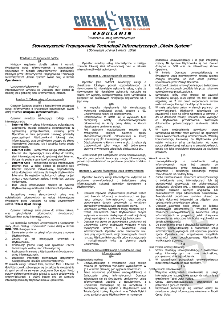 REGULAMIN Świadczenia Usług Informatycznych przez Stowarzyszenie Propagowania Technologii Informatycznych „Chełm System” (Obowiązuje od dnia 1 marca 2008) Rozdział 1. Postanowienia ogólne §1 Niniejszy regulamin określa zakres i warunki świadczenia usług informatycznych o ograniczonym charakterze w ramach zorganizowanych społeczności lokalnych przez Stowarzyszenie Propagowania Technologii Informatycznych „Chełm System” zwane dalej w skrócie Operatorem. §2 Użytkownicy/członkowie lokalnych sieci informatycznych uzyskują od Operatora stały dostęp do lokalnej jak i globalnej sieci informatycznej Internet. Rozdział 2. Zakres usług informatycznych §3 Operator świadczy zgodnie z Regulaminem dostępowe usługi informatyczne o charakterze ograniczonym zwane dalej w skrócie usługami informatycznymi. §4 Operator świadczy następujące rodzaje usług informatycznych: 1. Internet Mini – usługa informatyczna polegająca na zapewnieniu stałego połączenia elektronicznego (z ograniczoną przepustowością ustaloną przez Operatora w dniu podpisania Umowy) pomiędzy poszczególnymi Użytkownikami lokalnej sieci informatycznej, oraz umożliwieniu dostępu do strony internetowej Operatora, jak i zasobów konta poczty elektronicznej. 2. Internet Maxi – rozszerzona usługa informatyczna Internet Mini zapewniająca stały dostęp do lokalnej sieci informatycznej oraz do globalnej sieci Internet. Usługa nie posiada ograniczeń przepustowości. 3. Internet Gold – rozszerzona usługa informatyczna Internet Maxi, w której dostęp do globalnej sieci Internet zapewnia indywidualny, niepowtarzalny adres dostępowy, widzialny dla innych Użytkowników Internetu. Ze względów technicznych usługa ta jest usługą o ograniczonym zasięgu i może być czasowo niedostępna. 4. Inne usługi informatyczne możliwe na życzenie Użytkownika wg możliwości technicznych Operatora. §5 Szczegółowy wykaz standardowych usług oraz opłat/składek członkowskich za usługi informatyczne świadczone przez Operatora na rzecz Użytkowników określa Tabela Opłat i Usług. §6 Operator zastrzega sobie prawo do zmiany zakresu oraz opłat/składek członkowskich świadczonych Użytkownikowi usług informatycznych. §7 Do kontaktów pomiędzy użytkownikiem a Operatorem służy „Biuro Obsługi Użytkownika” zwane dalej w skrócie BOU. BOU obsługuje m.in.: 1. Zawieranie umów na usługi informatyczne z nowymi Użytkownikami. 2. Zmiany w już istniejących umowach z Użytkownikami. 3. Reklamacje jakości usług oraz zgłaszanie usterek technicznych lokalnej sieci informatycznej. 4. Rozliczenia finansowe z Użytkownikami świadczonych usług informatycznych. 5. Udzielanie informacji technicznych dotyczących funkcjonowania lokalnej sieci informatycznej. W ramach usługi Internet Mini, Internet Maxi i Internet Gold Użytkownik zobowiązuje się do założenia nieodpłatnie skrzynki e-mail na serwerze pocztowym Operatora. Konto poczty elektronicznej można założyć w czasie podpisywania umowy/deklaracji, a służyć będzie ona do wymiany informacji pomiędzy Użytkownikiem a Operatorem. §8 Operator świadczy usługi informatyczne w zasięgu działania lokalnej sieci informatycznej oraz w zakresie własnych możliwości technicznych. Rozdział 3. Odpowiedzialność Operatora §9 Operator jako podmiot świadczący usługi o charakterze lokalnym ponosi odpowiedzialność za niewykonanie lub nienależyte wykonanie usługi, chyba że niewykonanie lub nienależyte wykonanie nastąpiło na skutek siły wyższej, nieprzestrzegania przez Użytkownika przepisów lub postanowień niniejszego Regulaminu lub z jego winy. §10 1. W wypadku niewykonania lub nienależytego wykonania umówionej usługi, zgodnie z §9, Użytkownikowi należy się odszkodowanie. 2. Odszkodowanie to ustala się w wysokości 1/30 miesięcznej opłaty abonamentowej/składki członkowskiej za każdy pełny dzień, w którym niewykonano umówionej usługi. 3. Pod pojęciem odszkodowanie rozumie się zmniejszenie kolejnej należnej opłaty abonamentowej/składki członkowskiej o kwotę wyliczoną wg pkt. 2 niniejszego paragrafu. 4. Odszkodowanie, o którym mowa w pkt. 1, należy się Użytkownikowi tylko wtedy, jeśli jednorazowa przerwa w wykonaniu usługi była dłuższa niż 2 dni. §11 Jeżeli szkoda jest następstwem czynu niedozwolonego, Operator jako podmiot świadczący usługę informatyczną, ponosi odpowiedzialność na podstawie przepisów kodeksu cywilnego. Rozdział 4. Warunki świadczenia usług informatycznych §12 Operator świadczy usługi informatyczne wyłącznie na podstawie umowy/deklaracji o świadczeniu usług informatycznych spisanej pomiędzy Operatorem a Użytkownikiem. §13 1. Operator zapewnia Użytkownikowi poufność wobec osób trzecich informacji o świadczonych na jego rzecz usługach informatycznych oraz ochronę przetwarzania danych osobowych, z wyjątkiem przypadków przewidzianych przepisami prawa. 2. Członkowie Zarządu Operatora mogą zapoznać się z treścią przesyłanych przez Użytkowników danych wyłącznie w zakresie niezbędnym do realizacji danej usługi, wynikającym z technologii jej świadczenia. 3. Operator ma prawo do przetwarzania uzyskanych od Użytkownika danych osobowych wyłącznie w celu wykonywania umowy o świadczenie usług informatycznych. Operator może przetwarzać ww. dane przy organizowaniu akcji promocyjnych i loterii na rzecz Użytkowników oraz dla celów statystycznych i marketingowych tylko za pisemną zgodą Użytkownika. Rozdział 5. Umowa/Deklaracja o świadczenie usług informatycznych §14 Postanowienia ogólne: 1. Umowa/deklaracja o świadczenie usług zostaje zawarta po spełnieniu warunków wymienionych w §15 w formie pisemnej pod rygorem nieważności. 2. Przez obustronne podpisanie umowy/deklaracji o świadczenie usług informatycznych Operator zobowiązuje się do świadczenia umówionych usług informatycznych zgodnie z Regulaminem, a U