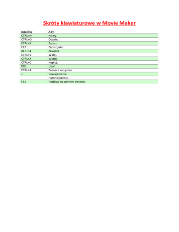Skróty klawiaturowe w Movie Maker Naciśnij CTRL+N CTRL+O CTRL+S F12 ALT+F4 CTRL+V CTRL+X CTRL+C DEL CTRL+A + F11 Aby Nowy. Otwórz. Zapisz. Zapisz jako. Zakończ. Wklej. Wytnij. Kopiuj. Usuń. Zaznacz wszystko. Powiększenie. Pomniejszenie. Podgląd na pełnym ekranie.