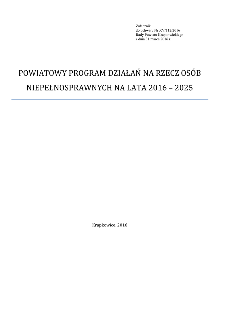 Załącznik do uchwały Nr XV/112/2016 Rady Powiatu Krapkowickiego z dnia 31 marca 2016 r. POWIATOWY PROGRAM DZIAŁAŃ NA RZECZ OSÓB NIEPEŁNOSPRAWNYCH NA LATA 2016 – 2025 Krapkowice, 2016 Spis treści WPROWADZENIE...................................................................................................................................................... 5 1. ................................................................................................................................................ C harakterystyka osób niepełnosprawnych ........................................................................................6 2. ................................................................................................................................................ O rzecznictwo ................................................................ ................................................................................................ ................................................................................................ ...................................................................... ...................................... 7 3. ................................................................................................................................................ D ziałania na rzecz osób niepełnosprawnych w ramach rehabilitacji społecznej.............. .............. 11 3.1. Dofinansowanie uczestnictwa osób niepełnosprawnych i ich opiekunów w turnusach rehabilitacyjnych ........................................................................................................................................... 13 3.2. Dofinansowanie sportu, kultury, rekreacji i turystyki osób niepełnosprawnych ................. 15 3.3. Dofinansowanie zaopatrzenia w sprzęt rehabilitacyjny, przedmioty ortopedyczne i środki pomocnicze ...................................................................................................................................................... 16 3.4. Dofinansowanie likwidacji barier architektonicznych, w komunikowaniu się i technicznych w związku z indywidualnymi potrzebami osób niepełnosprawnych ........... 18 4. ................................................................................................................................................ D ziałania na rzecz osób niepełnosprawnych w ramach rehabilitacji zawodowej ............ 19 4.1. Oferty pracy dla osób niepełnosprawnych zgłaszane przez pracodawców .......................... 24 4.2. Usługi oraz instrumenty oferowane bezrobotnym osobom niepełnosprawnym i poszukującym pracy ................................................................ ................................................................................................ ...................................................................................... ...................................................... 25 5. ................................................................................................................................................ J ednostki organizacyjne samorządu terytorialnego działające na rzecz osób niepełnosprawnych ................................................................ ................................................................................................ ..................................................................................... ..................................................... 27 5.1. Warsztat terapii zajęciowej ....................................................................................................................... 27 5.2. Dom Pomocy Społecznej „ANNA” w Krapkowicach oraz Dom Spokojnej Starości „św. Barbara” w Kamionku ........................................................................................................................ 29 5.3. Dom Dziennego Pobytu „Stokrotka”, Dom Dziennego Pobytu „Jarzębina” w Zdzieszowicach oraz Dom Dziennego Pobytu przy Ośrodku Pomocy Społecznej w Krapkowicach ................................................................ ................................................................................................ ................................................................................................ ................................................................ 31 5.4. Środowiskowy Dom Samopomocy w Krapkowicach ............................................................ ............................................................ 31 5.5. Zakład Opiekuńczo-Lecznicy w Górażdżach ................................................................ ........................................................................ ........................................ 31 6. ................................................................................................................................................ O rganizacje pozarządowe działające na rzecz osób niepełnosprawnych .......................... 32 6.1. Opolskie Stowarzyszenie na Rzecz Niepełnosprawnych w tym Rodzin i Osób z Chorobą Alzheimera w Krapkowicach ................................................................ ................................................................................................ .......................................................................... .......................................... 32 6.2. Polski Związek Niewidomych koło w Krapkowicach ................................................................ .................................................................. .................................. 33 6.3. Polski Związek Emerytów, Rencistów i Inwalidów Oddział Rejonowy w Krapkowicach .... 33 6.4. Caritas Diecezji Opolskiej Organizacja Pożytku Publicznego ................................................... ................................................... 33 6.5. Stowarzyszenie Os