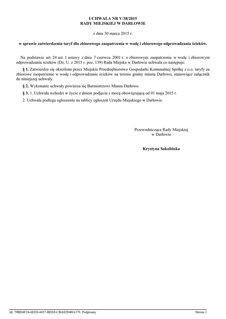 UCHWAŁA NR V/38/2015 RADY MIEJSKIEJ W DARŁOWIE z dnia 30 marca 2015 r. w sprawie zatwierdzenia taryf dla zbiorowego zaopatrzenia w wodę i zbiorowego odprowadzania ścieków. Na podstawie art. 24 ust. 1 ustawy z dnia 7 czerwca 2001 r. o zbiorowym zaopatrzeniu w wodę i zbiorowym odprowadzaniu ścieków (Dz. U. z 2015 r. poz. 139) Rada Miejska w Darłowie uchwala co następuje: § 1. Zatwierdza się określone przez Miejskie Przedsiębiorstwo Gospodarki Komunalnej Spółkę z o.o. taryfy za zbiorowe zaopatrzenie w wodę i odprowadzanie ścieków na terenie gminy miasta Darłowo, stanowiące załącznik do niniejszej uchwały. § 2. Wykonanie uchwały powierza się Burmistrzowi Miasta Darłowo. § 3. 1. Uchwała wchodzi w życie z dniem podjęcia z mocą obowiązującą od 01 maja 2015 r. 2. Uchwała podlega ogłoszeniu na tablicy ogłoszeń Urzędu Miejskiego w Darłowie. Przewodnicząca Rady Miejskiej w Darłowie Krystyna Sokolińska Id: 79BD4F24-6EE0-4457-BEE0-CBA02D40A379. Podpisany Strona 1 Załącznik do Uchwały Nr V/38/2015 Rady Miejskiej w Darłowie z dnia 30 marca 2015 r. TARYFA DLA ZBIOROWEGO ZAOPATRZENIA W WODĘ I ZBIOROWEGO ODPROWADZANIA ŚCIEKÓW obowiązująca na terenie Gminy Miasto Darłowo od dnia 1 maja 2015 r. do dnia 30 kwietnia 2016 r. 1. Informacje ogólne Niniejsza taryfa stanowi zestawienie cen za zbiorowe zaopatrzenie w wodę i zbiorowe odprowadzanie ścieków oraz określa warunki ich stosowania obowiązujące na terenie Gminy Miasta Darłowo na okres 12 miesięcy od dnia 1 maja 2015 do dnia 30 kwietnia 2016. Podstawę prawną opracowania taryfy stanowią: · ustawa z dnia 7 czerwca 2001 r. o zbiorowym zaopatrzeniu w wodę i zbiorowym odprowadzaniu ścieków (Dz. U. z 2006 r. Nr 123 poz. 858, z późn. zm.), zwana dalej Ustawą · rozporządzenie Ministra Budownictwa z dnia 28 czerwca 2006 r. w sprawie określania taryf, wzoru wniosku o zatwierdzenie taryf oraz warunków rozliczeń za zbiorowe zaopatrzenie w wodę i zbiorowe odprowadzanie ścieków (D.U. Nr 127, poz.886), zwane dalej Rozporządzeniem Taryfowe ceny oraz stawki opłaty abonamentowej dotyczą Odbiorców usług w zakresie zbiorowego zaopatrzenia w wodę oraz zbiorowego odprowadzanie ścieków realizowanego przez Miejskie Przedsiębiorstwo Gospodarki Komunalnej Spółka z o.o. w Darłowie. 2. Rodzaj prowadzonej działalności Przedmiotem działania Przedsiębiorstwa w zakresie zbiorowego zaopatrzenia w wodę i zbiorowego odprowadzania ścieków jest: - pobór wody z ujęć wodnych i jej uzdatnianie, - dostarczanie wody, - odbiór ścieków, - oczyszczenie ścieków w miejskiej oczyszczalni. 3. Taryfowe grupy odbiorców usług 3.1 W zakresie zbiorowego zaopatrzenia w wodę wyłoniono trzy podstawowe grupy odbiorców usług: · Grupa 1 - odbiorcy indywidualni (ludność i cele socjalno-bytowe), · Grupa 2 - odbiorcy pozostali (podmioty gospodarcze). · Grupa 3 – odbiorcy nie posiadających wodomierzy 3.2 W zakresie odprowadzania ścieków wyłoniono trzy podstawowe grupy taryfowe odbiorców usług: · Grupa 1 - odbiorcy indywidualni (ludność i cele socjalno-bytowe), · Grupa 2 - odbiorcy pozostali (podmioty gospodarcze). · Grupa 3 - odbiorcy nie posiadający urządzeń do pomiaru ilości odprowadzanych ścieków oraz wodomierzy. 4. Rodzaje i wysokości cen i stawek opłat 4.1 Przy rozliczeniach za dostarczoną wodę dla odbiorców usług obowiązuje taryfa wieloczłonowa składająca się: Id: 79BD4F24-6EE0-4457-BEE0-CBA02D40A379. Podpisany Strona 1 - z ceny wyrażonej w złotych za m3 dostarczonej wody oraz stawki opłaty abonamentowej, niezależnej od ilości dostarczonej wody – płaconej za każdy miesiąc bez względu na rozmiary dokonanego poboru wody lub też jego całkowitego braku. Stawka opłaty abonamentowej jest wyrażona w złotych na miesiąc na osobę w przypadku braku wodomierza bądź w zależności od liczby posiadanych wodomierzy w lokalu w pozostałych przypadkach. 4.2 W zakresie zbiorowego odprowadzania ścieków ma zastosowanie taryfa wieloczłonowa składająca się z: - ceny za odprowadzone ścieki wyrażonej w złotych za m3 i opłaty abonamentowej pobieranej za okres rozliczeniowy, - opłat zmiennych za przekroczenie warunków wprowadzania ścieków przemysłowych do urządzeń kanalizacyjnych. 4.3 Ceny za dostarczoną wodę Ustala się ceny za dostarczanie wody dla poszczególnych grup taryfowych: Grupa odbiorców Grupa 1 Grupa 2 Grupa 3 Jednostka miary zł/m3 zł/m3 zł/m3 Cena netto 3,54 3,54 3,54 Ustala się stawki opłat abonamentowych dla poszczególnych grup taryfowych: Grupa odbiorców Grupa 1; Grupa 2 Grupa 3 Jednostka miary (zł/miesiąc/licznik) zł/osoba/m-c Cena netto 5,00 9,90 4.4 Ceny za odprowadzone ścieki Ustala się ceny za zrzut ścieków dla poszczególnych grup taryfowych: Grupa odbiorców Grupa 1 Grupa 2 Grupa 3 Jednostka miary zł/m3 zł/m3 zł/m3 Cena netto 5,76 5,76 5,76 Ustala się stawki opłat abonamentowych dla poszczególnych grup taryfowych: Grupa odbiorców Grupa 3 Jednostka miary (zł/miesiąc/osoba) Cena netto 12,10 4.5 Do cen i stawek opłat opisanych powyżej dolicza się podatek od towarów i usług, zgodnie z § 2 pkt 9 - 11- rozporządzenie Ministra Budownictwa z dnia 28 czerwca 2006 r. w sprawie określania taryf, wzoru wniosku o zatwierdzenie taryf oraz warunków rozliczeń za zbiorowe zaopatrzenie w wodę i zbiorowe odprowadzanie ścieków (D.U. Nr 127, poz.886 4.6 Stawki opłat zmiennych za przekroczenie warunków wprowadzania ścieków przemysłowych do urządzeń kanalizacyjnych. I – Tabele opłat zmiennych Tabela 1 - opłata zmienna 0,00 zł. dla ścieków o parametrach nie przekraczających żadnego z poniższych wskaźników Wskaźnik BZT5 ChZT z Cr Zawiesiny og. Zawiesiny łatwo opadające Przewodność elektryczna właśc. (25°C) Odczyn Azot amonowy Azot ogólny Jednostka mg O2 /dm3 mg O2 /dm3 mg /dm3 cm3 /dm3 μS/ cm PH mg NNH4 /dm3 mg N /dm3 Id: 79BD4F24-6EE0-4457-BEE0-CBA02D40A379. Podpisany Wielkość nie więcej