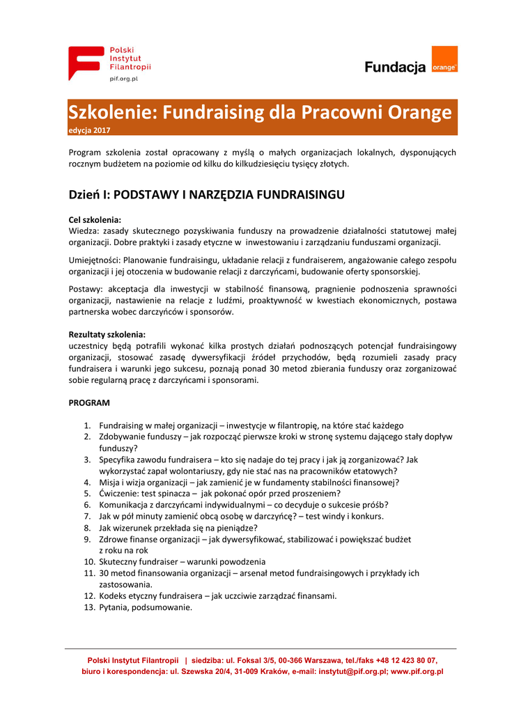 Szkolenie: Fundraising dla Pracowni Orange edycja 2017 Program szkolenia został opracowany z myślą o małych organizacjach lokalnych, dysponujących rocznym budżetem na poziomie od kilku do kilkudziesięciu tysięcy złotych. Dzień I: PODSTAWY I NARZĘDZIA FUNDRAISINGU Cel szkolenia: Wiedza: zasady skutecznego pozyskiwania funduszy na prowadzenie działalności statutowej małej organizacji. Dobre praktyki i zasady etyczne w inwestowaniu i zarządzaniu funduszami organizacji. Umiejętności: Planowanie fundraisingu, układanie relacji z fundraiserem, angażowanie całego zespołu organizacji i jej otoczenia w budowanie relacji z darczyńcami, budowanie oferty sponsorskiej. Postawy: akceptacja dla inwestycji w stabilność finansową, pragnienie podnoszenia sprawności organizacji, nastawienie na relacje z ludźmi, proaktywność w kwestiach ekonomicznych, postawa partnerska wobec darczyńców i sponsorów. Rezultaty szkolenia: uczestnicy będą potrafili wykonać kilka prostych działań podnoszących potencjał fundraisingowy organizacji, stosować zasadę dywersyfikacji źródeł przychodów, będą rozumieli zasady pracy fundraisera i warunki jego sukcesu, poznają ponad 30 metod zbierania funduszy oraz zorganizować sobie regularną pracę z darczyńcami i sponsorami. PROGRAM 1. Fundraising w małej organizacji – inwestycje w filantropię, na które stać każdego 2. Zdobywanie funduszy – jak rozpocząć pierwsze kroki w stronę systemu dającego stały dopływ funduszy? 3. Specyfika zawodu fundraisera – kto się nadaje do tej pracy i jak ją zorganizować? Jak wykorzystać zapał wolontariuszy, gdy nie stać nas na pracowników etatowych? 4. Misja i wizja organizacji – jak zamienić je w fundamenty stabilności finansowej? 5. Ćwiczenie: test spinacza – jak pokonać opór przed proszeniem? 6. Komunikacja z darczyńcami indywidualnymi – co decyduje o sukcesie próśb? 7. Jak w pół minuty zamienić obcą osobę w darczyńcę? – test windy i konkurs. 8. Jak wizerunek przekłada się na pieniądze? 9. Zdrowe finanse organizacji – jak dywersyfikować, stabilizować i powiększać budżet z roku na rok 10. Skuteczny fundraiser – warunki powodzenia 11. 30 metod finansowania organizacji – arsenał metod fundraisingowych i przykłady ich zastosowania. 12. Kodeks etyczny fundraisera – jak uczciwie zarządzać finansami. 13. Pytania, podsumowanie. Polski Instytut Filantropii | siedziba: ul. Foksal 3/5, 00-366 Warszawa, tel./faks +48 12 423 80 07, biuro i korespondencja: ul. Szewska 20/4, 31-009 Kraków, e-mail: [email protected]; www.pif.org.pl Dzień 2: KAMPANIE FUNDRAISINGOWE I WARSZTAT KOMUNIKACJI Z DARCZYŃCAMI Cele szkolenia: Uczestnicy poznają zasady planowania i realizacji kampanii zbierania funduszy. Nauczą się pozyskiwać sponsorów w środowisku lokalnym oraz budowania z nimi trwałych i etycznych relacji opartych na obustronnym zaangażowaniu. Znajomość zasad komunikacji ze firmami (telefon, rozmowa, korespondencja), nauczenie uczestników zasad konstruowania dobrych ofert, zapoznanie uczestników z najlepszymi wzorami współpracy ze sponsorami. Prezentacja narzędzi do wzmacniania relacji z darczyńcami. Organizacje przygotowujące się do udziału w kampanii Kilometry Dobra poznają specyfikę jej działania oraz zasady organizowania zbiórek i finału, które prowadzą do zwiększenia wyniku. Rezultaty: Uczestnicy będą potrafili stworzyć plan kampanii fundraisingowej, zastosować kryteria wyboru potencjalnych sponsorów i przygotować dla nich ofertę. Nauczą się panowania nad stresem w kontakcie osobistym, prowadzenia rozmów i zawierania partnerstw oraz podtrzymywania i pogłębiania relacji z firmami. Program: 1. Kampania fundraisingowa – od pomysłu do pieniędzy. 2. Narzędzia wspomagające prowadzenie kampanii. 3. Kampania „Kilometry Dobra” – doświadczenia z 3 edycji, metody zwiększania wyniku. 4. Kim są sponsorzy i czego oczekują – jak uniknąć próśb skazanych na niepowodzenie i działać skutecznie? 5. Zanim zaczniesz prosić – przygotowania do składania ofert 6. Portale społecznościowe i biznesowe jako źródło wiedzy o sponsorach 7. Co powinna zawierać oferta współpracy? 8. Miniwarsztat 1:jak umówić się na spotkanie – rozmowa telefoniczna 9. Miniwarsztat 2: idziemy po pieniądze! – rozmowa w gabinecie 10. Pytania i odpowiedzi Wszyscy absolwenci otrzymują zaświadczenie o ukończeniu szkolenia sygnowane przez Polski Instytut Filantropii. O trenerze Robert Kawałko – absolwent Uniwersytetu Jagiellońskiego oraz stypendysta Uniwersytetu Fryburskiego w Szwajcarii. Kierował działami marketingu kolejno w dwóch firmach z branży IT, a od 2001 był fundraiserem w organizacjach pozarządowych. Prowadzi także firmę doradczą specjalizującą się w PR, fundraisingu, szkoleniach i doradzaniu organizacjom. Zainicjował powstanie Polskiego Stowarzyszenia Fundraisingu, którego był prezesem zarządu w latach 2006-2012, a następnie wiceprezesem. W latach 2007 - 2013 pełnił funkcję wiceprezesa Europejskiego Stowarzyszenia Fundraisingu, gdzie odpowiadał za rozwój nowych organizacji fundraiserów w Europie. Współtworzył wiele kampanii dobroczynnych i doradzał przy ich wdrażaniu. Wykładał na konferencjach m.in. w Czechach, na Słowacji, na Ukrainie, w Holandii, Japonii, Gruzji i na Węgrzech. Od 2011 roku jest wykładowcą Uniwersytetu Papieskiego Jana Pawła II w Krakowie. Doradza działom FR w kilku organizacjach pozarządowych. Jest autorem licznych publikacji na temat fundraisingu i zarządzania organizacjami. Od 2015 r. kieruje założoną przez siebie Fundacją Polski Instytut Filantropii, która prowadzi ogólnopolskie kampanie filantropijne "Kilometry Dobra" i "Dobry Testament". Polski Instytut Filantropii | siedziba: ul. Foksal 3/5, 00-366 Warszawa, tel./faks +48 12 423 80 07, biuro i korespondencja: ul. Szewska 20/4, 31-009 Kraków, e-mail: [email protected]; www.pif.org.pl