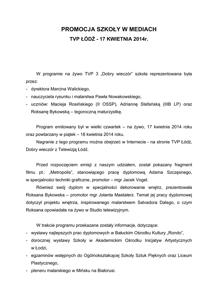 PROMOCJA SZKOŁY W MEDIACH TVP ŁÓDŹ - 17 KWIETNIA 2014r. W programie na Ŝywo TVP 3 „Dobry wieczór” szkoła reprezentowana była przez: - dyrektora Marcina Walickiego, - nauczyciela rysunku i malarstwa Pawła Nowakowskiego, - uczniów: Macieja Rosińskiego (II OSSP), Adriannę Stefańską (IIIB LP) oraz Roksanę Bykowską – tegoroczną maturzystkę. Program emitowany był w wielki czwartek – na Ŝywo, 17 kwietnia 2014 roku oraz powtarzany w piątek – 18 kwietnia 2014 roku. Nagranie z tego programu moŜna obejrzeć w Internecie - na stronie TVP Łódź, Dobry wieczór z Telewizją Łódź. Przed rozpoczęciem emisji z naszym udziałem, został pokazany fragment filmu pt.: „Metropolis”, stanowiącego pracę dyplomową Adama Szczęsnego, w specjalności techniki graficzne, promotor – mgr Jacek Vogel. RównieŜ swój dyplom w specjalności dekorowanie wnętrz, prezentowała Roksana Bykowska – promotor mgr Jolanta Mastalerz. Temat jej pracy dyplomowej dotyczył projektu wnętrza, inspirowanego malarstwem Salvadora Dalego, o czym Roksana opowiadała na Ŝywo w Studio telewizyjnym. W trakcie programu przekazane zostały informacje, dotyczące: - wystawy najlepszych prac dyplomowych w Bałuckim Ośrodku Kultury „Rondo”, - dorocznej wystawy Szkoły w Akademickim Ośrodku Inicjatyw Artystycznych w Łodzi, - egzaminów wstępnych do Ogólnokształcącej Szkoły Sztuk Pięknych oraz Liceum Plastycznego, - pleneru malarskiego w Mińsku na Białorusi. Warto podkreślić, Ŝe był to wyjątkowy program, w którym mogliśmy uczestniczyć. W tak krótkim czasie antenowym, zaprezentowane zostały waŜne wydarzenia artystyczne, ubarwione materiałem filmowym i fotograficznym, dające obraz działalności artystycznej szkoły. W programie „Dobry Wieczór z Telewizją Łódź” uczestniczył równieŜ Adam Radoń, absolwent naszej szkoły – obecnie Dyrektor Międzynarodowego Festiwalu Komiksu i Gier „Contur”– współorganizator oraz przewodniczący festiwalu – ŁDK. Stowarzyszenia Kawaler orderu Twórców Leopolda II – przyznanego w Belgii - to właśnie wydarzenie było powodem zaproszenia Adama Radonia do Studia TVP Łódź. Na koniec rozmowy z Panią redaktor Adam odniósł się pozytywnie do swojej byłej szkoły plastycznej, chwaląc ją i zapraszając do nauki w jej murach, bo on jest z niej dumny. Powiedział to jako absolwent, a nam było miło słyszeć te słowa i za to mu dziękujemy. Szczególne podziękowania składamy Pani red. Monice Kamińskiej oraz Pani red. Magdzie Libiszewskiej, za zaangaŜowanie i realizacje wielu programów związanych z wydarzeniami artystycznymi naszej szkoły. Paweł Nowakowski