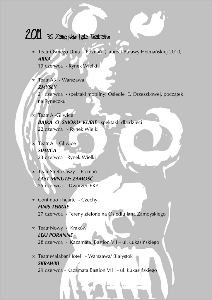 2011 36 Zamojskie Lato Teatralne • Teatr Ósmego Dnia - Poznań ( laureat Buławy Hetmańskiej 2010) ARKA 19 czerwca - Rynek Wielki • Teatr A3 - Warszawa ZMYSŁY 21 czerwca - spektakl mobilny: Osiedle E. Orzeszkowej, początek na Ryneczku • Teatr A -Gliwice BAJKA O SMOKU KUBIE spektakl dla dzieci 22 czerwca - Rynek Wielki • Teatr A - Gliwice SIEWCA 23 czerwca - Rynek Wielki • Teatr Strefa Ciszy - Poznań LAST MINUTE: ZAMOŚĆ 25 czerwca - Dworzec PKP • Continuo Thearte - Czechy FINIS TERRAE 27 czerwca - Tereny zielone na Osiedlu Jana Zamoyskiego • Teatr Nowy - Kraków LĘKI PORANNE 28 czerwca - Kazamata Bastion VII – ul. Łukasińskiego • Teatr Malabar Hotel - Warszawa/ Białystok SKRAWKI 29 czerwca - Kazamata Bastion VII - ul. Łukasińskiego • Beata Ścibakówna, Rafał Królikowski HIPNOZA 1 lipca - Zamojski Dom Kultury • Teatr im. Andersena - Lublin TRZEJ MUSZKIETEROWIE 3 lipca - Rynek Wielki Imprezy towarzyszące • Grupa Utopia – pokaz 19 czerwca - Rynek Wielki • Gimnazjum nr 1 w Zamościu Dlatego święty 20 czerwca - scena na Rynku Wielkim • Gimnazjum nr 2 w Zamościu Nie jesteś sam 20 czerwca - scena na Rynku Wielkim PRZEGLĄD DOROBKU TEATRU TELEWIZJI • Rosyjskie konfitury 21 czerwca CKF „Stylowy” • Czarnobyl - Cztery dni w kwietniu 22 czerwca CKF Stylowy 7 Zamojskie Spotkania Wokalne „piosenka w teatralnej masce” • koncert konkursowy • 200 procent kobiecości czyli piękniejsza strona musicalu - Aurelia Luśnia i Anna Ozner 24 czerwca Corner Pub Szkoła Aktorska Haliny i Jana Machulskich • Koncert piosenki aktorskiej - 24 czerwca Corner Pub Teatr Niekonsekwencji - T. Różewicz reżyseria: Zdzisław Wardejn 25 czerwca Kazamata Bastion I - ul. Bazyliańska 36 • Inspektor Psina - P. Gripari (spektakl dla dzieci) reżyseria: Elżbieta Socha 26 czerwca Kazamata Bastion I - ul. Bazyliańska 36 • Jak wam się podoba - W. Szekspir reżyseria: Szczepan Szczykno 26 czerwca Rynek Wielki • Letnie Spotkanie Muzyczno - Poetyckie muzyka: K. i P. Stopa, K. Wach, poezja: Agnieszka Władyczuk, otwarcie wystawy pasteli Łąka Elżbiety Gnyp 30 czerwca Corner Pub • Fundacja Kresy 2000 – Drzewo reżyseria: Stefan Szmidt 2 lipca Zespół Staromiejski ul. Kościuszki Koncert Wojciecha Grabka – Artysty okrzykniętego muzycznym wydarzeniem roku 1 lipca OWCA CAŁA Wege Bar Galeria • • Wystawa plenerowa: Zamojskie Lato Teatralne 2010 w Obiektywie Pracowni Fotograficznej Negatyw 19 czerwca – 3 lipca ulica Grodzka