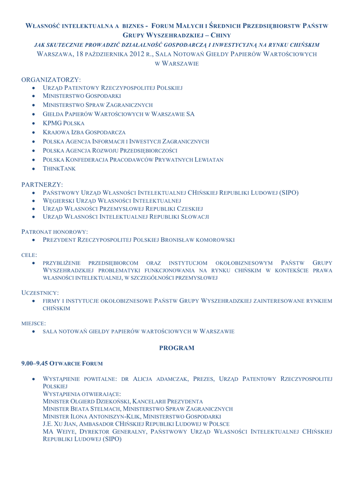WŁASNOŚĆ INTELEKTUALNA A - FORUM MAŁYCH I ŚREDNICH PRZEDSIĘBIORSTW PAŃSTW GRUPY WYSZEHRADZKIEJ – CHINY BIZNES JAK SKUTECZNIE PROWADZIĆ DZIAŁALNOŚĆ GOSPODARCZĄ I INWESTYCYJNĄ NA RYNKU CHIŃSKIM WARSZAWA, 18 PAŹDZIERNIKA 2012 R., SALA NOTOWAŃ GIEŁDY PAPIERÓW WARTOŚCIOWYCH W W ARSZAWIE ORGANIZATORZY: URZĄD P ATENTOWY RZECZYPOSPOLITEJ POLSKIEJ MINISTERSTWO GOSPODARKI MINISTERSTWO SPRAW ZAGRANICZNYCH GIEŁDA PAPIERÓW WARTOŚCIOWYCH W WARSZAWIE SA KPMG POLSKA KRAJOWA IZBA GOSPODARCZA POLSKA AGENCJA INFORMACJI I INWESTYCJI ZAGRANICZNYCH POLSKA AGENCJA ROZWOJU PRZEDSIĘBIORCZOŚCI POLSKA KONFEDERACJA PRACODAWCÓW PRYWATNYCH LEWIATAN THINKTANK PARTNERZY: PAŃSTWOWY URZĄD WŁASNOŚCI INTELEKTUALNEJ CHIŃSKIEJ REPUBLIKI L UDOWEJ (SIPO) WĘGIERSKI URZĄD WŁASNOŚCI INTELEKTUALNEJ URZĄD WŁASNOŚCI PRZEMYSŁOWEJ REPUBLIKI CZESKIEJ URZĄD WŁASNOŚCI INTELEKTUALNEJ REPUBLIKI S ŁOWACJI PATRONAT HONOROWY : PREZYDENT RZECZYPOSPOLITEJ POLSKIEJ BRONISŁAW KOMOROWSKI CELE : PRZYBLIŻENIE PRZEDSIĘBIORCOM ORAZ INSTYTUCJOM OKOŁOBIZNESOWYM P AŃSTW GRUPY WYSZEHRADZKIEJ PROBLEMATYKI FUNKCJONOWANIA NA RYNKU CHIŃSKIM W KONTEKŚCIE PRAWA WŁASNOŚCI INTELEKTUALNEJ, W SZCZEGÓLNOŚCI PRZEMYSŁOWEJ UCZESTNICY: FIRMY I INSTYTUCJE OKOŁOBIZNESOWE CHIŃSKIM P AŃSTW GRUPY WYSZEHRADZKIEJ ZAINTERESOWANE RYNKIEM MIEJSCE : SALA NOTOWAŃ GIEŁDY PAPIERÓW WARTOŚCIOWYCH W W ARSZAWIE PROGRAM 9.00–9.45 OTWARCIE FORUM WYSTĄPIENIE POWITALNE: DR ALICJA ADAMCZAK, PREZES, URZĄD PATENTOWY RZECZYPOSPOLITEJ POLSKIEJ WYSTĄPIENIA OTWIERAJĄCE: MINISTER OLGIERD DZIEKOŃSKI, KANCELARII PREZYDENTA MINISTER BEATA STELMACH, MINISTERSTWO SPRAW ZAGRANICZNYCH MINISTER ILONA ANTONISZYN-KLIK, MINISTERSTWO GOSPODARKI J.E. XU JIAN, AMBASADOR CHIŃSKIEJ REPUBLIKI LUDOWEJ W POLSCE MA WEIYE, DYREKTOR GENERALNY, P AŃSTWOWY URZĄD WŁASNOŚCI INTELEKTUALNEJ CHIŃSKIEJ REPUBLIKI LUDOWEJ (SIPO) 9.45–10.45 SESJA WPROWADZAJĄCA: CHINY – RYNEK WIELKICH SZANS. CO POWINNI WIEDZIEĆ PRZEDSIĘBIORCY (TŁO POLITYCZNO-SPOŁECZNO-KULTUROWE) WPROWADZENIE – PAWEŁ RABIEJ, THINKTANK DYSKUSJA PANELOWA: MAREK TIAN, PREZES FUNDACJI CHIŃSKO-POLSKIEJ WYMIANY GOSPODARCZEJ I KULTURALNEJ SINOPOL DR ZDZISŁAW GÓRALCZYK, B. AMBASADOR RZECZYPOSPOLITEJ POLSKIEJ W CHINACH BOŻENA LUBLIŃSKA-KASPRZAK, PREZES, POLSKA AGENCJA ROZWOJU PRZEDSIĘBIORCZOŚCI LIDIA ADAMSKA, CZŁONEK ZARZĄDU, GIEŁDA PAPIERÓW WARTOŚCIOWYCH W WARSZAWIE SA PRZEDSTAWICIEL JEDNEGO Z PAŃSTW GRUPY WYSZEHRADZKIEJ MODERATOR: DR MAŁGORZATA BONIKOWSKA, THINKTANK 10.45–11.15 PRZERWA KAWOWA 11.15–12.45 PANEL I P ROWADZENIE DZIAŁALNOŚCI GOSPODARCZEJ NA RYNKU CHIŃSKIM – SZANSE, WYZWANIA, ZAGROŻENIA ZARZĄDZANIE RYZYKIEM W PROWADZENIU DZIAŁALNOŚCI GOSPODARCZEJ , INWESTYCYJNEJ ORAZ BADAWCZO - ROZWOJOWEJ NA RYNKU CHIŃSKIM WPROWADZENIE: ANDRZEJ KACZMAREK, KPMG POLSKA DYSKUSJA PANELOWA: PRZEDSTAWICIEL IZBY GOSPODARCZEJ UNII E UROPEJSKIEJ W CHINACH PRZEDSTAWICIEL MINISTERSTWA GOSPODARKI ( DOŚWIADCZENIA PROGRAMU GO -CHINA) PRZEDSTAWICIELE FIRM Z CZECH, POLSKI, SŁOWACJI I WĘGIER INWESTUJĄCYCH NA RYNKU CHIŃSKIM (CASE S TUDY ) MODERATOR : ANDRZEJ KACZMAREK 12.45–13.15 PRZERWA KAWOWA 13.1 –14.15 PANEL II P ODSTAWY I ZASADY OCHRONY WŁASNOŚCI INTELEKTUALNEJ W CHINACH. MOŻLIWOŚCI EGZEKUCJI PRAW WYŁĄCZNYCH – POSTĘPOWANIE SĄDOWE , ARBITRAŻ, SŁUŻBY CELNE WPROWADZENIE: PROF. KRZYSZTOF KLINCEWICZ , UNIWERSYTET W ARSZAWSKI DYSKUSJA PANELOWA: PRZEDSTAWICIEL SIPO KANCELARIA BARTKOWIAK I YINGKE ( PARTNERSTWO POLSKO -CHIŃSKIE ) SŁAWOMIR M AJMAN, PREZES, POLSKA AGENCJA INFORMACJI I INWESTYCJI ZAGRANICZNYCH PRZEDSTAWICIEL KPMG CHINA MODERATOR : PROF. KRZYSZTOF K LINCEWICZ 14.15–14.30 PREZENTACJA CHINA IPR SME HELPDESK W CZYM MOŻE POMÓC CHINA IPR SME HELPDESK? BEATA S UWAŁA, IP E KSPERT, CHINA IPR SME HELPDESK 14.30–14.50 PODSUMOWANIE KONFERENCJI I REKOMENDACJE WYSTĄPIENIA: PREZESI URZĘDÓW WŁASNOŚCI INTELEKTUALNEJ Z PAŃSTW GRUPY WYSZEHRADZKIEJ ( DO UZGODNIENIA) PODSUMOWANIE KOŃCOWE : DR ALICJA ADAMCZAK, PREZES URZĄD P ATENTOWY RZECZYPOSPOLITEJ P OLSKIEJ 14.50–15.50 OBIAD I ROZMOWY KULUAROWE
