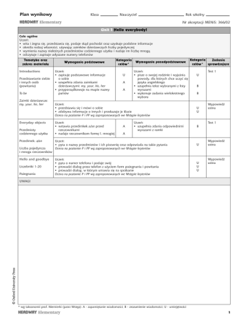 Plan wynikowy Klasa Nauczyciel HEADWAY Elementary Rok szkolny Nr akceptacji MENiS: 366/02 Unit 1 Hello everybody! Cele ogólne Uczeƒ: wita i ˝egna si´, przedstawia si´, podaje skàd pochodzi oraz uzyskuje podobne informacje okreÊla rodzaj w∏asnoÊci, u˝ywajàc zaimków dzier˝awczych liczby pojedynczej wymienia nazwy niektórych przedmiotów codziennego u˝ytku i nadaje im liczb´ mnogà odczytuje i zapisuje us∏yszane numery telefonów Tematyka oraz zakres materiału Introductions Przedstawianie siebie i innych osób (powitania) To be Zaimki dzier˝awcze: my, your, his, her Everyday objects Przedmioty codziennego u˝ytku Przedimek: a/an Liczba pojedyncza i mnoga rzeczowników Hello and goodbye Liczebniki 1-20 Po˝egnania Wymagania podstawowe Uczeƒ: zapisuje podstawowe informacje o sobie uzupe∏nia zdania zaimkami dzier˝awczymi: my, your, his, her przyporzàdkowuje na mapie nazwy paƒstw Kategoria celów* U A A Wymagania ponadpodstawowe Uczeƒ: pisze o swojej rodzinie i wyjaÊnia powody, dla których chce uczyç si´ j´zyka angielskiego uzupe∏nia tekst wybranymi z listy wyrazami wykonuje zadania wielokrotnego wyboru Uczeƒ: przedstawia si´ i mówi o sobie zdobywa informacje o innych i przekazuje je klasie Ocena na poziomie P i PP wg zaproponowanych we Wst´pie kryteriów Uczeƒ: wstawia przedimkek a /an przed rzeczownikami nadaje rzeczownikom form´ l. mnogiej A Uczeƒ: uzupe∏nia zdania odpowiednimi wyrazami z ramki Kategoria Zadania celów* sprawdzające Test 1 U B B U U Wypowiedê ustna Test 1 B A Uczeƒ: pyta o nazwy przedmiotów i ich pisowni´ oraz odpowiada na takie pytania Ocena na poziomie P i PP wg zaproponowanych we Wst´pie kryteriów U Uczeƒ: pyta o numer telefonu i podaje swój prowadzi dialog przez telefon z u˝yciem form po˝egnania i powitania prowadzi dialog, w którym umawia si´ na spotkanie Ocena na poziomie P i PP wg zaproponowanych we Wst´pie kryteriów U U U Wypowiedê ustna Wypowiedê ustna © Oxford University Press UWAGI * wg taksonomii prof. Niemierki (patrz Wst´p): A - zapami´tanie wiadomoÊci; B - zrozumienie wiadomoÊci; U - umiej´tnoÊci HEADWAY Elementary 1 Unit 2 Meeting people Cele ogólne Uczeƒ: zadaje i odpowiada na pytania dotyczàce danych osobowych okreÊla rodzaj w∏asnoÊci przy pomocy formy dzier˝awczej rzeczowników opowiada o swojej rodzinie opisuje ludzi i przedmioty Tematyka oraz zakres materiału Who is she? To be – present simple: pytania i odpowiedzi Wymagania podstawowe Uczeƒ: zapisuje odpowiedzi na pytania dotyczàce jego danych osobowych uzupe∏nia pytania do podanych odpowiedzi zaprzecza podanym stwierdzeniom dopasowuje odpowiedzi do odpowiednich pytaƒ Kategoria celów B Wymagania ponadpodstawowe Uczeƒ: wykonuje zadania wielokrotnego wyboru Zwiàzki rodzinne Forma dzier˝awcza ‘s Przymiotniki s∏u˝àce opisowi ludzi i przedmiotów In a café Pytanie how much? Uczeƒ: ocenia prawdziwoÊç zdaƒ na podstawie tekstu opisuje ludzi i przedmioty, wykorzystujàc podane przymiotniki B B U Uczeƒ: uzupe∏nia zdania w oparciu o drzewo genealogiczne U Test 2 B U U Uczeƒ: pisze o czyjejÊ rodzinie pisze list o swojej klasie Ocena na poziomie P i PP wg zaproponowanych we Wst´pie kryteriów U U Uczeƒ: uzupe∏nia zdania wyrazami z ramki dopasowuje zdj´cia do odpowiednich nazw Wypowiedê ustna B Uczeƒ: zadaje pytania na temat rodziny i odpowiada na takie pytania opowiada o swojej rodzinie Ocena na poziomie P i PP wg zaproponowanych we Wst´pie kryteriów Przyimki: in, with, at, on, of Liczebniki 1-100 Test 2 B B Uczeƒ: uzyskuje informacje dotyczàce danych osobowych innych osób i udziela odpowiedzi na takie pytania Ocena na poziomie P i PP wg zaproponowanych we Wst´pie kryteriów Patrick’s family Kategoria Zadania celów sprawdzające B A Uczeƒ: uzupe∏nia zdania przyimkami z podanej listy uzupe∏nia dialogi na podstawie wys∏uchanego tekstu Uczeƒ: odpowiada na pytania o cen´ i udziela odpowiedzi na takie pytania prowadzi dialog „w kawiarni” Ocena na poziomie P i PP wg zaproponowanych we Wst´pie kryteriów Wypowiedê ustna Wypowiedê pisemna Test 2 B B U U Wypowiedê ustna © Oxford University Press UWAGI HEADWAY Elementary 2 Unit 3 The world of work Cele ogólne Uczeƒ: wymienia nazwy niektórych zawodów i wyjaÊnia na czym polegajà pos∏uguje si´ zdaniami w 3 os. l. poj. w czasie present simple pyta o godzin´ i udziela odpowiedzi Tematyka oraz zakres materiału Wymagania podstawowe Kategoria celów Three jobs Uczeƒ: uzupe∏nia zdania formami 3 os. l. poj. Zawody podanych czasowników ocenia prawdziwoÊç zdaƒ Koƒcówka na podstawie tekstu czasowników tworzy pytania, wstawiajàc operator w 3 os. l. poj. does w czasie present simple uzupe∏nia zdania nazwami zawodów A U Wymagania ponadpodstawowe Uczeƒ: przekszta∏ca zdania twierdzàce na przeczàce i pytajàce wybiera poprawny przys∏ówek Test 3 B B A A Present simple: zdania twierdzàce, przeczàce i pytajàce Uczeƒ: zadaje pytania na temat przyjaciela lub cz∏onka rodziny i odpowiada na nie zadaje pytania na temat pracy i odpowiada na nie Ocena na poziomie P i PP wg zaproponowanych we Wst´pie kryteriów What time is it? Uczeƒ: zapisuje godziny zgodnie ze wskazaniami zegara Podawanie godziny Kategoria Zadania celów sprawdzające U U Wypowiedê ustna Test 3 A Uczeƒ: zadaje pytania o godzin´ i odpowiada na nie Ocena na poziomie P i PP wg zaproponowanych we Wst´pie kryteriów U Wypowiedê ustna © Oxford University Press UWAGI HEADWAY Elementary 3 Unit 4 Take it easy! Cele ogólne Uczeƒ: nazywa codzienne czynnoÊci nazywa czynnoÊci wykonywane w wolnym czasie okreÊla cz´stotliwoÊç przy pomocy przys∏ówków mówi o tym, co lubi robiç nazywa pory roku reaguje s∏ownie na codzienne sytuacje Tematyka oraz zakres materiału Weekdays and weekends CzynnoÊci codzienne Forma czasowników w 1 i 2 os. l. poj oraz w l. mnogiej w czasie present simple Wymagania podstawowe Uczeƒ: uzupe∏nia zdania wybranymi czasownikami w o