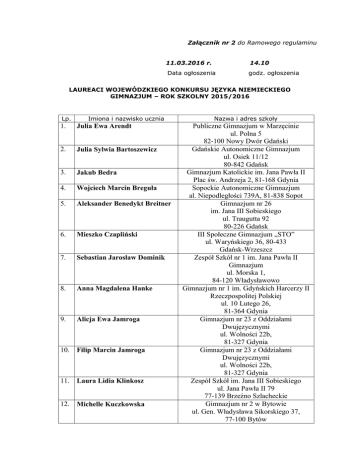 Załącznik nr 2 do Ramowego regulaminu 11.03.2016 r. 14.10 Data ogłoszenia godz. ogłoszenia LAUREACI WOJEWÓDZKIEGO KONKURSU JĘZYKA NIEMIECKIEGO GIMNAZJUM – ROK SZKOLNY 2015/2016 Lp. Imiona i nazwisko ucznia 1. Julia Ewa Arendt 2. Julia Sylwia Bartoszewicz 3. Jakub Bedra 4. Wojciech Marcin Breguła 5. Aleksander Benedykt Breitner 6. Mieszko Czapliński 7. Sebastian Jarosław Dominik 8. Anna Magdalena Hanke 9. Alicja Ewa Jamroga 10. Filip Marcin Jamroga 11. Laura Lidia Klinkosz 12. Michelle Kuczkowska Nazwa i adres szkoły Publiczne Gimnazjum w Marzęcinie ul. Polna 5 82-100 Nowy Dwór Gdański Gdańskie Autonomiczne Gimnazjum ul. Osiek 11/12 80-842 Gdańsk Gimnazjum Katolickie im. Jana Pawła II Plac św. Andrzeja 2, 81-168 Gdynia Sopockie Autonomiczne Gimnazjum al. Niepodległości 739A, 81-838 Sopot Gimnazjum nr 26 im. Jana III Sobieskiego ul. Traugutta 92 80-226 Gdańsk III Społeczne Gimnazjum „STO” ul. Waryńskiego 36, 80-433 Gdańsk-Wrzeszcz Zespół Szkół nr 1 im. Jana Pawła II Gimnazjum ul. Morska 1, 84-120 Władysławowo Gimnazjum nr 1 im. Gdyńskich Harcerzy II Rzeczpospolitej Polskiej ul. 10 Lutego 26, 81-364 Gdynia Gimnazjum nr 23 z Oddziałami Dwujęzycznymi ul. Wolności 22b, 81-327 Gdynia Gimnazjum nr 23 z Oddziałami Dwujęzycznymi ul. Wolności 22b, 81-327 Gdynia Zespół Szkół im. Jana III Sobieskiego ul. Jana Pawła II 79 77-139 Brzeźno Szlacheckie Gimnazjum nr 2 w Bytowie ul. Gen. Władysława Sikorskiego 37, 77-100 Bytów 13. Clara Leśniak 14. Agata Maria Maliszewska 15. Marta Franciszka Markowska 16. Marcin Marek Modrzejewski 17. Wojciech Hubert NawosWysocki 18. Kay Jeremy Piotrowski 19. Chantal Nami Sadowska 20. Kacper Jakub Stankiewicz 21. Alicja Anna Solecka 22. Luiza Magdalena Stadnik Gimnazjum nr 25 ul. Kościuszki 8b 80-451 Gdańsk Samorządowe Gimnazjum im. Jana Pawła II w Bolszewie ul. Leśna 35, 84-239 Bolszewo Publiczne Gimnazjum nr 3 im. Stanisława Staszica ul. 2 Pułku Szwoleżerów Rokitniańskich 4, 83-200 Starogard Gdański Gimnazjum nr 2 w Bytowie ul. Gen. Władysława Sikorskiego 37, 77-100 Bytów Społeczne Gimnazjum nr 1 Społecznego Towarzystwa Oświatowego ul. Banacha 10, 76-200 Słupsk Gimnazjum w Łęgu ul. Chojnicka 3, 89-652 Łąg Publiczne Gimnazjum nr 3 im. Stanisława Staszica ul. 2 Pułku Szwoleżerów Rokitniańskich 4, 83-200 Starogard Gdański Gimnazjum nr 3 im. Znaku Rodła ul. Kamienna 18, 82-500 Kwidzyn Gimnazjum nr 24 z Oddziałami Dwujęzycznymi ul. Legionów 27, 81-405 Gdynia Publiczne Katolickie Gimnazjum im. Św. Kazimierza ul. Pilotów 1, 80-460 Gdańsk Przewodnicząca WKKJN Ewa Felczak