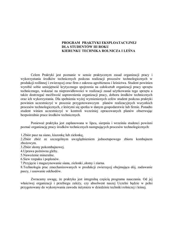 PROGRAM PRAKTYKI EKSPLOATACYJNEJ DLA STUDENTÓW III ROKU KIERUNKU TECHNIKA ROLNICZA I LEŚNA Celem Praktyki jest poznanie w sensie praktycznym zasad organizacji pracy i wykorzystania środków technicznych podczas realizacji procesów technologicznych w produkcji roślinnej i zwierzęcej oraz firm z zakresu agrobiznesu i leśnictwa. Student powinien wyrobić sobie umiejętność krytycznego spojrzenia na całokształt organizacji pracy sprzętu technicznego, wskazać na nieprawidłowości w realizacji zasad użytkowania tego sprzętu a także dostrzegać możliwość usprawnienia organizacji pracy, doboru środków technicznych oraz ich wykorzystania. Dla spełnienia wyżej wymienionych celów student podczas praktyki powinien uczestniczyć w procesie przygotowawczym planów realizacyjnych wszystkich procesów technologicznych, z którymi się spotka w danym gospodarstwie lub firmie. Ponadto student winien uczestniczyć w kontroli wcześniej opracowanych planów obserwując bezpośrednio prace środków technicznych. Ponieważ praktyka jest zaplanowana w lipcu, sierpniu i wrześniu studenci powinni poznać organizację pracy środków technicznych następujących procesów technologicznych: 1.Zbiór pasz na siano, kiszonkę lub zielonkę, 2.Zbiór zbóż ze szczególnym uwzględnieniem jednoetapowego zbioru kombajnem zbożowym. 3.Zbiór słomy pokombajnowej. 4.Uprawa pożniwna gleby. 5.Nawożenie mineralne. 6.Siew rzepaku i poplonów. 7.Przyjęcie i magazynowanie siana, zielonki ,słomy i ziarna. 8.Technologia prac zmechanizowanych w produkcji zwierzęcej obejmująca dój, zadawanie paszy, i usuwanie odchodów. Zwracamy uwagę, że praktyka jest integralną częścią programu nauczania. Od jej właściwej organizacji i przebiegu zależy, czy absolwent naszej Uczelni będzie w pełni przygotowany do wykonywania zawodu inżyniera w dziedzinie techniki rolniczej i leśnej.