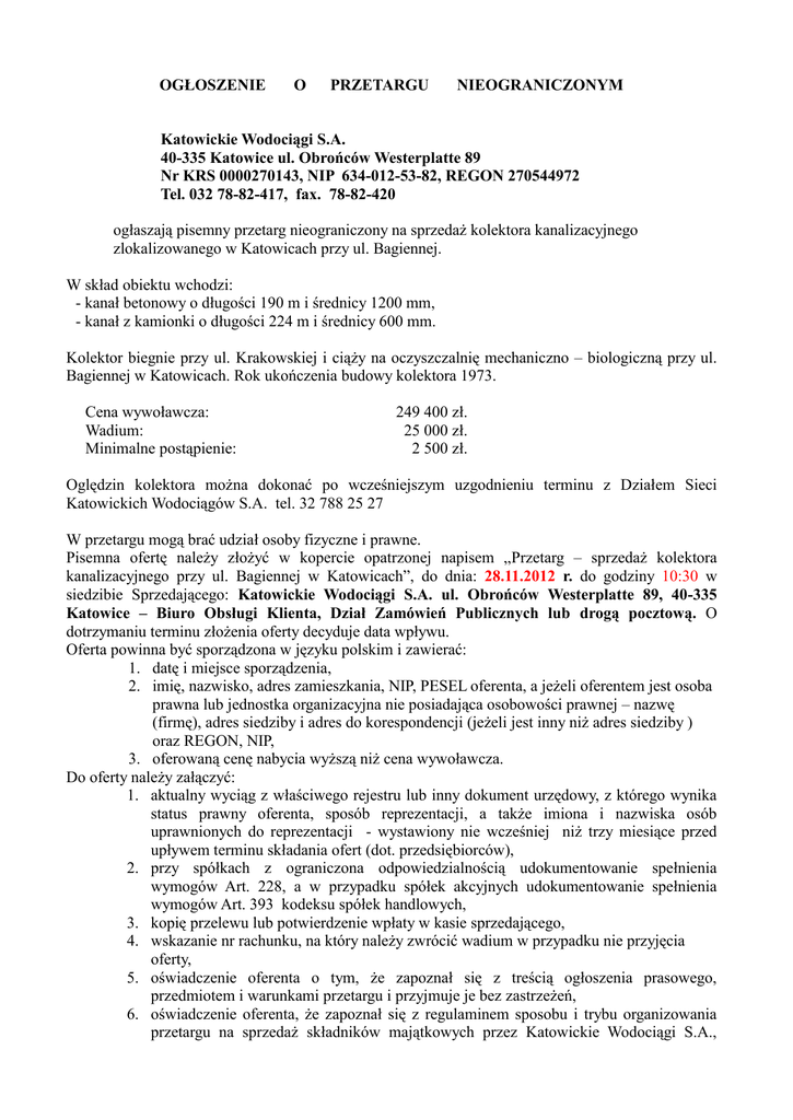 OGŁOSZENIE O PRZETARGU NIEOGRANICZONYM Katowickie Wodociągi S.A. 40-335 Katowice ul. Obrońców Westerplatte 89 Nr KRS 0000270143, NIP 634-012-53-82, REGON 270544972 Tel. 032 78-82-417, fax. 78-82-420 ogłaszają pisemny przetarg nieograniczony na sprzedaż kolektora kanalizacyjnego zlokalizowanego w Katowicach przy ul. Bagiennej. W skład obiektu wchodzi: - kanał betonowy o długości 190 m i średnicy 1200 mm, - kanał z kamionki o długości 224 m i średnicy 600 mm. Kolektor biegnie przy ul. Krakowskiej i ciąży na oczyszczalnię mechaniczno – biologiczną przy ul. Bagiennej w Katowicach. Rok ukończenia budowy kolektora 1973. Cena wywoławcza: Wadium: Minimalne postąpienie: 249 400 zł. 25 000 zł. 2 500 zł. Oględzin kolektora można dokonać po wcześniejszym uzgodnieniu terminu z Działem Sieci Katowickich Wodociągów S.A. tel. 32 788 25 27 W przetargu mogą brać udział osoby fizyczne i prawne. Pisemna ofertę należy złożyć w kopercie opatrzonej napisem „Przetarg – sprzedaż kolektora kanalizacyjnego przy ul. Bagiennej w Katowicach”, do dnia: 28.11.2012 r. do godziny 10:30 w siedzibie Sprzedającego: Katowickie Wodociągi S.A. ul. Obrońców Westerplatte 89, 40-335 Katowice – Biuro Obsługi Klienta, Dział Zamówień Publicznych lub drogą pocztową. O dotrzymaniu terminu złożenia oferty decyduje data wpływu. Oferta powinna być sporządzona w języku polskim i zawierać: 1. datę i miejsce sporządzenia, 2. imię, nazwisko, adres zamieszkania, NIP, PESEL oferenta, a jeżeli oferentem jest osoba prawna lub jednostka organizacyjna nie posiadająca osobowości prawnej – nazwę (firmę), adres siedziby i adres do korespondencji (jeżeli jest inny niż adres siedziby ) oraz REGON, NIP, 3. oferowaną cenę nabycia wyższą niż cena wywoławcza. Do oferty należy załączyć: 1. aktualny wyciąg z właściwego rejestru lub inny dokument urzędowy, z którego wynika status prawny oferenta, sposób reprezentacji, a także imiona i nazwiska osób uprawnionych do reprezentacji - wystawiony nie wcześniej niż trzy miesiące przed upływem terminu składania ofert (dot. przedsiębiorców), 2. przy spółkach z ograniczona odpowiedzialnością udokumentowanie spełnienia wymogów Art. 228, a w przypadku spółek akcyjnych udokumentowanie spełnienia wymogów Art. 393 kodeksu spółek handlowych, 3. kopię przelewu lub potwierdzenie wpłaty w kasie sprzedającego, 4. wskazanie nr rachunku, na który należy zwrócić wadium w przypadku nie przyjęcia oferty, 5. oświadczenie oferenta o tym, że zapoznał się z treścią ogłoszenia prasowego, przedmiotem i warunkami przetargu i przyjmuje je bez zastrzeżeń, 6. oświadczenie oferenta, że zapoznał się z regulaminem sposobu i trybu organizowania przetargu na sprzedaż składników majątkowych przez Katowickie Wodociągi S.A., który jest dostępny na stronie internetowej Katowickich Wodociągów S.A. http://www.wodociagi.katowice.pl w dziale aktualności, 7. oświadczenie oferenta, że zapoznał się z przedmiotem przetargu, jego stanem prawnym i nie wnosi do nich zastrzeżeń. Komisyjne otwarcie ofert nastąpi w siedzibie Katowickich Wodociągów S.A. w Katowicach ul. Obrońców Westerplatte 89, I piętro sala konferencyjna w dniu 28.11.2012 r. o godzinie 11:15. W razie stwierdzenia, iż kilku oferentów zaproponowało tę sama cenę, sprzedający przeprowadzi dodatkowy przetarg ustny w terminie przez siebie wskazanym. Wadium w formie pieniężnej należy wpłacić na konto bankowe Katowickich Wodociągów S.A.: ING Bank Śląski S.A. O/Regionalny Katowice nr 95 1050 1214 1000 0007 0005 3994 lub w kasie Sprzedającego do dnia 27.11.2012 r., z zaznaczeniem „Przetarg nieograniczony kolektor kanalizacyjny ul. Bagienna”. Za zachowanie terminu wpłaty wadium uważa się datę wpływu środków pieniężnych na rachunek Spółki. Sprzedający odrzuci ofertę złożoną przez uczestnika przetargu, który nie wniósł wadium lub wniósł je w niewłaściwej kwocie lub innej niż wskazana przez sprzedającego formie. Wpłacone wadium: - podlega zaliczeniu na poczet ceny nabycia zaoferowanej przez oferenta, który wygra przetarg, - przepada na rzecz sprzedającego, jeśli oferent, który wygra przetarg nie uiści ceny nabycia lub uchyli się od zawarcia umowy kupna-sprzedaży, - wpłacone przez pozostałych oferentów zostanie zwrócone 14 dni po ostatecznym rozstrzygnięciu przetargu. Oferent, którego oferta zostanie przyjęta jest zobowiązany do dokonania wpłaty pełnej ceny (pomniejszonej o wpłacone wadium) wynikającej z przetargu, w dniu zawarcia umowy kupna – sprzedaży. Wszelkie koszty związane z zawarciem umowy ponosi nabywca. Spółka zastrzega sobie prawo odstąpienia od przeprowadzenia przetargu lub unieważnienia przetargu dotyczącego zbycia przedmiotu sprzedaży bez podania przyczyny i ponoszenia jakichkolwiek skutków prawnych i finansowych.