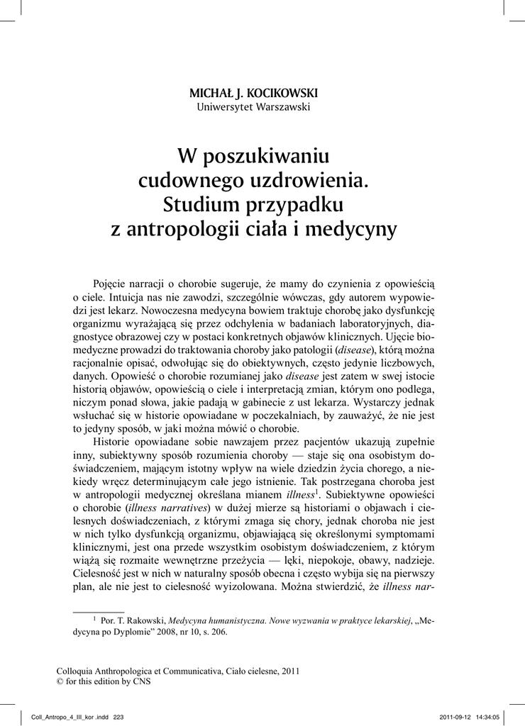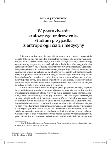 MICHA£ J. KOCIKOWSKI Uniwersytet Warszawski W poszukiwaniu cudownego uzdrowienia. Studium przypadku z antropologii cia³a i medycyny Pojęcie narracji o chorobie sugeruje, że mamy do czynienia z opowieścią o ciele. Intuicja nas nie zawodzi, szczególnie wówczas, gdy autorem wypowiedzi jest lekarz. Nowoczesna medycyna bowiem traktuje chorobę jako dysfunkcję organizmu wyrażającą się przez odchylenia w badaniach laboratoryjnych, diagnostyce obrazowej czy w postaci konkretnych objawów klinicznych. Ujęcie biomedyczne prowadzi do traktowania choroby jako patologii (disease), którą można racjonalnie opisać, odwołując się do obiektywnych, często jedynie liczbowych, danych. Opowieść o chorobie rozumianej jako disease jest zatem w swej istocie historią objawów, opowieścią o ciele i interpretacją zmian, którym ono podlega, niczym ponad słowa, jakie padają w gabinecie z ust lekarza. Wystarczy jednak wsłuchać się w historie opowiadane w poczekalniach, by zauważyć, że nie jest to jedyny sposób, w jaki można mówić o chorobie. Historie opowiadane sobie nawzajem przez pacjentów ukazują zupełnie inny, subiektywny sposób rozumienia choroby — staje się ona osobistym doświadczeniem, mającym istotny wpływ na wiele dziedzin życia chorego, a niekiedy wręcz determinującym całe jego istnienie. Tak postrzegana choroba jest w antropologii medycznej określana mianem illness1. Subiektywne opowieści o chorobie (illness narratives) w dużej mierze są historiami o objawach i cielesnych doświadczeniach, z którymi zmaga się chory, jednak choroba nie jest w nich tylko dysfunkcją organizmu, objawiającą się określonymi symptomami klinicznymi, jest ona przede wszystkim osobistym doświadczeniem, z którym wiążą się rozmaite wewnętrzne przeżycia — lęki, niepokoje, obawy, nadzieje. Cielesność jest w nich w naturalny sposób obecna i często wybija się na pierwszy plan, ale nie jest to cielesność wyizolowana. Można stwierdzić, że illness nar1 Por. T. Rakowski, Medycyna humanistyczna. Nowe wyzwania w praktyce lekarskiej, „Medycyna po Dyplomie” 2008, nr 10, s. 206. Colloquia Anthropologica et Communicativa, Ciało cielesne, 2011 © for this edition by CNS Coll_Antropo_4_III_kor .indd 223 2011-09-12 14:34:05 224 MICHA£ J. KOCIKOWSKI ratives są historiami opowiadanymi nie tylko o ciele, lecz także poprzez ciało2. Fizycznym dolegliwościom towarzyszą najczęściej rozmaite przemiany biograficzne i tożsamościowe, a konstruowanie narracji o doświadczeniu choroby staje się okazją, by doszły one do głosu. Ciało nie jest już tylko przedmiotem relacji, lecz również miejscem, z którego się mówi, oraz warunkiem snutej opowieści3. Mówiąc o ciele i przemianach, jakim ono podlega, chory daje jednocześnie wyraz swojej sytuacji egzystencjalnej. Wyjątkowo wyraźnie widać to w wypadku osób chorych, które poszukują bądź doświadczyły uzdrowienia poprzez modlitwę. W opowiadanych przez nich historiach można zauważyć, jak mocno powiązane są z sobą doświadczenie choroby fizycznej i nawrócenia czy duchowego rozwoju. Związek ten jest tak silny, że nie mogą opowiadać o swoich dolegliwościach w oderwaniu od przeżyć religijnych i odwrotnie — bez nawiązania do zdarzeń związanych z chorobą, a tym samym z ciałem, ich duchowa droga jest niezrozumiała. Niniejszy artykuł jest próbą analizy historii choroby i nawrócenia Joanny jako narracji opowiedzianej poprzez ciało. Moją rozmówczynię, trzydziestoośmioletnią kobietę cierpiącą na wirusowe zapalenie rdzenia kręgowego, poznałem w grudniu 2009 roku podczas mszy świętej z modlitwą o uzdrowienie odprawianej w jednym z warszawskich kościołów. Miesiąc później miałem okazję przeprowadzić z Joanną wywiad. W pierwszej części rozmowy byłem jedynie słuchaczem opowieści Joanny. Po wysłuchaniu historii poprosiłem o wyjaśnienie niezrozumiałych dla mnie wątków opowieści i odpowiedzenie na pytania z przygotowanego przeze mnie kwestionariusza4. Joanna nie stworzyła chronologicznej historii swojego życia. Opowieść rozpoczęła od najistotniejszego dla niej wydarzenia, jakim było jej nawrócenie. W trakcie rozmowy powracała do innych ważnych momentów. Z całości wywiadu udało mi się odtworzyć pewną linearną strukturę jej biografii, począwszy od momentu, kiedy poznała swojego męża. Miało to miejsce szesnaście lat temu. Po dwóch latach znajomości pobrali się. Dziesięć lat temu urodziła im się córka. Trzy miesiące po porodzie Joanna została nagle sparaliżowana poniżej ramion. Przykuta do łóżka spędziła pięć miesięcy w Instytucie Psychiatrii i Neurologii w Warszawie, będąc pod intensywną opieką lekarzy i rehabilitantów. Stwierdzono wirusowe zapalenie rdzenia kręgowego. Jej stan był początkowo bardzo 2 Por. A. Frank, The Wounded Storyteller. Body, Illness, and Ethics, Chicago-London 1997, s. 1–3. 3 Por. ibidem, s. 27. Moja rozmówczyni zgodziła się na wykonanie nagrania i transkrypcji naszej rozmowy, dlatego w miejscach, w których będę odwoływał się do jej słów, zamieszczam dosłowne fragmenty jej wypowiedzi. W nawiasach kwadratowych umieściłem własne dopowiedzenia i wyjaśnienia. W cudzysłów zostały ujęte nie tylko przytoczone fragmenty rozmowy, lecz również zwroty i sformułowania zapożyczone z wypowiedzi informatorki. 4 Colloquia Anthropologica et Communicativa, Ciało cielesne, 2011 © for this edition by CNS Coll_Antropo_4_III_kor .indd 224 2011-09-12 14:34:05 W poszukiwaniu cudownego uzdrowienia 225 ciężki, miała problemy z oddychaniem i często musiała leżeć podłączona do respiratora. Na szczęście objawy stopniowo ustępowały. Choć odzyskała władzę w rękach, wciąż musiała poruszać się na wózku inwalidzkim. Przez kolejne lata mieszkała z mężem i córką w domu teściów. Można powiedzieć, że zaakceptowała swój stan. Nauczyła się żyć na wózku i jednoc