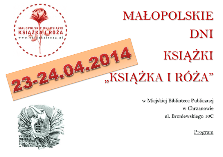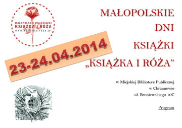 MAŁOPOLSKIE DNI KSIĄŻKI „KSIĄŻKA I RÓŻA” w Miejskiej Bibliotece Publicznej w Chrzanowie ul. Broniewskiego 10C Program MAŁOPOLSKIE DNI KSIĄŻKI KSIĄŻKA I RÓŻA (23-24.04.2014) ŚWIATOWY DZIEŃ KSIĄŻKI I PRAW AUTORSKICH (23.04.2014) 23.04.2014 Instalacja >Biblioteczna blondynka poleca KSIĄŻKĘ I RÓŻĘ< - otwarcie sezonu w Letniej Czytelni / plener przed biblioteką 23.04.2014, godz. 16.30 Mama, tata i ja … w bibliotece - grupa zabawowa / Oddział dla Dzieci 23.04.2014, godz. 11.00 Wernisaż wystawy Fotografia artystyczna – prace Dominiki Zięby, uczennicy II Liceum Ogólnokształcącego im. K.K. Baczyńskiego w Chrzanowie, MBP, Klub Literacki „Pod Muzami”, Chrzanów Al. Henryka 30 23.04.2014, godz. 15.00 Warsztaty komputerowe dla dorosłych – obsługa komputera od podstaw / MBP, Klub Biblioteczny Ostoja, Balin ul. Jaworznicka 45 23.04.2014, godz. 11.00 Yes, I can – warsztaty języka angielskiego dla seniorów / MBP, Klub Literacki Pod Muzami, Chrzanów Al. Henryka 30 24.04.2014, godz. 14.00 Język angielski od podstaw – warsztaty językowe dla maluchów: gramy w liczby i kolory, my body – moje ciało / MBP, Klub Biblioteczny Ostoja, Balin ul. Jaworznicka 45 24.04.2014, godz. 15.30 Język angielski od podstaw – warsztaty językowe dla dorosłych: człowiek – rozmówki sytuacyjne / MBP, Klub Biblioteczny Ostoja, Balin ul. Jaworznicka 45 23-24.04.2014 BOOKCROSSING – strefa wolnych książek KIERMASZ KSIĄŻKI za 1 zł. CZYTAM WIĘC JESTEM – serwis biblioteczno-literacki w Chrzanowskiej Telewizji Lokalnej promocja działań w mediach lokalnych, na portalach regionalnych i bibliotekarskich Nie ma solidarności bez miłości – wystawa fotografii Arturo Mari i Adama Bujaka, ze zbiorów Katolickiego Centrum Kultury w Krakowie / Hol biblioteki Eklektyczna podróż – fotografie Roberta Lichoty / Galeria wystawowa Fotografia artystyczna – wystawa prac Dominiki Zięby, uczennicy II Liceum Ogólnokształcącego im. K.K. Baczyńskiego w Chrzanowie / Klub Literacki Pod Muzami, Chrzanów Al. Henryka 30 Wydarzenie EXTRA ! Spotkanie autorskie z RÓŻĄ THUN, promocja książki RÓŻA, autorstwa Róży Thun i Joanny Gromek – Illg w ramach DKK – Dyskusyjnego Klubu Książki 23.04.2014, godz. 1800, Sala konferencyjno-szkoleniowa / Klub Literacki