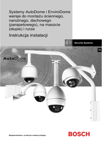 Systemy AutoDome i EnviroDome wersje do montażu ściennego, narożnego, dachowego (parapetowego), na maszcie (słupie) i rurze Instrukcja instalacji Security Systems Bezpieczeństwo, na którym możesz polegać PL 1. Przeczytać instrukcje - Wszystkie instrukcje bezpieczeństwa i obsługi należy uważnie przeczytać przed przystąpieniem do obsługi urządzenia. 2. Uwzględniać ostrzeżenia - Należy stosować się do wszystkich ostrzeżeń umieszczonych na urządzeniu oraz w instrukcji obsługi. 3. Połączenia - Nie wolno dokonywać dołączeń urządzenia w sposób nie zalecany przez producenta, gdyż mogą one spowodować uszkodzenie sprzętu. 4. Dodatkowe uwagi - Nie stawiać przyrządu na niestabilnych podstawach, trójnogach, wspornikach lub stojakach. Urządzenie może spaść powodując poważne obrażenia u osoby obsługującej oraz spowodować nieodwracalne uszkodzenie urządzenia. Należy używać tylko podstaw, trójnogów, wsporników lub mocowań zalecanych przez producenta lub tych, które zostały sprzedane wraz z produktem. Montaż urządzenia winien być przeprowadzony zgodnie z instrukcją producenta. Zestaw urządzeń instalowanych na wózku winien być przemieszczany ostrożnie. Nagłe zatrzymania, nadmierna siła i nierówne powierzchnie mogą spowodować przewrócenie się zestawu. 5. Zasilanie - Urządzenie może być zasilane tylko ze źródła napięcia, które wyszczególnia tabliczka znamionowa. W przypadku braku pewności odnośnie parametrów dysponowanego źródła zasilania, zaleca się kontakt ze sprzedawcą lub z zakładem energetycznym. Przy urządzeniach przeznaczonych do zasilania bateryjnego lub z innych źródeł należy postępować zgodnie z załączoną instrukcją. Urządzenie winno być izolowane galwanicznie od sieci energetycznej poprzez stosowanie źródła zasilania zgodnego z normą EN60950. Przykładem takich źródeł są zasilacze ENV-PSU lub ENV-PA1. 6. Doprowadzenie zasilania – System przeznaczony do montażu w przestrzeni otwartej nie powinien być instalowany w pobliżu napowietrznych linii energetycznych lub linii oświetleniowych, które mogłyby zewrzeć się z doprowadzeniem zasilania lub obwodami elektrycznymi tego systemu. Przy instalacjach w przestrzeni otwartej należy zachować szczególną ostrożność, gdyż dotknięcie linii energetycznej może być przyczyną porażania prądem elektrycznym. Modele przeznaczone dla USA p. NEC artykuł 820 – instalacja systemów CATV. Zalecenia użytkowe Zgodność z wymaganiami FCC i ICES Uwaga: Urządzenie poddano testom potwierdzającym zgodność z wymaganiami określonymi dla urządzenia cyfrowego klasy A, według Części 15 przepisów FCC i ICES-003. Wymagania te określają odpowiedni poziom zabezpieczenia przed szkodliwymi zakłóceniami, jeśli eksploatacja sprzętu odbywa się w pomieszczeniach biurowych. Urządzenie wytwarza i może promieniować fale o częstotliwościach radiowych dlatego jeśli nie jest zainstalowane i używane zgodnie z instrukcją obsługi, może powodować zakłócenia w łączności radiowej. Nie ma jednak gwarancji, że zakłócenia nie wystąpią w danej instalacji. W przypadku wystąpienia zakłóceń w odbiorze programów radiowych lub telewizyjnych, celu jego wyeliminowania należy zastosować się do zaleceń otrzymanych w punkcie sprzedaży lub od doświadczonego technika radiowego lub telewizyjnego. Nie należy wprowadzać jakichkolwiek zmian lub modyfikacji bez zgody upoważnionych podmiotów. Wszelkie zmiany lub modyfikacje mogą ograniczyć prawo użytkownika do użytkowania systemu. UWAGA! URZĄDZENIE KLASY A. W WARUNKACH DOMOWYCH URZĄDZENIE MOŻE POWODOWAĆ ZAKŁÓCENIA RADIOWE. W WYPADKU ICH WYSTĄPIENIA UŻYTKOWNIK MOŻE ZOSTAĆ ZOBOWIĄZANY DO ZLECENIA PRZEPROWADZENIA ODPOWIEDNICH POMIARÓW NA WŁASNY KOSZT. DODATKOWE INFORMACJE DOSTĘPNE SĄ W PRZEDSTAWICIELSTWIE BOSCH SECURITY SYSTEMS, TEL. 022 571 03 61 LUB NA NASZYCH STRONACH INTERNETOWYCH WWW.PHILIPSCSI.COM. 7. Naprawy - Nie należy dokonywać samodzielnych prób naprawy urządzenia, gdyż zdejmowanie pokrywy może narazić niefrasobliwego użytkownika na porażenie prądem elektrycznym lub inne poważne niebezpieczeństwa. Naprawa może być wykonywana tylko przez autoryzowany serwis. 8. Wymiana części - Jeśli potrzebne są części zamienne, należy upewnić się, że serwisant użył części wyspecyfikowanych przez producenta. Użycie innych części może spowodować pożar lub porażenie prądem elektrycznym. 9. Poprawność pracy - Po dokonaniu naprawy urządzenia przez serwis, należy zwrócić się do personelu o dokonanie sprawdzenia na miejscu poprawności jego działania. 10. Uziemienie – W przypadku dołączenia do urządzenia zewnętrznego systemu okablowania, sprawdzić jego uziemienie. 2003 Bosch Security Systems Strona 3 z 22 PL Ostrzeżenia UWAGA: ZE WZGLĘDU NA NIEBEZPIECZEŃSTWO PORAŻENIA PRĄDEM ELEKTRYCZNYM NIE OTWIERAĆ OBUDOWY URZĄDZENIA WEWNĄTRZ NIE MA ELEMENTÓW WYMAGAJĄCYCH REGULACJI PRZEZ UŻYTKOWNIKA. WSZELKIE NAPRAWY MOGĄ BYĆ DOKONYWANE TYLKO PRZEZ AUTORYZOWANY SERWIS. Błyskawica z symbolem strzałki wewnątrz równobocznego trójkąta ostrzega użytkownika urządzenia, że wewnątrz obudowy występują niebezpieczne napięcia, które przy niewłaściwym użytkowaniu mogą stworzyć niebezpieczeństwo porażenia prądem elektrycznym. Wykrzyknik wewnątrz trójkąta równobocznego ma na celu zwrócenie uwagi użytkownika na obecność w instrukcji obsługi ważnych czynności związanych z obsługą i konserwacją sprzętu. OSTRZEŻENIE: ABY UNIKNĄĆ POŻARU LUB PORAŻENIA PRĄDEM ELEKTRYCZNYM NIE WOLNO NARAŻAĆ NA DZIAŁANIE DESZCZU LUB WILGOCI URZĄDZEŃ, KTÓRE NIE ZOSTAŁY SPECJALNIE ZAPROJEKTOWANE DO PRACY W ZASTOSOWANIACH ZEWNĘTRZNYCH. Uwaga: Instalację powinien wykonać tylko wykwalifikowany personel zgodnie z zasadami bezpieczeństwa obowiązującymi przy urządzeniach elektrycznych. Odłączanie od sieci: Urządzenia z