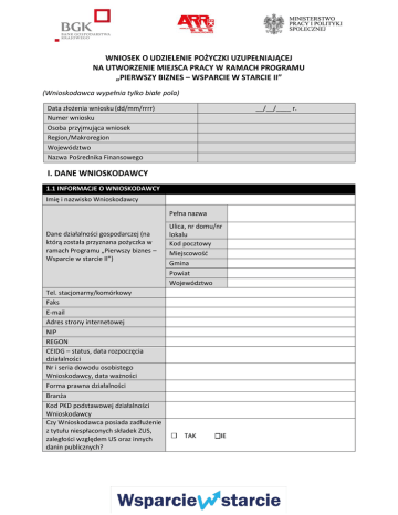 WNIOSEK O UDZIELENIE POŻYCZKI UZUPEŁNIAJĄCEJ NA UTWORZENIE MIEJSCA PRACY W RAMACH PROGRAMU „PIERWSZY BIZNES – WSPARCIE W STARCIE II” (Wnioskodawca wypełnia tylko białe pola) Data złożenia wniosku (dd/mm/rrrr) Numer wniosku Osoba przyjmująca wniosek Region/Makroregion Województwo Nazwa Pośrednika Finansowego __/__/____ r. I. DANE WNIOSKODAWCY 1.1 INFORMACJE O WNIOSKODAWCY Imię i nazwisko Wnioskodawcy Pełna nazwa Dane działalności gospodarczej (na którą została przyznana pożyczka w ramach Programu „Pierwszy biznes – Wsparcie w starcie II”) Tel. stacjonarny/komórkowy Faks E-mail Adres strony internetowej NIP REGON CEIDG – status, data rozpoczęcia działalności Nr i seria dowodu osobistego Wnioskodawcy, data ważności Forma prawna działalności Branża Kod PKD podstawowej działalności Wnioskodawcy Czy Wnioskodawca posiada zadłużenie z tytułu niespłaconych składek ZUS, zaległości względem US oraz innych danin publicznych? Ulica, nr domu/nr lokalu Kod pocztowy Miejscowość Gmina Powiat Województwo TAK NIE II. CHARAKTERYSTYKA POŻYCZKI I PLANOWANEGO DO UTWORZENIA MIEJSCA PRACY 2.1 INFORMACJA O PRZYZNANEJ POŻYCZCE NA ROZPOCZĘCIE DZIAŁALNOŚCI Data udzielenia pożyczki na rozpoczęcie działalności __/__/____ r. gospodarczej (dd/mm/rrrr) Kiedy rozpoczęto spłatę rat kapitałowych? (dd/mm/rrrr) __/__/____ r. 2.2 OPIS PLANOWANEGO DO UTWORZENIA MIEJSCA PRACY Opis stanowiska pracy: Zakres obowiązków osoby zatrudnionej: Wymagane kwalifikacje na stanowisku: 2.3 OBECNE PRZYCHODY I KOSZTY PROWADZONEJ DZIAŁALNOŚCI PRZYCHODY (MIESIĘCZNE) Lp. Źródła przychodów Kwota brutto (PLN) 1. 2. 3. … Razem przychody OPIS (PODSTAWY UZYSKIWANYCH PRZYCHODÓW) KOSZTY (MIESIĘCZNE) Lp. 1. 2. 3. … Razem koszty Rodzaj kosztu Kwota brutto (PLN) OPIS (PODSTAWY PONOSZONYCH KOSZTÓW) 2.4 OPIS PRZEWIDYWANYCH EFEKTÓW EKONOMICZNYCH. PLANOWANE PRZYCHODY I KOSZTY ZWIĄZANE Z UTWORZENIEM MIEJSCA PRACY PLANOWANE PRZYCHODY (MIESIĘCZNE) Lp. Źródła przychodów Kwota brutto (PLN) 1. 2. 3. … Razem przychody OPIS ZAŁOŻEŃ LEŻĄCYCH U PODSTAW PLANOWANYCH PRZYCHODÓW PLANOWANE KOSZTY (MIESIĘCZNE) Lp. Rodzaj kosztu Kwota brutto (PLN) 1. 2. 3. … Razem koszty OPIS ZAŁOŻEŃ LEŻĄCYCH U PODSTAW PLANOWANYCH KOSZTÓW 2.5 INFORMACJA O OSOBIE PLANOWANEJ DO ZATRUDNIENIA W RAMACH TWORZONEGO MIEJSCA PRACY Osoba bezrobotna Osoba bezrobotna skierowana przez powiatowy urząd pracy 2.6 SZCZEGÓŁOWA SPECYFIKACJA I HARMONOGRAM WYDATKÓW W RAMACH WNIOSKOWANEJ POŻYCZKI WYDATKI Lp. Rodzaj wydatku Kwota brutto (PLN) 1. 2. 3. … Razem wydatki OPIS SPOSOBU WYCENY WYDATKÓW planowany termin wydatkowania ŹRÓDŁA FINANSOWANIA Rodzaj źródła Wnioskowana pożyczka Środki własne Inne źródła (jakie?) ………………………………….. Razem źródła finansowania Kwota brutto (PLN) 2.7 INFORMACJA O WNIOSKOWANYCH PARAMETRACH FINANSOWANIA Kwota pożyczki (w tysiącach) Okres spłaty (w miesiącach) Planowana data/y wypłat/y (w transzach lub jednorazowo) 2.8 FORMY ZABEZPIECZENIA SPŁAT NALEŻNOŚCI Z TYTUŁU POŻYCZKI Propozycje zabezpieczenia Weksel in blanco (obowiązkowo) Poręczenie osób/osoby fizycznych/ej* Proszę podać imię/ona i nazwisko/a proponowanego/ych poręczyciela/i 1. ………………………………………………………………………………………………. 2. ………………………………………………………………………………………………. * preferowane jest wskazanie tych samych zabezpieczeń , które zostały przyjęte w związku z pożyczką podstawową. W przypadku stwierdzenia przez pośredników finansowych, że zabezpieczenie jest niewystarczające – Wnioskodawca przedstawia propozycję dodatkowych zabezpieczeń. Lp. 1. 2. Propozycje innych prawnych zabezpieczeń spłat należności z tytułu pożyczki Rodzaj zabezpieczenia wartość (PLN) III. OŚWIADCZENIA 1. Oświadczam, że wszystkie informacje, które zawarłem/am w niniejszym wniosku oraz dane zamieszczone w załączonych dokumentach są prawdziwe i zgodne z Regulaminem udzielania pożyczek. 2. Oświadczam, że wyrażam zgodę na przetwarzanie i udostępnianie danych przekazanych w niniejszym wniosku i załączanych do niego dokumentach dla potrzeb niezbędnych dla realizacji procesu rozpatrywania i monitorowania pożyczki przez pośrednika finansowego (zgodnie z Ustawą z dnia 29 sierpnia 1997r. o ochronie danych osobowych; tekst jednolity Dz. U. z 2002 roku Nr 101 poz 926 z późn. zm.). 3. Oświadczam, że nie zostałem/am prawomocnie skazany/a za przestępstwa przeciwko obrotowi gospodarczemu, w rozumieniu ustawy z dnia 6 czerwca 1997 r. Kodeks karny lub ustawy z dnia 28 października 2002 r. o odpowiedzialności podmiotów zbiorowych za czyny zabronione pod groźbą kary, w okresie 2 lat przed dniem złożenia niniejszego wniosku. 4. Oświadczam, że tworzone stanowisko pracy nie jest jednocześnie finansowane w ramach pożyczki i refundacji kosztów wyposażenia i doposażenia stanowiska pracy dla skierowanego bezrobotnego o której mowa w art. 46 ust. 1 pkt 1 i 1a oraz ust. 1a Ustawy o promocji zatrudnienia i instytucjach rynku pracy lub z innych środków publicznych. 5. Zobowiązuję się, że poddam się kontroli, w tym kontroli w siedzibie mojej działalności gospodarczej, która może być dokonywana przez MRPiPS, BGK, Pośrednika Finansowego bądź inne uprawnione podmioty w zakresie prawidłowości wykorzystania środków pożyczki i zapewniam prawo wglądu we wszystkie dokumenty i dane związane z udzieloną pożyczką i przedmiotem finansowania ze środków pożyczki w czasie tej kontroli . 6. Zobowiązuję się do przechowywania dokumentacji związanej z udzieloną pożyczką i przedmiotem finansowania ze środków pożyczki przez okres 10 lat od podpisania umowy pożyczki, w sposób zapewniający poufność i bezpieczeństwo. 7. Zobowiązuję się, że wykorzystam środki pożyczki zgodnie z jej przeznaczeniem. 8. Zobowiązuj