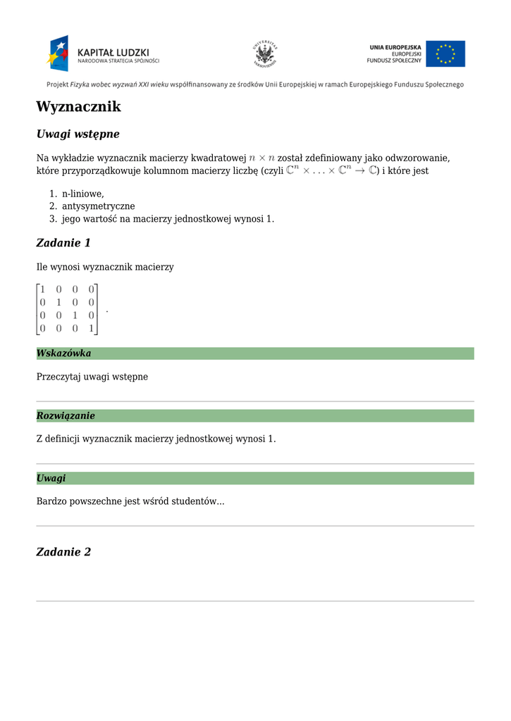 Wyznacznik Uwagi wstępne Na wykładzie wyznacznik macierzy kwadratowej został zdefiniowany jako odwzorowanie, które przyporządkowuje kolumnom macierzy liczbę (czyli ) i które jest 1. n-liniowe, 2. antysymetryczne 3. jego wartość na macierzy jednostkowej wynosi 1. Zadanie 1 Ile wynosi wyznacznik macierzy Wskazówka Przeczytaj uwagi wstępne Rozwiązanie Z definicji wyznacznik macierzy jednostkowej wynosi 1. Uwagi Bardzo powszechne jest wśród studentów... Zadanie 2