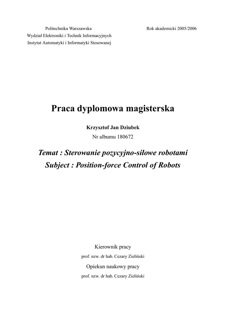 Temat : Sterowanie pozycyjno-siłowe robotami