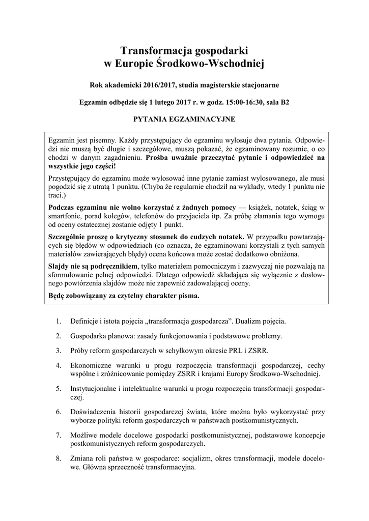 Transformacja gospodarki w Europie Środkowo-Wschodniej Rok akademicki 2016/2017, studia magisterskie stacjonarne Egzamin odbędzie się 1 lutego 2017 r. w godz. 15:00-16:30, sala B2 PYTANIA EGZAMINACYJNE Egzamin jest pisemny. Każdy przystępujący do egzaminu wylosuje dwa pytania. Odpowiedzi nie muszą być długie i szczegółowe, muszą pokazać, że egzaminowany rozumie, o co chodzi w danym zagadnieniu. Prośba uważnie przeczytać pytanie i odpowiedzieć na wszystkie jego części! Przystępujący do egzaminu może wylosować inne pytanie zamiast wylosowanego, ale musi pogodzić się z utratą 1 punktu. (Chyba że regularnie chodził na wykłady, wtedy 1 punktu nie traci.) Podczas egzaminu nie wolno korzystać z żadnych pomocy — książek, notatek, ściąg w smartfonie, porad kolegów, telefonów do przyjaciela itp. Za próbę złamania tego wymogu od oceny ostatecznej zostanie odjęty 1 punkt. Szczególnie proszę o krytyczny stosunek do cudzych notatek. W przypadku powtarzających się błędów w odpowiedziach (co oznacza, że egzaminowani korzystali z tych samych materiałów zawierających błędy) ocena końcowa może zostać dodatkowo obniżona. Slajdy nie są podręcznikiem, tylko materiałem pomocniczym i zazwyczaj nie pozwalają na sformułowanie pełnej odpowiedzi. Dlatego odpowiedź składająca się wyłącznie z dosłownego powtórzenia slajdów może nie zapewnić zadowalającej oceny. Będę zobowiązany za czytelny charakter pisma. 1. Definicje i istota pojęcia „transformacja gospodarcza”. Dualizm pojęcia. 2. Gospodarka planowa: zasady funkcjonowania i podstawowe problemy. 3. Próby reform gospodarczych w schyłkowym okresie PRL i ZSRR. 4. Ekonomiczne warunki u progu rozpoczęcia transformacji gospodarczej, cechy wspólne i zróżnicowanie pomiędzy ZSRR i krajami Europy Środkowo-Wschodniej. 5. Instytucjonalne i intelektualne warunki u progu rozpoczęcia transformacji gospodarczej. 6. Doświadczenia historii gospodarczej świata, które można było wykorzystać przy wyborze polityki reform gospodarczych w państwach postkomunistycznych. 7. Możliwe modele docelowe gospodarki postkomunistycznej, podstawowe koncepcje postkomunistycznych reform gospodarczych. 8. Zmiana roli państwa w gospodarce: socjalizm, okres transformacji, modele docelowe. Główna sprzeczność transformacyjna. 9. Początkowy okres reform gospodarczych: główne wyzwania i działania. 10. Główne elementy, „filary” reform gospodarczych i ich wzajemne uwarunkowanie i oddziaływanie. Dylemat kolejności reform. 11. Liberalizacja gospodarki: podstawowe definicje, założenia i cele. Miejsce liberalizacji w całokształcie reform. 12. Liberalizacja „w wąskim sensie”: istota, przebieg, wyniki. 13. Liberalizacja „w szerokim sensie”: istota, przebieg, wyniki. 14. Stabilizacja gospodarki: definicje, założenia, cele i podstawowe wyniki. 15. Podstawowe kierunki polityki stabilizacji. Proszę wybrać jeden z tych kierunków i go opisać. 16. Prywatyzacja gospodarki: definicje, jej pożądany zasięg i znaczenie dla reform gospodarczych. 17. Podstawowe cele prywatyzacji, stopień ich osiągnięcia w przypadku Polski. 18. Podstawowe metody prywatyzacji. Proszę także wyjaśnić, dlaczego było potrzebne zróżnicowanie metod. 19. Efekty transformacji gospodarczej: ogólna charakterystyka i zróżnicowanie według grup krajów. 20. Podstawowe czynniki warunkujące wyniki transformacji gospodarczej i ich zróżnicowanie. 2