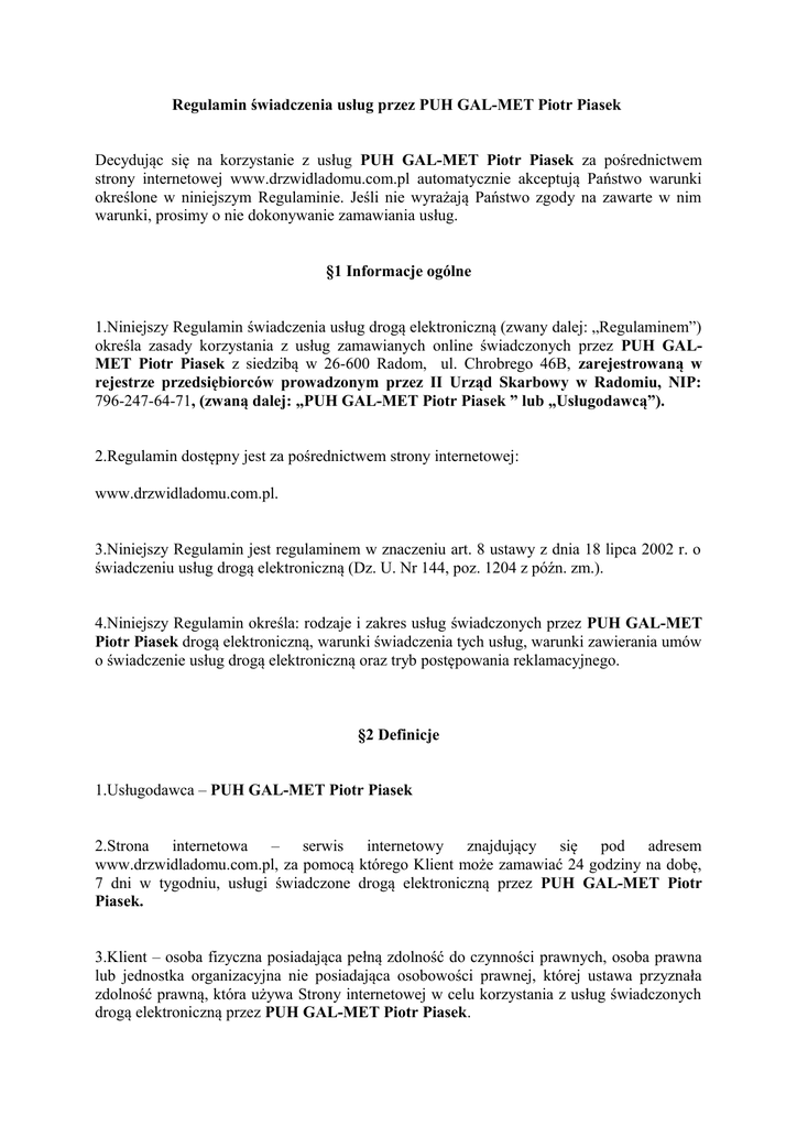 Regulamin świadczenia usług przez PUH GAL-MET Piotr Piasek Decydując się na korzystanie z usług PUH GAL-MET Piotr Piasek za pośrednictwem strony internetowej www.drzwidladomu.com.pl automatycznie akceptują Państwo warunki określone w niniejszym Regulaminie. Jeśli nie wyrażają Państwo zgody na zawarte w nim warunki, prosimy o nie dokonywanie zamawiania usług. §1 Informacje ogólne 1.Niniejszy Regulamin świadczenia usług drogą elektroniczną (zwany dalej: „Regulaminem”) określa zasady korzystania z usług zamawianych online świadczonych przez PUH GALMET Piotr Piasek z siedzibą w 26-600 Radom, ul. Chrobrego 46B, zarejestrowaną w rejestrze przedsiębiorców prowadzonym przez II Urząd Skarbowy w Radomiu, NIP: 796-247-64-71, (zwaną dalej: „PUH GAL-MET Piotr Piasek ” lub „Usługodawcą”). 2.Regulamin dostępny jest za pośrednictwem strony internetowej: www.drzwidladomu.com.pl. 3.Niniejszy Regulamin jest regulaminem w znaczeniu art. 8 ustawy z dnia 18 lipca 2002 r. o świadczeniu usług drogą elektroniczną (Dz. U. Nr 144, poz. 1204 z późn. zm.). 4.Niniejszy Regulamin określa: rodzaje i zakres usług świadczonych przez PUH GAL-MET Piotr Piasek drogą elektroniczną, warunki świadczenia tych usług, warunki zawierania umów o świadczenie usług drogą elektroniczną oraz tryb postępowania reklamacyjnego. §2 Definicje 1.Usługodawca – PUH GAL-MET Piotr Piasek 2.Strona internetowa – serwis internetowy znajdujący się pod adresem www.drzwidladomu.com.pl, za pomocą którego Klient może zamawiać 24 godziny na dobę, 7 dni w tygodniu, usługi świadczone drogą elektroniczną przez PUH GAL-MET Piotr Piasek. 3.Klient – osoba fizyczna posiadająca pełną zdolność do czynności prawnych, osoba prawna lub jednostka organizacyjna nie posiadająca osobowości prawnej, której ustawa przyznała zdolność prawną, która używa Strony internetowej w celu korzystania z usług świadczonych drogą elektroniczną przez PUH GAL-MET Piotr Piasek. 4.Usługi – usługi świadczone przez PUH GAL-MET Piotr Piasek, wskazane w §3 niniejszego Regulaminu. 5.Umowa – umowa zawierana pomiędzy Klientem a PUH GAL-MET Piotr Piasek §3 Usługi 1. PUH GAL-MET Piotr Piasek świadczy za pomocą Strony internetowej oraz drogą elektroniczną Usługi polegające na sprzedaży towarów przez siebie oferowanych, w tym: drzwi, ościeżnic, akcesoriów drzwiowych etc. i na życzenie Klienta doręczeniu ich na terenie całej Polski (możliwy jest także osobisty odbiór towarów w sklepach zlokalizowanych w Radomiu, ul. Chrobrego 46B, Warszawa, ul. Bartycka 26 paw. 116, Wrocław, ul. Traugutta 144 oraz W Katowicach, ul. Moniuszki 5. Do Umów zawartych w następstwie takiego zamówienia zapisy Regulaminu mają odpowiednie zastosowanie. 2.Wszelkie informacje, dane i materiały udostępniane na Stronie internetowej (w tym m.in. nazwy, logotypy i cenniki) oraz wszelkie inne prawa własności intelektualnej należą do PUH GAL-MET Piotr Piasek lub podmiotów współpracujących i są chronione prawami autorskimi, prawami do znaków towarowych, prawami do baz danych lub innymi prawami własności intelektualnej. 3.Nie jest dopuszczalne wykorzystywanie zasobów Strony internetowej jako podstawy do prowadzenia przez Klienta jakiejkolwiek działalności gospodarczej, opartej o zawarte na Stronie internetowej informacje lub narzędzia. §4 Zawarcie i warunki Umowy 1.Klient może korzystać z Usług dostępnych przez Stronę internetową z zastrzeżeniem spełnienia wymagań technicznych, o jakich mowa w §5 Regulaminu, oraz pod warunkiem akceptacji postanowień niniejszego Regulaminu. 2.Postanowienia niniejszego Regulaminu mają charakter porozumienia pomiędzy PUH GALMET Piotr Piasek a Klientem oraz określają podstawy prawne i warunki Umowy. 3.Każdy Klient zobowiązany jest, w chwili podjęcia czynności zmierzających do zawarcia Umowy, do przestrzegania warunków niniejszego Regulaminu. 4.Stronami Umowy są Klient oraz PUH GAL-MET Piotr Piasek. 5.Klient niniejszym potwierdza, że posiada pełną zdolność do czynności prawnych i do zawierania prawnie wiążących zobowiązań, akceptując zaś warunki niniejszego Regulaminu przyjmuje na siebie pełną odpowiedzialność finansową za należyte wykonanie Umowy. Zabrania się Klientowi zawierania Umowy lub dokonywania jakichkolwiek płatności z tytułu Umowy z użyciem fałszywego lub cudzego imienia lub nazwiska/firmy, z wykorzystaniem fałszywej bądź cudzej karty kredytowej lub cudzego konta bankowego, bez zgody właściciela karty kredytowej lub konta bankowego lub w każdy inny sposób niezgodny z prawem. 6.Klient zapewnia, że zawiera Umowę wyłącznie w sposób zgody z obowiązującym prawem. 7.Warunkami zawarcia Umowy są: prawidłowy przebieg procesu zamówienia towaru, w tym podania kompletnych danych, akceptacja warunków niniejszego Regulaminu i dokonanie opłaty za zamówiony towar. Ceny towarów zawierają podatek VAT. 8.Proces zamówienia Usługi wymaga podjęcia następujących kroków: a) wejścia przez Klienta na Stronę internetową lub złożenie zamówienia drogą elktroniczną. b) wyboru przez Klienta towaru; c) podania danych kontaktowych Klienta, ewentualnie danych osoby/firmy, której zamówienie ma zostać dostarczone; d) wyboru sposobu odbioru towaru: osobistego lub, transport firmowy, a takže dostarczenia przez kuriera, e) po złożeniu zamówienia towar, na podany przez Klienta adres e-mail przesłana zostanie wiadomość z potwierdzeniem dokonania zamówienia. (wraz z załącznikiem w postaci formularza zamówienia). W przypadku zamówień telefonicznych Usługodawca poinformuje Klienta o czynnościach koniecznych do podjęcia w celu zawarcia Umowy. 9. Moment zawarcia Umowy następuje w chwili całkowitej akceptacji zamówieniaia przez Klienta oraz po dokonaniu wpłaty zadatku na złożenone zamówienia lub opłacty całościowej. 10. Warunkiem uruchomienia zamówienia jest pisemne potwierdzenie 
