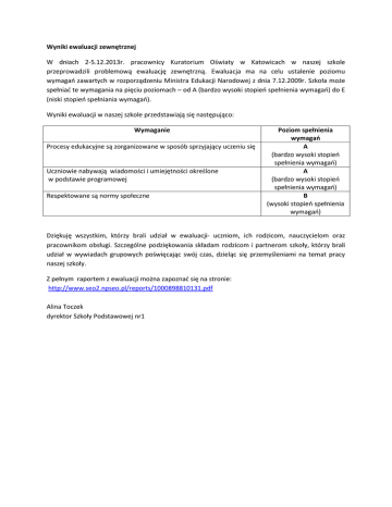 Wyniki ewaluacji zewnętrznej W dniach 2-5.12.2013r. pracownicy Kuratorium Oświaty w Katowicach w naszej szkole przeprowadzili problemową ewaluację zewnętrzną. Ewaluacja ma na celu ustalenie poziomu wymagań zawartych w rozporządzeniu Ministra Edukacji Narodowej z dnia 7.12.2009r. Szkoła może spełniać te wymagania na pięciu poziomach – od A (bardzo wysoki stopień spełnienia wymagań) do E (niski stopień spełniania wymagań). Wyniki ewaluacji w naszej szkole przedstawiają się następująco: Wymaganie Procesy edukacyjne są zorganizowane w sposób sprzyjający uczeniu się Uczniowie nabywają wiadomości i umiejętności określone w podstawie programowej Respektowane są normy społeczne Poziom spełnienia wymagań A (bardzo wysoki stopień spełnienia wymagań) A (bardzo wysoki stopień spełnienia wymagań) B (wysoki stopień spełnienia wymagań) Dziękuję wszystkim, którzy brali udział w ewaluacji- uczniom, ich rodzicom, nauczycielom oraz pracownikom obsługi. Szczególne podziękowania składam rodzicom i partnerom szkoły, którzy brali udział w wywiadach grupowych poświęcając swój czas, dzieląc się przemyśleniami na temat pracy naszej szkoły. Z pełnym raportem z ewaluacji można zapoznać się na stronie: http://www.seo2.npseo.pl/reports/1000898810131.pdf Alina Toczek dyrektor Szkoły Podstawowej nr1
