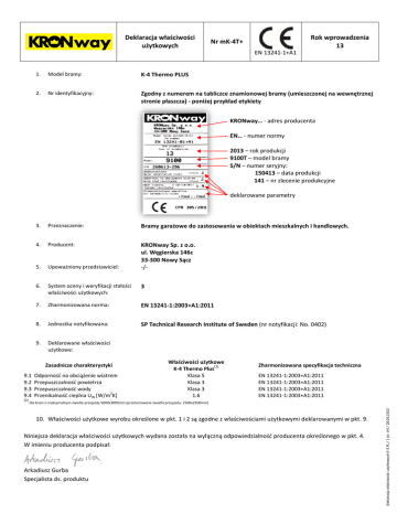Deklaracja właściwości użytkowych Rok wprowadzenia 13 Nr mK-4T+ EN 13241-1+A1 +A1 1. Model bramy: K Thermo PLUS K-4 2. Nr identyfikacyjny: Zgodny z numerem na tabliczce znamionowej bramy (umieszczonej na wewnętrznej stronie płaszcza) - poniżej przykład etykiety KRONway… - adres producenta EN… - numer normy 2013 – rok produkcji 9100T – model bramy S/N – numer seryjny: 150413 – data produkcji 141 – nr zlecenie produkcyjne deklarowane parametry 3. Przeznaczenie: Bramy garażowe do zastosowania w obiektach mieszkalnych i handlowych. 4. Producent: 5. Upoważniony przedstawiciel: KRONway Sp. z o.o. ul. Węgierska 146c 33 33-300 Nowy Sącz -//- 6. System oceny i weryfikacji stałości właściwości użytkowych: 3 7. Zharmonizowana norma: EN 13241-1:2003+A1:2011 1 8. Jednostka notyfikowana: SP Technical Research Institute of Sweden (nr notyfikacji: No. 0402) 9. Deklarowane właściwości użytkowe: Zasadnicze charakterystyki 9.1 9.2 9.3 9.4 Zharmonizowana specyfikacja techniczna EN 13241-1:2003+A1:2011 :2003+A1:2011 EN 13241-1:2003+A1:2011 :2003+A1:2011 EN 13241-1:2003+A1:2011 :2003+A1:2011 EN 13241-1:2003+A1:2011 :2003+A1:2011 dla bram o maksymalnym świetle przejazdy 5000x3000mm (przetestowane światło przejazdu: przejazdu 2500x2500mm) 10. Właściwości użytkowe wyrobu określone w pkt. 1 i 2 są zgodne z właściwościami użytkowymi deklarowanymi w pkt. 9. Niniejsza deklaracja właściwości użytkowych wydana została na wyłączną odpowiedzialność producenta określonego w pkt. 4. W imieniu producenta podpisał: …………………………………………… Arkadiusz Gurba Specjalista ds. produktu Deklaracja właściwości użytkowych K-4 PL / 1 str. A4 / 28.06.2013 (1) Odporność na obciążenie wiatrem Przepuszczalność powietrza Przepuszczalność wody 2 Przenikalność cieplna UW [W/m K] Właściwości użytkowe (1) K-4 Thermo Plus Klasa 5 Klasa 3 Klasa 3 1.6