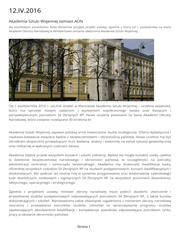 12.IV.2016 Akademia Sztuki Wojennej zamiast AON Na wtorkowym posiedzeniu Rada Ministrów przyjęła projekt ustawy, zgodnie z którą od 1 października na bazie Akademii Obrony Narodowej w Rembertowie zostanie utworzona Akademia Sztuki Wojennej. Od 1 października 2016 r. zacznie działać w Warszawie Akademia Sztuki Wojennej – uczelnia wojskowa, która ma sprostać nowym zadaniom i wyzwaniom współczesnego świata oraz bieżącym i perspektywicznym potrzebom Sił Zbrojnych RP. Nowa uczelnia powstanie na bazie Akademii Obrony Narodowej, która zostanie rozwiązana 30 września br. Akademia Sztuki Wojennej zapewni polskiej armii nowoczesne studia strategiczne. Oferta dydaktyczna i naukowo-badawcza związana będzie z bezpieczeństwem i obronnością państwa. Nowa uczelnia ma być ośrodkiem eksperckim prowadzącym m.in. badania, analizy i kwerendy na temat sytuacji geopolitycznej oraz militarnej w wybranych częściach świata. Akademia będzie przede wszystkim kształcić i szkolić żołnierzy. Będzie też mogła kształcić osoby cywilne w dziedzinie bezpieczeństwa narodowego i obronności państwa, w szczególności na potrzeby administracji centralnej i samorządu terytorialnego. Akademia ma doskonalić kwalifikacje kadry oficerskiej wszystkich rodzajów Sił Zbrojnych RP na studiach podyplomowych, kursach kwalifikacyjnych i doskonalących. Ma spełniać też istotną rolę w systemie przygotowania oraz doskonalenia zawodowego kadr dowódczych, sztabowych i logistycznych Sił Zbrojnych RP na wszystkich poziomach dowodzenia: taktycznego, operacyjnego i strategicznego. Zgodnie z projektem ustawy, minister obrony narodowej może polecić akademii utworzenie i prowadzenie studiów podyplomowych odpowiadających potrzebom Sił Zbrojnych RP, a także kursów dokształcających i szkoleń. Wprowadzono także obowiązek uzgadniania z ministrem obrony narodowej tworzenia i prowadzenia kierunków studiów. Umożliwi to opracowywanie programu studiów zapewniających absolwentom kwalifikacje i kompetencje zawodowe odpowiadające potrzebom rynku pracy w obszarze obronności państwa. Strona 1 W projekcie ustawy uregulowano także kwestie związane z zachowaniem ciągłości pracy dydaktycznej i badawczej oraz działalności organizacyjnej, po rozwiązaniu Akademii Obrony Narodowej. Komunikat CIR Strona 2
