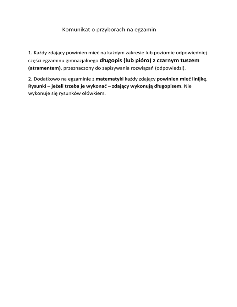 Komunikat o przyborach na egzamin 1. Każdy zdający powinien mieć na każdym zakresie lub poziomie odpowiedniej części egzaminu gimnazjalnego długopis (lub pióro) z czarnym tuszem (atramentem), przeznaczony do zapisywania rozwiązań (odpowiedzi). 2. Dodatkowo na egzaminie z matematyki każdy zdający powinien mieć linijkę. Rysunki – jeżeli trzeba je wykonać – zdający wykonują długopisem. Nie wykonuje się rysunków ołówkiem.