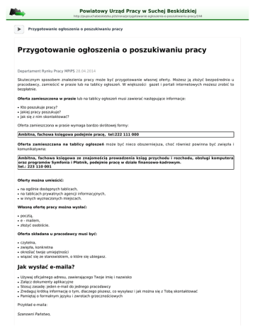 Powiatowy Urząd Pracy w Suchej Beskidzkiej http://pupsuchabeskidzka.pl/strona/przygotowanie-ogloszenia-o-poszukiwaniu-pracy/244 Przygotowanie ogłoszenia o poszukiwaniu pracy Przygotowanie ogłoszenia o poszukiwaniu pracy Departament Rynku Pracy MPiPS 28.04.2014 Skutecznym sposobem znalezienia pracy może być przygotowanie własnej oferty. Możesz ją złożyć bezpośrednio u pracodawcy, zamieścić w prasie lub na tablicy ogłoszeń. W większości gazet i portali internetowych możesz zrobić to bezpłatnie. Oferta zamieszczona w prasie lub na tablicy ogłoszeń musi zawierać następujące informacje: ● ● ● Kto poszukuje pracy? Jakiej pracy poszukuje? Jak się z nim skontaktować? Oferta zamieszczona w prasie wymaga bardzo skrótowej formy: Ambitna, fachowa księgowa podejmie pracę, tel:222 111 000 Oferta zamieszczana na tablicy ogłoszeń może być nieco obszerniejsza, choć również powinna być zwięzła i komunikatywna: Ambitna, fachowa księgowa ze znajomością prowadzenia ksiąg przychodu i rozchodu, obsługi komputera oraz programów Symfonia i Płatnik, podejmie pracę w dziale finansowo-kadrowym. tel.: 223 110 001 Oferty można umieścić: ● ● ● na ogólnie dostępnych tablicach, na tablicach prywatnych agencji informacyjnych, w innych wyznaczonych miejscach. Własną ofertę pracy można wysłać: ● ● ● pocztą, e - mailem, złożyć osobiście. Oferta składana u pracodawcy musi być: ● ● ● ● czytelna, zwięzła, konkretna określać twoje umiejętności wiązać się ze stanowiskiem, o które się ubiegasz. Jak wysłać e-maila? ● ● ● ● ● Używaj oficjalnego adresu, zawierającego Twoje imię i nazwisko Załącz dokumenty aplikacyjne Stosuj zasadę: jeden e-mail do jednego pracodawcy Zredaguj krótką informację o tym, dlaczego piszesz, co wysyłasz i jak można się z Tobą skontaktować Pamiętaj o formalnym języku i zwrotach grzecznościowych Przykład e-maila: Szanowni Państwo, W odpowiedzi na ogłoszenie zamieszczone na stronie www.pracuj.pl dotyczące rekrutacji na stanowisko przedstawiciela handlowego nr ref. 324 przesyłam swoje dokumenty aplikacyjne. Jestem zainteresowany podjęciem tego typu pracy i spełniam w większości określone wymogi (wykształcenie handlowe, prawo jazdy, umiejętność prowadzenia negocjacji). Jeśli uznają Państwo, że jestem właściwym kandydatem na oferowane stanowisko, proszę o kontakt telefoniczny pod nr: 821-412-003 lub mailowy. Z wyrazami szacunku Jan Niezbędny