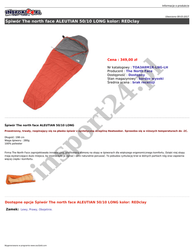 Informacje o produkcie Utworzono 08-03-2017 Śpiwór The north face ALEUTIAN 50/10 LONG kolor: REDclay Cena : 349,00 zł sp or t2 4. p l Nr katalogowy : TOA3A8M1R-LNG-LH Producent : The North Face Dostępność : Dostępny Stan magazynowy : bardzo wysoki Średnia ocena : brak recenzji Śpiwór The north face ALEUTIAN 50/10 LONG Przestronny, trwały, rozpinający się na płasko śpiwór z syntetyczną ociepliną Heatseeker. Sprawdza się w niższych temperaturach do -2C. Długość: 198 cm Waga śpiworu : 280g 100% poliester in Firma The North Face zaprojektowała innowacyjną, profilowaną komorę na stopy w śpiworach dla większego ergonomicznego komfortu. Dzięki niej stopy mają wystarczająco dużo miejsca, by można było je zginać i nimi naturalnie poruszać. To pobudza cyrkulację krwi w dolnych partiach nóg oraz zapewnia więcej ciepła i komfortu. Dostępne opcje Śpiwór The north face ALEUTIAN 50/10 LONG kolor: REDclay Zamek: Lewy, Prawy, Obojetnie. Wygenerowano w programie www.oscGold.com