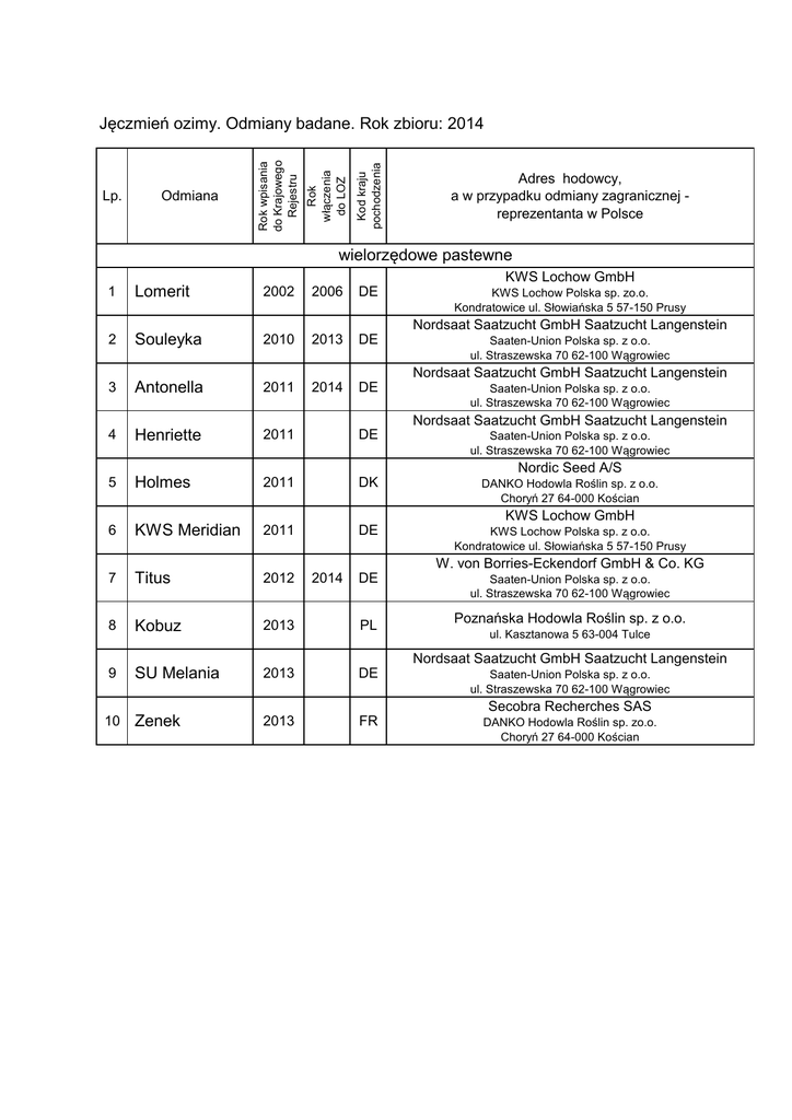 Jęczmień ozimy. Odmiany badane. Rok zbioru: 2014