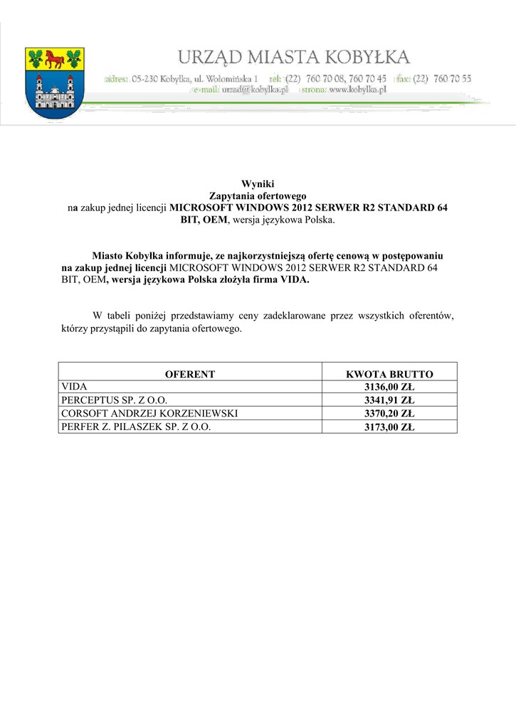 Wyniki Zapytania ofertowego na zakup jednej licencji MICROSOFT WINDOWS 2012 SERWER R2 STANDARD 64 BIT, OEM, wersja językowa Polska. Miasto Kobyłka informuje, ze najkorzystniejszą ofertę cenową w postępowaniu na zakup jednej licencji MICROSOFT WINDOWS 2012 SERWER R2 STANDARD 64 BIT, OEM, wersja językowa Polska złożyła firma VIDA. W tabeli poniżej przedstawiamy ceny zadeklarowane przez wszystkich oferentów, którzy przystąpili do zapytania ofertowego. OFERENT VIDA PERCEPTUS SP. Z O.O. CORSOFT ANDRZEJ KORZENIEWSKI PERFER Z. PILASZEK SP. Z O.O. KWOTA BRUTTO 3136,00 ZŁ 3341,91 ZŁ 3370,20 ZŁ 3173,00 ZŁ