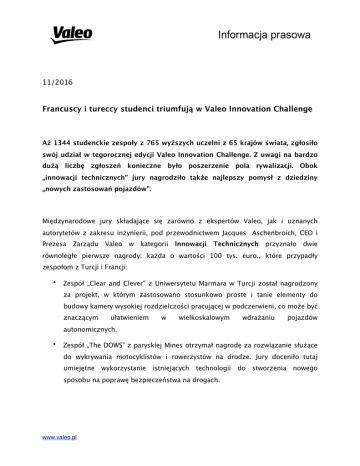11/2016 Francuscy i tureccy studenci triumfują w Valeo Innovation Challenge Aż 1344 studenckie zespoły z 765 wyższych uczelni z 65 krajów świata, zgłosiło swój udział w tegorocznej edycji Valeo Innovation Challenge. Z uwagi na bardzo dużą liczbę zgłoszeń konieczne było poszerzenie pola rywalizacji. Obok „innowacji technicznych” jury nagrodziło także najlepszy pomysł z dziedziny „nowych zastosowań pojazdów”. Międzynarodowe jury składające się zarówno z ekspertów Valeo, jak i uznanych autorytetów z zakresu inżynierii, pod przewodnictwem Jacques Aschenbroich, CEO i Prezesa Zarządu Valeo w kategorii Innowacji Technicznych przyznało dwie równoległe pierwsze nagrody: każda o wartości 100 tys. euro., które przypadły zespołom z Turcji i Francji: • Zespół „Clear and Clever” z Uniwersytetu Marmara w Turcji został nagrodzony za projekt, w którym zastosowano stosunkowo proste i tanie elementy do budowy kamery wysokiej rozdzielczości pracującej w podczerwieni, co może być znaczącym ułatwieniem w wielkoskalowym wdrażaniu pojazdów autonomicznych. • Zespół „The DOWS” z paryskiej Mines otrzymał nagrodę za rozwiązanie służące do wykrywania motocyklistów i rowerzystów na drodze. Jury doceniło tutaj umiejętne wykorzystanie istniejących technologii sposobu na poprawę bezpieczeństwa na drogach. www.valeo.pl do stworzenia nowego Z kolei w kategorii Nowych Zastosowań Pojazdów nagrody otrzymały aż trzy zespoły: • Zespół „Mahuaz” z amerykańskiego Northwestern University przewidział, że kierowca pojazdu autonomicznego, który utknie w korku może się nudzić. Rozwiązanie? Przekształcenie kabiny w… siłownię. Jury wysoko oceniło twórcze wykorzystanie technologii i rozwiązań, które już dziś obecne są w samochodach. • Zespół „Globalist” z Uniwersytetu Tokijskiego w Japonii zintegrował baterie pojazdu elektrycznego z szerszym „ekosystemem” urządzeń zasilanych elektrycznie. • Zespół „Renovate” z Uniwersytetu Stambulskiego w Turcji opracował system rezerwacji przejazdów w celu redukcji natężenia ruchu w mieście. W kolejnej edycji Valeo Innovation Challenge obok rywalizacji w dwóch kategoriach i nagrody w wysokości 100 tys. euro dla najlepszych, zwycięzcy będą mogli także współpracować z Valeo w ramach specjalnego akceleratora dla start-upów, by móc rozwinąć swój projekt w gotowe rozwiązanie. www.valeo.pl