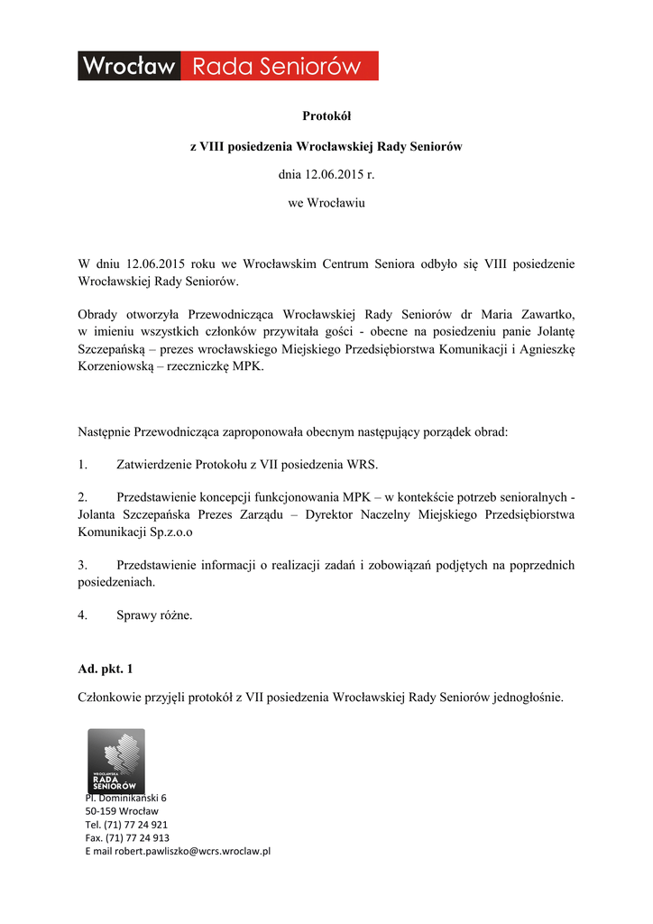 Protokół z VIII posiedzenia Wrocławskiej Rady Seniorów dnia 12.06.2015 r. we Wrocławiu W dniu 12.06.2015 roku we Wrocławskim Centrum Seniora odbyło się VIII posiedzenie Wrocławskiej Rady Seniorów. Obrady otworzyła Przewodnicząca Wrocławskiej Rady Seniorów dr Maria Zawartko, w imieniu wszystkich członków przywitała gości - obecne na posiedzeniu panie Jolantę Szczepańską – prezes wrocławskiego Miejskiego Przedsiębiorstwa Komunikacji i Agnieszkę Korzeniowską – rzeczniczkę MPK. Następnie Przewodnicząca zaproponowała obecnym następujący porządek obrad: 1. Zatwierdzenie Protokołu z VII posiedzenia WRS. 2. Przedstawienie koncepcji funkcjonowania MPK – w kontekście potrzeb senioralnych Jolanta Szczepańska Prezes Zarządu – Dyrektor Naczelny Miejskiego Przedsiębiorstwa Komunikacji Sp.z.o.o 3. Przedstawienie informacji o realizacji zadań i zobowiązań podjętych na poprzednich posiedzeniach. 4. Sprawy różne. Ad. pkt. 1 Członkowie przyjęli protokół z VII posiedzenia Wrocławskiej Rady Seniorów jednogłośnie. Pl. Dominikański 6 50-159 Wrocław Tel. (71) 77 24 921 Fax. (71) 77 24 913 E mail [email protected] Ad. pkt. 2 Pani J. Szczepańska poinformowała, że koncepcja funkcjonowania MPK ma na względzie potrzeby seniorów. Przedstawiła w punktach założenia: 1) Tramwaje i autobusy. Do połowy listopada br. wszystkie autobusy we Wrocławiu będą niskopodłogowe. Czekamy na środki unijne żeby wymienić część taboru tramwajowego. Tu sytuacja jest gorsza niż z autobusami, gdyż nie jesteśmy w stanie wymienić całego taboru w ciągu najbliższych lat. Złożone są do Ministerstwa przez Miasto projekty - wnioski o dofinansowanie z funduszy UE. Jeżeli chodzi o ten rok to mamy 14 nowych nowoczesnych tramwajów. Pozostałe 150 są stare i trzeba by je wymienić. Są one nieklimatyzowane, po prostu nie spełniają standardów, których oczekują pasażerowie. 2) Informacje i komunikaty. Mieliśmy i mamy listy i telefony od starszych osób, w których pojawia się sprawa niezbyt dobrej słyszalności komunikatów w tramwajach. Była próba wprowadzenia syntezatorów mowy, ale okazało się wróciliśmy do rozwiązania, które już było. Po ogłoszonym konkursie wykonawca nagrał głos w profesjonalnym studio, po to, by był jak najlepiej słyszalny. Ponadto, w głównych punktach miasta takich jak: lotnisko, opera, dworzec główny, komunikaty głosowe pojawiają się też po angielsku. Wiemy o tym też, że pasażerowie chcą mieć w środkach transportu spokój. 3) Rozkład jazdy. Były prośby by w rozkładach jazdy druk powiększyć i to zostało zrobione. Skarg już nie ma. W pojazdach pojawiają się napisy elektroniczne też poprawione, z lepszą jakością wyświetlenia. W czasie dyskusji członkowie Rady zwrócili uwagę na oznaczenie zewnętrzne pojazdów, na to, by były z przodu i z tyłu duże tablice. Pani prezes stwierdziła, że w nowych pojazdach jest już oprócz tablicy także zewnętrzna zapowiedź głosowa. 4) Ekrany w pojazdach. Służą do wyświetlania informacji o akcjach promocyjnych. Wypowiedź pani Jolanty Szczepańskiej uzupełniła Agnieszka Korzeniowska, rzeczniczka MPK, która zauważyła, że tematy społeczne muszą być realizowane rokrocznie i tak się dzieje. Zagadnienia edukacyjne, w szczególności bardziej sugestywne sposoby komunikacji z pasażerami, zamiast tabliczek – USTĄP MIEJSCA STARSZEMU. Pl. Dominikański 6 50-159 Wrocław Tel. (71) 77 24 921 Fax. (71) 77 24 913 E mail [email protected] Będziemy prowadzić badania w tym kierunku, które jednak są b. kosztowne. Już mamy skargi i osoby starsze się do nas zwracają. Pani Wanda Ziembicka – Has włączyła się z uwagą, iż jako wykładowczyni komunikacji społecznej, wie, że działa dopiero, gdy się powie: MŁODY CZŁOWIEKU WSTAŃ. Dlatego będziemy robić filmy - kontynuowała p. Korzeniowska. Ale nie nakazywać, bo to nie działa. Autobusy albo przestrzeń miejska są monitorowane. Sprawdzamy interwencje, przystanki na żądanie, gdzie „trzeba machnąć ręką”. Będziemy edukować naszych pasażerów, bo edukujemy naszych kierowców, sukcesywnie. Ale to nie wystarczy. Bardzo wielu jest pasażerów spoza Wrocławia, tam gdzie nie było komunikacji miejskiej. Dr Maria Zawartko po wystąpieniu gości złożyła na ręce pani prezes Szczepańskiej pismo datowane na 10 czerwca 2015 r., które dotyczy transportu zbiorowego w naszym mieście. W piśmie wnioskuje się, w imieniu Wrocławskiej Rady Seniorów i seniorów z Muchoboru Małego o: - niezwłoczne uruchomienie, czy też podprowadzenie linii autobusowej, która dowiezie z Muchoboru Małego do Centrum miasta. - uruchomienie połączenia, które prosto i szybko skomunikuje ul. Grabiszyńską z ul. Legnicką i odwrotnie. Pismo podpisane przez Przewodniczącą Rady trafiło do wiadomości odnośnych organów, w tym do Wrocławskiego Centrum Seniora. Pani prezes MPK zaznaczyła, spodziewając się treści pisma, że Przedsiębiorstwo jedynie świadczy transport. Wszelkie usługi są zamawiane przez UM Wrocław, my dostajemy wskazania do realizacji. MPK nie ma żadnego wpływu na trasy tramwajów. Pani dr Zawartko, po przekazaniu pisma stwierdziła, że nasze miasto jest jednak miastem nie tylko ludzi młodych, ale ludzi w wieku senioralnym. Chcemy dbać o seniorów i Rada ma takie zadanie. Konstatacja po dyskusji powstała taka, by pismo skierować jak najszybciej do dyrektora Czuryło. W tym momencie posiedzenia przewodnicząca Rady przekazała prowadzenie panu Dominikowi Golemie, ponieważ musiała opuścić spotkanie. Pl. Dominikański 6 50-159 Wrocław Tel. (71) 77 24 921 Fax. (71) 77 24 913 E mail [email protected] Pani prezes jeszcze doprecyzowała jakie uprawnienia posiada MPK. Następnie p. Golema poprosił by przejść do części interaktywnej posiedzenia i skupić się na zagadnieniach senioralnych. Pierwsza głos zabrała pani dr W. Wnuk zwracając uwagę na potrzebę kampa