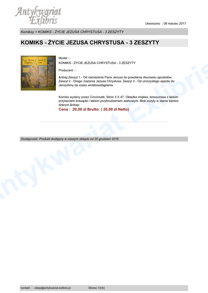 Utworzono : 08 marzec 2017 Komiksy > KOMIKS - ŻYCIE JEZUSA CHRYSTUSA - 3 ZESZYTY KOMIKS - ŻYCIE JEZUSA CHRYSTUSA - 3 ZESZYTY Model : - s i r b KOMIKS - ŻYCIE JEZUSA CHRYSTUSA - 3 ZESZYTY Producent : Zeszyt 1 - Od narodzenia Pana Jezusa do powołania dwunastu apostołów. Zeszyt 2 - Droga i kazania Jezusa Chrystusa. Zeszyt 3 - Od uroczystego wjazdu do Jerozolimy do czasu wniebowstąpienia. i l x Komiks wydany przez Cincinnatti. Stron 3 X 47. Okładka miękka, broszurowa z lekkim przytarciem krawędzi i lekkim przybrudzeniem wiekowym. Blok zszyty w stanie bardzo dobrym. E t Cena : 20,00 zł Brutto ( 20,00 zł Netto) a i r a w k y t n A Dostępność: Produkt dostępny w naszym sklepie od 20 grudzień 2016 kontakt : - [email protected] Strona 1/{nb}