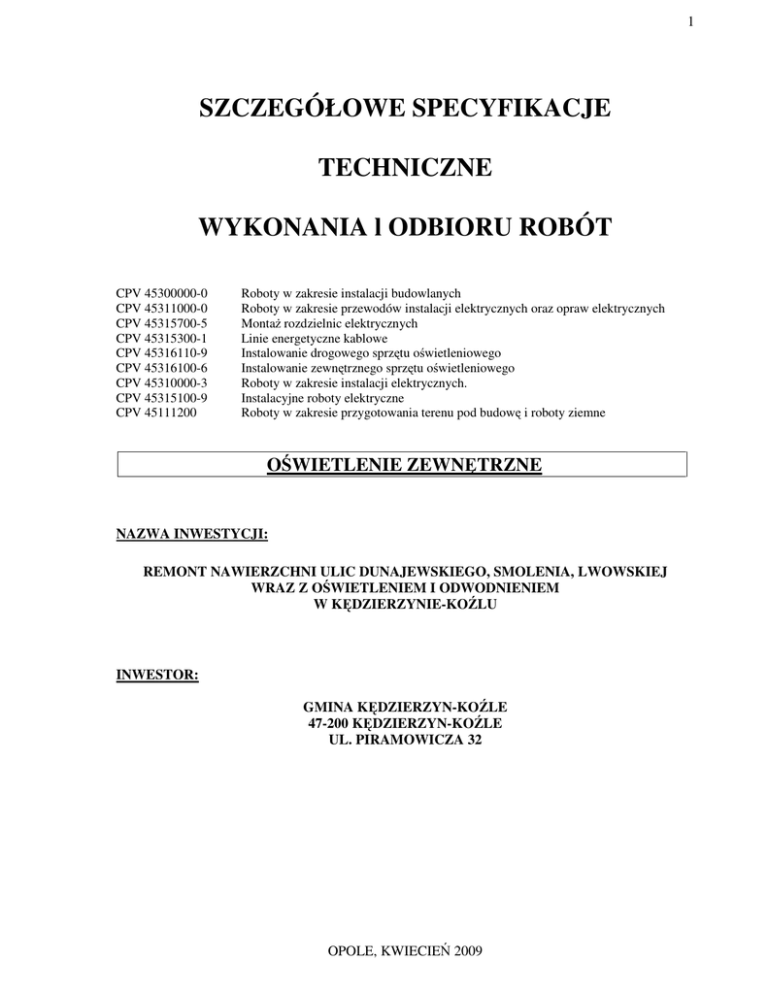 1 ¦ SZCZEGÓŁOWE SPECYFIKACJE TECHNICZNE WYKONANIA l ODBIORU ROBÓT CPV 45300000-0 CPV 45311000-0 CPV 45315700-5 CPV 45315300-1 CPV 45316110-9 CPV 45316100-6 CPV 45310000-3 CPV 45315100-9 CPV 45111200 Roboty w zakresie instalacji budowlanych Roboty w zakresie przewodów instalacji elektrycznych oraz opraw elektrycznych Montaż rozdzielnic elektrycznych Linie energetyczne kablowe Instalowanie drogowego sprzętu oświetleniowego Instalowanie zewnętrznego sprzętu oświetleniowego Roboty w zakresie instalacji elektrycznych. Instalacyjne roboty elektryczne Roboty w zakresie przygotowania terenu pod budowę i roboty ziemne OŚWIETLENIE ZEWNĘTRZNE NAZWA INWESTYCJI: REMONT NAWIERZCHNI ULIC DUNAJEWSKIEGO, SMOLENIA, LWOWSKIEJ WRAZ Z OŚWIETLENIEM I ODWODNIENIEM W KĘDZIERZYNIE-KOŹLU INWESTOR: GMINA KĘDZIERZYN-KOŹLE 47-200 KĘDZIERZYN-KOŹLE UL. PIRAMOWICZA 32 OPOLE, KWIECIEŃ 2009 2 SPIS TREŚCI 1. WARUNKI OGÓLNE. 1.1. Nazwa nadana zamówieniu przez zamawiającego. 1.2. Przedmiot ST. 1.3. Przedmiot i zakres robót objętych ST. 1.4. Roboty towarzyszące. 1.5. Zakres stosowania specyfikacji technicznej. 1.6. Określenia podstawowe, definicje. 1.7. Ogólne wymagania dotyczące robót. 1.8. Dokumentacja robót montażowych i prefabrykacyjnych. 1.9. Nazwy i kody robót objętych zamówieniem. 2. WYMAGANIA DOTYCZĄCE WŁAŚCIWOŚCI MATERIAŁÓW. 2.1. Ogólne wymagania dotyczące właściwości materiałów, ich pozyskiwania i składowania. 2.2. Rodzaje materiałów. 2.2.1. Szafka kablowa. 2.2.2. Kable, piasek, folia, rury ochronne. 2.2.3. Słupy i oprawy oświetleniowe. 2.2.4. Uziemienia. 2.2.5. Warunki przyjęcia na budowę materiałów do robót montażowych. 2.2.6. Warunki przechowywania materiałów do montażu instalacji elektrycznej. 3. WYMAGANIA DOTYCZĄCE SPRZĘTU, MASZYN I NARZĘDZI. 3.1. Ogólne wymagania dotyczące sprzętu. 4. WYMAGANIA DOTYCZĄCE TRANSPORTU. 4.1. Ogólne wymagania dotyczące transportu. 4.2. Transport materiałów. 5. WYMAGANIA DOTYCZĄCE WYKONANIA ROBÓT. 5.1. Ogólne zasady wykonania robót. 5.2. Rozbiórka istniejącego oświetlenia ulicznego. 5.3. Wycinka drzewostanu. 5.4. Przebudowa istniejącej szafy oświetleniowej SOU-5272. 5.5. Budowa kablowego oświetlenia ulicznego. 5.6. Prace porządkowe. 5.7. Ochrona przeciwporażeniowa. 5.8. Ważniejsze wskazówki wykonania robót. 5.9. Minimalna głębokość ułożenia kabli 1kV. 5.10. Wymiary wykopów. 5.11. Układanie kabla nn. 5.12. Wypełnienie wykopu gruntem. 5.13. Prefabrykacja i montaż szafek rozdzielczych. 5.14. Technologia montażu linii kablowych. 5.15. Prace montażowe na oświetleniowej linii kablowej. 6. ZABEZPIECZENIE TERENU BUDOWY. 7. OCHRONA ŚRODOWISKA W CZASIE WYKONYWANIA ROBÓT. 8. OCHRONA PRZECIWPOŻAROWA. 9. OCHRONA ROBÓT. 10. STOSOWANIE SIĘ DO PRAWA I INNYCH PRZEPISÓW 11. BADANIA I POMIARY. 12. PRZEJĘCIE ROBÓT. 13. KONTROLA JAKOŚCI ROBÓT 13.1. Ogólne zasady kontroli jakości robót. 13.2. Szczegółowy wykaz oraz zakres badań pomontażowych. 13.3. Sprawdzenia odbiorcze. 13.4. Zasady postępowania z wadliwie wykonanymi robotami i materiałami. 14. WYMAGANIA DOTYCZĄCE PRZEDMIARU I OBMIARU ROBÓT. 14.1. Ogólne zasady przedmiaru i obmiaru. 14.2. Szczegółowe zasady przedmiaru i obmiaru robót montażowych. 15. SPOSÓB ODBIORU ROBÓT. 15.1. Ogólne zasady odbioru robót. 15.2. Warunki odbioru instalacji energetycznych i urządzeń. 15.2.1. Odbiór międzyoperacyjny. 15.2.2. Odbiór częściowy. 15.2.3. Odbiór końcowy. 16. PODSTAWA ROZLICZENIA ROBÓT. 16.1. Ogólne ustalenia dotyczące podstawy rozliczenia robót. 16.2. Zasady rozliczenia i płatności. 17. DOKUMENTY BUDOWY. 17.1. Dziennik budowy. 17.2. Księga obmiaru. 17.3. Pozostałe dokumenty budowy. 17.4. Przechowywanie dokumentów budowy. 18. DOKUMENTY ODNIESIENIA. 18.1. Normy. 18.2. Inne dokumenty, instrukcje i przepisy. 18.2.1. Inne dokumenty i instrukcje. 18.2.2. Ustawy. 18.2.3. Rozporządzenia. 3 1. WARUNKI OGÓLNE. 1.1 Nazwa nadana zamówieniu przez zamawiającego. Remont ulic Dunajewskiego, Smolenia, Lwowskiej. Część elektryczna – oświetlenie uliczne 1.2. Przedmiot ST. Przedmiotem niniejszej specyfikacji technicznej (ST) są wymagania dotyczące wykonania i odbioru robót związanych z oświetleniem zewnętrznym ulic. 1.3. Przedmiot i zakres robót objętych ST. Ustalenia zawarte w niniejszej specyfikacji technicznej (ST) dotyczą zasad wykonywania i odbioru robót związanych z: - rozbiórką istniejących słupów i opraw oświetlenia ulicznego, - przebudową istniejącej szafki oświetlenia ulicznego, - montażem projektowanej szafki kablowej, - montażem słupów i opraw oświetlenia terenu, - układaniem w ziemi elektroenergetycznych linii kablowych niskiego napięcia wraz z przygotowaniem podłoża i robotami towarzyszącymi, - zabezpieczeniem linii kablowej rurami ochronnymi typu DVK 75 „Arot” we wszystkich miejscach kolizji z istniejącym uzbrojeniem terenu, drogami i wjazdami, - wykonaniem instalacji uziemiających, wraz z transportem i składowaniem materiałów, trasowaniem linii kablowej i miejsc posadowienia szafki i słupów, robotami ziemnymi i fundamentowymi, przygotowaniem podłoża, robotami towarzyszącymi oraz pracami porządkowymi. ST dotyczy wszystkich czynności mających na celu wykonanie robót związanych z: - kompletacją wszystkich materiałów potrzebnych do wykonania podanych wyżej prac, - wykonaniem wszelkich robót pomocniczych w celu przygotowania podłoża (w szczególności montaż elementów osprzętu instalacyjnego itp.), - ułożeniem wszystkich materiałów w sposób i w miejscu zgodnym z dokumentacją techniczną, - wykonaniem oznakowania zgodnego z dokumentacją techniczną wszystkich elementów wyznaczonych w dokumentacji, - przeprowadzeniem wymaganych prób i badań oraz potwierdzenie protokołami kwalifikującymi montowany element linii energetycznej. 1.4. Roboty towarzyszące. Przy realizacji niezbędne będzie wykonanie robót dodatkowych polegających na: - geodezyj