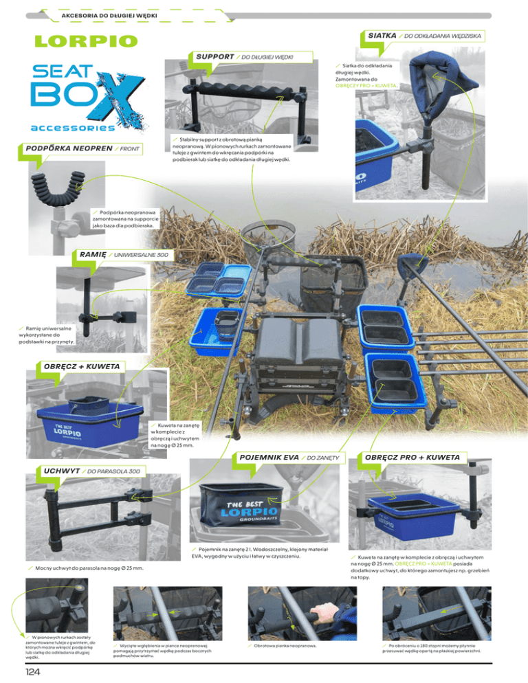 AKCESORIA DO DŁUGIEJ WĘDKI SIATKA / SUPPORT / DO ODKŁADANIA WĘDZISKA DO DŁUGIEJ WĘDKI / Siatka do odkładania długiej wędki. Zamontowana do OBRĘCZY PRO + KUWETA. / Stabilny support z obrotową pianką PODPÓRKA NEOPREN / neopranową. W pionowych rurkach zamontowane tuleje z gwintem do wkręcania podpórki na podbierak lub siatkę do odkładania długiej wędki. FRONT / Podpórka neopranowa zamontowana na supporcie jako baza dla podbieraka. RAMIĘ / UNIWERSALNE 300 / Ramię uniwersalne wykorzystane do podstawki na przynęty. OBRĘCZ + KUWETA / Kuweta na zanętę w komplecie z obręczą i uchwytem na nogę Ø 25 mm. POJEMNIK EVA / UCHWYT / DO ZANĘTY OBRĘCZ PRO + KUWETA DO PARASOLA 300 / Pojemnik na zanętę 2 l. Wodoszczelny, klejony materiał EVA, wygodny w użyciu i łatwy w czyszczeniu. / Kuweta na zanętę w komplecie z obręczą i uchwytem na nogę Ø 25 mm. OBRĘCZ PRO + KUWETA posiada dodatkowy uchwyt, do którego zamontujesz np. grzebień na topy. / Mocny uchwyt do parasola na nogę Ø 25 mm. / W pionowych rurkach zostały zamontowane tuleje z gwintem, do których można wkręcić podpórkę lub siatkę do odkładania długiej wędki. 124 / Wycięte wgłębienia w piance neoprenowej pomagają przytrzymać wędkę podczas bocznych podmuchów wiatru. / Obrotowa pianka neopranowa. / Po obróceniu o 180 stopni możemy płynnie przesuwać wędkę opartą na płaskiej powierzchni.