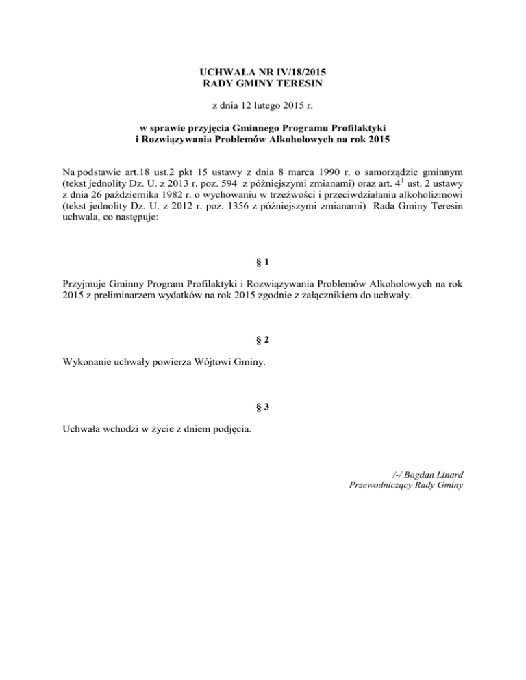 UCHWAŁA NR IV/18/2015 RADY GMINY TERESIN z dnia 12 lutego 2015 r. w sprawie przyjęcia Gminnego Programu Profilaktyki i Rozwiązywania Problemów Alkoholowych na rok 2015 Na pod stawie art.18 ust.2 pkt 15 ustawy z dnia 8 marca 1990 r. o samorządzie gminnym (tekst jednolity Dz. U. z 2013 r. poz. 594 z późniejszymi zmianami) oraz art. 4 1 ust. 2 ustawy z dnia 26 października 1982 r. o wychowaniu w trzeźwości i przeciwdziałaniu alkoholizmowi (tekst jednolity Dz. U. z 2012 r. poz. 1356 z późniejszymi zmianami) Rada Gminy Teresin uchwala, co następuje: §1 Przyjmuje Gminny Program Profilaktyki i Rozwiązywania Problemów Alkoholowych na rok 2015 z preliminarzem wydatków na rok 2015 zgodnie z załącznikiem do uchwały. §2 Wykonanie uchwały powierza Wójtowi Gminy. §3 Uchwała wchodzi w życie z dniem podjęcia. /-/ Bogdan Linard Przewodniczący Rady Gminy Załącznik do uchwały nr IV/18/2015 Rady Gminy Teresin z dnia 12 lutego 2015 r. GMINNY PROGRAM PROFILAKTYKI I ROZWIĄZYWANIA PROBLEMÓW ALKOHOLOWYCH na rok 2015 opracowała Maria Wójcicka Koordynator 2 Podstawowe regulacje prawne dotyczące polityki wobec alkoholu zawarte są w ustawie o wychowaniu w trzeźwości i przeciwdziałaniu alkoholizmowi, jednak to samorząd gminny odgrywa kluczową rolę w rozwiązywaniu problemów alkoholowych i wdrażaniu zaleceń ustawowych. Zgodnie z w/ w aktem prawnym zadania w zakresie przeciwdziałania uzależnieniom wykonuje się przez odpowiednie kształtowanie polityki społecznej, działalność wychowawczą i informacyjną, ograniczanie dostępności do alkoholu, leczenie, rehabilitację i reintegrację osób uzależnionych od alkoholu, zapobieganie negatywnym następstwom nadużywania alkoholu i ich usuwanie. Znajomość wytycznych oraz możliwość ich praktycznego zastosowania w wyżej wymienionych obszarach to warunek konieczny aby prawidłowo realizować ustawowe zadania. Ustawodawca przekazując samorządom gminnym obowiązki w zakresie w/w zadań zadbał o odrębne środki finansowe na ich realizację. Finansową podstawę realizacji GPPiRPA stanowią dochody gminy z opłat za wydane zezwolenia na sprzedaż napojów alkoholowych zgodnie z art. 18 2 ustawy o wychowaniu w trzeźwości i przeciwdziałaniu alkoholizmowi. Gminny Program Profilaktyki i Rozwiązywania Problemów Alkoholowych na rok 2015 określa lokalne działania w zakresie profilaktyki oraz minimalizacji szkód społecznych i indywidualnych zgodnie z najnowszą wiedzą na temat skuteczności poszczególnych strategii profilaktycznych i naprawczych. Zadania i sposoby ich realizacji określone w GPPiRPA w 2015 roku dostosowane są do potrzeb i możliwości prowadzenia określonych form pracy w oparciu o posiadane zasoby instytucjonalne i osobowe oraz ewentualną pomoc merytoryczną i materialną ze strony podmiotów zewnętrznych – jednostek samorządowych wyższego szczebla, organizacji, instytucji i osób fizycznych. Przy opracowaniu Gminnego Programu Profilaktyki i Rozwiązywania Problemów Alkoholowych /GPPiRPA/ w Gminie Teresin w 2015 r. uwzględnione zostały wskazówki wynikające z Rekomendacji do realizowania i finansowania gminnych programów profilaktyki i rozwiązywania problemów alkoholowych w 2015 roku Państwowej Agencji Rozwiązywania Problemów Alkoholowych. 3 REKOMENDOWANE DZIAŁANIA W RAMACH GMINNYCH PROGRAMÓW PROFILAKTYKI I ROZWIĄZYWANIA PROBLEMÓW ALKOHOLOWYCH : I. Zwiększenie dostępności pomocy terapeutycznej uzależnionych od alkoholu poprzez: i rehabilitacyjnej dla osób 1. Podniesienie poziomu usług terapeutycznych poprzez szkolenie kadry medycznej i osób, które zajmują się profesjonalnym pomaganiem osobom uzależnionym od alkoholu i ich rodzinom – ( terapeuty, członków komisji, koordynatora, pracowników socjalnych, pedagogów). 2. Przeprowadzenie rozmów pierwszego kontaktu. 3. Działalność punktu konsultacyjnego dla osób uzależnionych i współuzależnionych mieszczącego się w Teresińskim Ośrodku Kultury w Teresinie. 4. Obsługa dyżuru Telefonu Zaufania dla rodzin z problemem alkoholowym – TOK Teresin 86 -149 – 32. 5. Funkcjonowanie punktu dla osób uzależnionych w Domu Parafialnym. 6. Współpraca z grupą wstępną dla osób uzależnionych. 7. Umieszczenie pacjentów na oddziale detoksykacyjnym. II. Udzielanie rodzinom, w których występują problemy psychospołecznej i prawnej realizowane poprzez: alkoholowe pomocy 1. Prowadzenie rozmów motywujących do leczenia, zobowiązywanie do stawienia się na leczenie i kierowanie do odpowiednich placówek w ramach pomocy osobom uzależnionym. 2. Pomoc w znalezieniu zatrudnienia bezrobotnym z problemem alkoholowym poprzez finansowanie kursów doskonalenia zawodowego, poszukiwanie ofert pracy. 3. Udzielenie pomocy ofiarom przemocy domowej – punkt w Domu Parafialnym w Niepokalanowie. 4. Organizowanie czasu wolnego dla dzieci z grup ryzyka – zajęcia w czasie ferii zimowych, wycieczki, kolonie profilaktyczno – terapeutyczne, wakacje w szkole. 5. Telefon zaufania dla osób współuzależnionych. 6. Współpraca z Gminnym Ośrodkiem Pomocy Społecznej 7. Współdziałanie z Posterunkiem Policji w związku z interwencjami domowymi i zjawiskiem przemocy. 4 III. Prowadzenie profilaktycznej działalności edukacyjnej i informacyjnej w szczególności dla dzieci i młodzieży realizowane poprzez: 1. Realizację programów profilaktycznych w szkołach podstawowych i gimnazjach. 2. Funkcjonowanie świetlic profilaktyczno – wychowawczych samorządowych i Domu Parafialnym w Niepokalanowie. 3. Kącik informacyjny w Gminnej informacyjne, fachowa literatura. Bibliotece Publicznej – w szkołach broszury, materiały 4. Konkursy propagujące zdrowy styl życia i alternatywne sposoby spędzania wolnego czasu. 5. Współpraca z Kościołem mająca na celu propagowanie zdrowia i trzeźwych obyczajów. 6. Nawiązywanie współpracy z miejscowymi zakładami pracy w ramach działalności naprawczej. 7. Działalność na rzecz przec