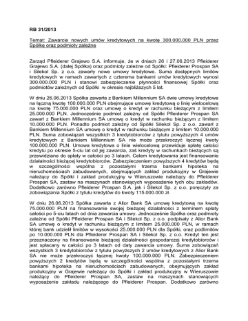 RB 31/2013 Temat: Zawarcie nowych umów kredytowych na kwotę 300.000.000 PLN przez Spółkę oraz podmioty zależne Zarząd Pfleiderer Grajewo S.A. informuje, że w dniach 26 i 27.06.2013 Pfleiderer Grajewo S.A. (dalej Spółka) oraz podmioty zależne od Spółki: Pfleiderer Prospan SA i Silekol Sp. z o.o. zawarły nowe umowy kredytowe. Suma dostępnych limitów kredytowych w ramach zawartych z czterema bankami umów kredytowych wynosi 300.000.000 PLN i stanowi zabezpieczenie płynności finansowej Spółki oraz podmiotów zależnych od Spółki w okresie najbliższych 5 lat. W dniu 26.06.2013 Spółka zawarła z Bankiem Millennium SA dwie umowy kredytowe na łączną kwotę 100.000.000 PLN obejmujące umowę kredytową o linię wielocelową na kwotę 75.000.000 PLN oraz umowę o kredyt w rachunku bieżącym z limitem 25.000.000 PLN. Jednocześnie podmiot zależny od Spółki Pfleiderer Prospan SA zawarł z Bankiem Millennium SA umowę o kredyt w rachunku bieżącym z limitem 10.000.000 PLN. Ponadto podmiot zależny od Spółki Silekol Sp. z o.o. zawarł z Bankiem Millennium SA umowę o kredyt w rachunku bieżącym z limitem 10.000.000 PLN. Suma zobowiązań wszystkich 3 kredytobiorców z tytułu powyższych 4 umów kredytowych z Bankiem Millennium SA nie może przekroczyć łącznej kwoty 100.000.000 PLN. Umowa kredytowa o linie wielocelową przewiduje spłatę całości kredytu po okresie 5-ciu lat od jej zawarcia, zaś kredyty w rachunkach bieżących są przewidziane do spłaty w całości po 3 latach. Celem kredytowania jest finansowanie działalności bieżącej kredytobiorców. Zabezpieczeniem powyższych 4 kredytów będą w szczególności wspólna z pozostałymi trzema bankami hipoteka na nieruchomościach zabudowanych, obejmujących zakład produkcyjny w Grajewie należący do Spółki i zakład produkcyjny w Wieruszowie należący do Pfleiderer Prospan SA, zastaw na maszynach stanowiących wyposażenie tych obu zakładów. Dodatkowo zarówno Pfleiderer Prospan S.A. jak i Silekol Sp. z o.o. poręczyły za zobowiązania Spółki z tytułu kredytów do kwoty 115.000.000 zł. W dniu 26.06.2013 Spółka zawarła z Alior Bank SA umowę kredytową na kwotę 75.000.000 PLN na finansowanie swojej bieżącej działalności z terminem spłaty całości po 5-ciu latach od dnia zawarcia umowy. Jednocześnie Spółka oraz podmioty zależne od Spółki Pfleiderer Prospan SA i Silekol Sp. z o.o. podpisały z Alior Bank SA umowę o kredyt w rachunku bieżącym z limitem 25.000.000 PLN, w ramach której bank udzielił limitów w wysokości 25.000.000 PLN dla Spółki, oraz podlimitów po 10.000.000 PLN dla Pfleiderer Prospan SA i Silekol Sp. z o.o. Kredyt ten jest przeznaczony na finansowanie bieżącej działalności gospodarczej kredytobiorców i jest spłacany w całości po 3 latach od daty zawarcia umowy. Suma zobowiązań wszystkich 3 kredytobiorców z tytułu powyższych 2 umów kredytowych z Alior Bank SA nie może przekroczyć łącznej kwoty 100.000.000 PLN. Zabezpieczeniem powyższych 2 kredytów będą w szczególności wspólna z pozostałymi trzema bankami hipoteka na nieruchomościach zabudowanych, obejmujących zakład produkcyjny w Grajewie należący do Spółki i zakład produkcyjny w Wieruszowie należący do Pfleiderer Prospan SA, zastaw na maszynach stanowiących wyposażenie zakładu należącego do Pfleiderer Prospan. Dodatkowo zarówno Pfleiderer Prospan SA jak i Silekol Sp. z o.o. poręczyły za zobowiązania Spółki z tytułu kredytów do kwoty 115.000.000 zł. W dniu 26.06.2013 Spółka zawarła z Bankiem Zachodnim WBK SA umowę o wielocelową linię kredytową na kwotę 45.000.000 PLN z przeznaczeniem na zabezpieczenie płynności i finansowanie nakładów inwestycyjnych z terminem spłaty całości po 5-ciu latach od dnia zawarcia umowy. Jednocześnie Spółka oraz podmioty zależne od Spółki Pfleiderer Prospan SA i Silekol Sp. z o.o. podpisały z Bankiem Zachodnim WBK SA umowę o kredyt w rachunku bieżącym z limitem 15.000.000 PLN, który jest limitem wspólnym dla wszystkich 3 kredytobiorców. Kredyt ten jest przeznaczony na zabezpieczenie płynności i finansowanie nakładów inwestycyjnych i jest spłacany w całości po 3 latach od daty zawarcia umowy. Suma zobowiązań wszystkich 3 kredytobiorców z tytułu powyższych 2 umów kredytowych z Bankiem Zachodnim WBK SA nie może przekroczyć łącznej kwoty 60.000.000 PLN. Zabezpieczeniem powyższych 2 kredytów będą w szczególności wspólna z pozostałymi trzema bankami hipoteka na nieruchomościach zabudowanych, obejmujących zakład produkcyjny w Grajewie należący do Spółki i zakład produkcyjny w Wieruszowie należący do Pfleiderer Prospan SA, zastaw na maszynach stanowiących wyposażenie zakładu należącego do Spółki. W dniu 27.06.2013 Spółka zawarła z Bankiem Ochrony Środowiska SA umowę kredytową w postaci linii wielocelowej na kwotę 40.000.000 PLN z przeznaczeniem na finansowanie bieżącej działalności Spółki z terminem spłaty 5 lat od dnia zawarcia umowy. Zabezpieczeniem powyższego kredytu będą w szczególności wspólna z pozostałymi trzema bankami hipoteka na nieruchomościach zabudowanych, obejmujących zakład produkcyjny w Grajewie należący do Spółki i zakład produkcyjny w Wieruszowie należący do Pfleiderer Prospan SA, zastaw na maszynach stanowiących wyposażenie zakładu należącego do Spółki. Kryterium uznania umów kredytowych za znaczące są kapitały własne Spółki. Raport sporządzono na podstawie § 5 ust. 1 pkt 3 i 7 Rozporządzenia Ministra Finansów z dnia 19 lutego 2009 roku w sprawie informacji bieżących i okresowych przekazywanych przez emitentów papierów wartościowych oraz warunków uznawania za równoważne informacji wymaganych przepisami prawa państwa niebędącego państwem członkowskim (Dz. U. Nr 33, poz. 259 z późniejszymi zmianami). 27.06.2013