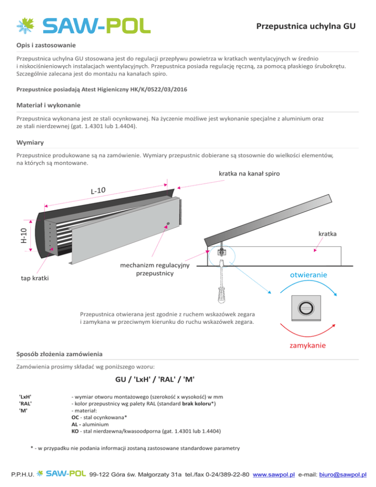 Przepustnica uchylna GU Opis i zastosowanie Przepustnica uchylna GU stosowana jest do regulacji przepływu powietrza w kratkach wentylacyjnych w średnio i niskociśnieniowych instalacjach wentylacyjnych. Przepustnica posiada regulację ręczną, za pomocą płaskiego śrubokrętu. Szczególnie zalecana jest do montażu na kanałach spiro. Przepustnice posiadają Atest Higieniczny HK/K/0522/03/2016 Materiał i wykonanie Przepustnica wykonana jest ze stali ocynkowanej. Na życzenie możliwe jest wykonanie specjalne z aluminium oraz ze stali nierdzewnej (gat. 1.4301 lub 1.4404). Wymiary Przepustnice produkowane są na zamówienie. Wymiary przepustnic dobierane są stosownie do wielkości elementów, na których są montowane. kratka na kanał spiro H-10 L-10 kratka mechanizm regulacyjny przepustnicy tap kratki otwieranie Przepustnica otwierana jest zgodnie z ruchem wskazówek zegara i zamykana w przeciwnym kierunku do ruchu wskazówek zegara. zamykanie Sposób złożenia zamówienia Zamówienia prosimy składać wg poniższego wzoru: GU / 'LxH' / 'RAL' / 'M' 'LxH' 'RAL' 'M' - wymiar otworu montażowego (szerokość x wysokość) w mm - kolor przepustnicy wg palety RAL (standard brak koloru*) - materiał: OC - stal ocynkowana* AL - aluminium KO - stal nierdzewna/kwasoodporna (gat. 1.4301 lub 1.4404) * - w przypadku nie podania informacji zostaną zastosowane standardowe parametry P.P.H.U. 99-122 Góra św. Małgorzaty 31a tel./fax 0-24/389-22-80 www.sawpol.pl e-mail: [email protected]