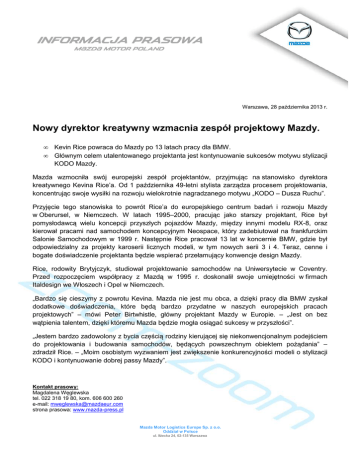 Warszawa, 28 października 2013 r. Nowy dyrektor kreatywny wzmacnia zespół projektowy Mazdy. • • Kevin Rice powraca do Mazdy po 13 latach pracy dla BMW. Głównym celem utalentowanego projektanta jest kontynuowanie sukcesów motywu stylizacji KODO Mazdy. Mazda wzmocniła swój europejski zespół projektantów, przyjmując na stanowisko dyrektora kreatywnego Kevina Rice’a. Od 1 października 49-letni stylista zarządza procesem projektowania, koncentrując swoje wysiłki na rozwoju wielokrotnie nagradzanego motywu „KODO – Dusza Ruchu”. Przyjęcie tego stanowiska to powrót Rice’a do europejskiego centrum badań i rozwoju Mazdy w Oberursel, w Niemczech. W latach 1995–2000, pracując jako starszy projektant, Rice był pomysłodawcą wielu koncepcji przyszłych pojazdów Mazdy, między innymi modelu RX-8, oraz kierował pracami nad samochodem koncepcyjnym Neospace, który zadebiutował na frankfurckim Salonie Samochodowym w 1999 r. Następnie Rice pracował 13 lat w koncernie BMW, gdzie był odpowiedzialny za projekty karoserii licznych modeli, w tym nowych serii 3 i 4. Teraz, cenne i bogate doświadczenie projektanta będzie wspierać przełamujący konwencje design Mazdy. Rice, rodowity Brytyjczyk, studiował projektowanie samochodów na Uniwersytecie w Coventry. Przed rozpoczęciem współpracy z Mazdą w 1995 r. doskonalił swoje umiejętności w firmach Italdesign we Włoszech i Opel w Niemczech. „Bardzo się cieszymy z powrotu Kevina. Mazda nie jest mu obca, a dzięki pracy dla BMW zyskał dodatkowe doświadczenia, które będą bardzo przydatne w naszych europejskich pracach projektowych” – mówi Peter Birtwhistle, główny projektant Mazdy w Europie. – „Jest on bez wątpienia talentem, dzięki któremu Mazda będzie mogła osiągać sukcesy w przyszłości”. „Jestem bardzo zadowolony z bycia częścią rodziny kierującej się niekonwencjonalnym podejściem do projektowania i budowania samochodów, będących powszechnym obiektem pożądania” – zdradził Rice. – „Moim osobistym wyzwaniem jest zwiększenie konkurencyjności modeli o stylizacji KODO i kontynuowanie dobrej passy Mazdy”. Kontakt prasowy: Magdalena Węglewska tel. 022 318 19 80, kom. 606 600 260 e-mail: [email protected] strona prasowa: www.mazda-press.pl Mazda Motor Logistics Europe Sp. z o.o. Oddział w Polsce ul. Iłżecka 24, 02-135 Warszawa
