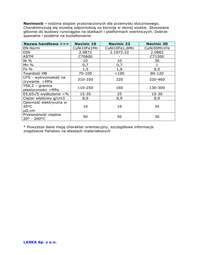 Navinox® - rodzina stopów przeznaczonych dla przemysłu stoczniowego. Charakteryzują się wysoką odpornością na korozję w słonej wodzie. Stosowane głównie do budowy rurociągów na statkach i platformach wiertniczych. Dobrze spawalne i podatne na kształtowanie. Nazwa handlowa >>> EN-Norm DIN ASTM Ni % Mn % Fe % Twardość HB UTS - wytrzymałość na zrywanie >MPa YS0,2 – granica plastyczności >MPa E5,65√S wydłużenie >% Ciężar właściwy g/cm3 Oporność elektryczna w 20°C µΩ.cm Przewodność cieplna 20° - 200°C Navinic 10 CuNi10Fe1Mn 2.0872 C70600 10 0,7 1,5 70-100 Navinic 22 CuNi10Fe1,6Mn 2.1972.22 10 0,7 1,6 <100 Navinic 30 CuNi30Mn1Fe 2.0882 C71500 30 1 0,5 80-120 310-350 320 320-460 110-250 160 130-300 15-35 8,9 25 8,9 15-30 8,9 19 19 34 50 50 30 * Powyższe dane mają charakter orientacyjny, szczegółowe informacje znajdziecie Państwo na atestach materiałowych LASKA Sp. z o.o.