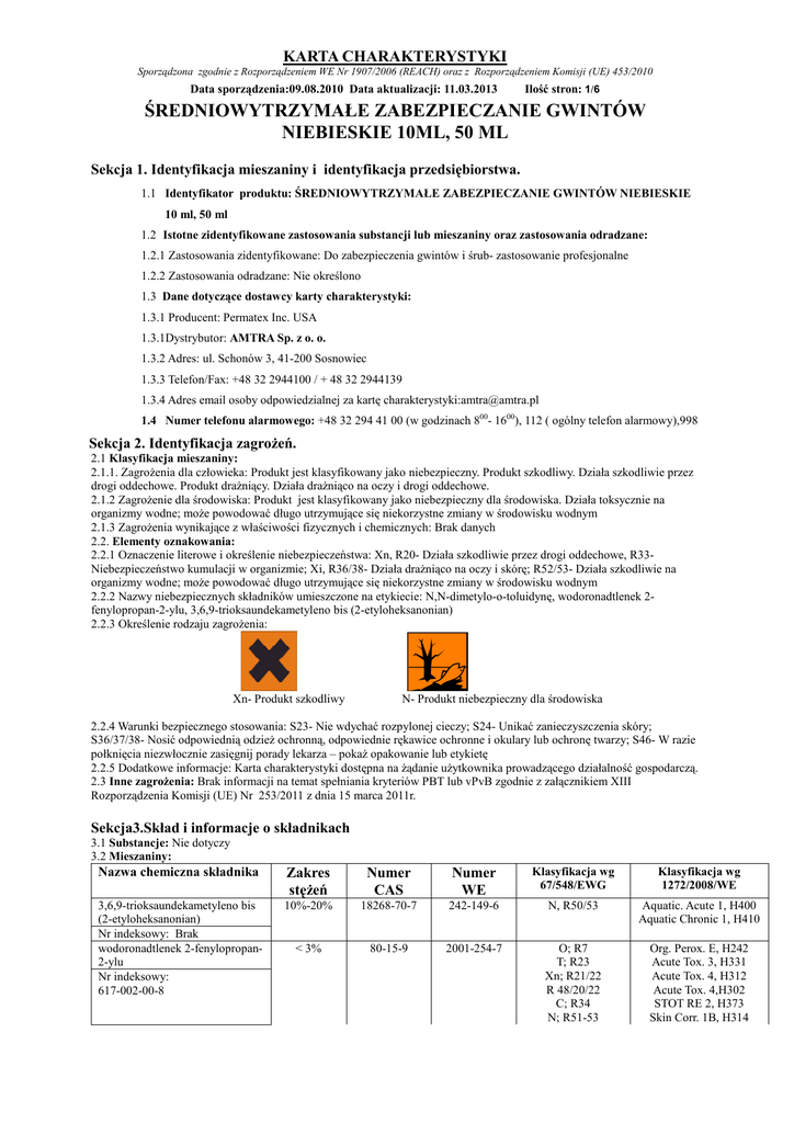 KARTA CHARAKTERYSTYKI Sporządzona zgodnie z Rozporządzeniem WE Nr 1907/2006 (REACH) oraz z Rozporządzeniem Komisji (UE) 453/2010 Data sporządzenia:09.08.2010 Data aktualizacji: 11.03.2013 Ilość stron: 1/6 ŚREDNIOWYTRZYMAŁE ZABEZPIECZANIE GWINTÓW NIEBIESKIE 10ML, 50 ML Sekcja 1. Identyfikacja mieszaniny i identyfikacja przedsiębiorstwa. 1.1 Identyfikator produktu: ŚREDNIOWYTRZYMAŁE ZABEZPIECZANIE GWINTÓW NIEBIESKIE 10 ml, 50 ml 1.2 Istotne zidentyfikowane zastosowania substancji lub mieszaniny oraz zastosowania odradzane: 1.2.1 Zastosowania zidentyfikowane: Do zabezpieczenia gwintów i śrub- zastosowanie profesjonalne 1.2.2 Zastosowania odradzane: Nie określono 1.3 Dane dotyczące dostawcy karty charakterystyki: 1.3.1 Producent: Permatex Inc. USA 1.3.1Dystrybutor: AMTRA Sp. z o. o. 1.3.2 Adres: ul. Schonów 3, 41-200 Sosnowiec 1.3.3 Telefon/Fax: +48 32 2944100 / + 48 32 2944139 1.3.4 Adres email osoby odpowiedzialnej za kartę charakterystyki:[email protected] 1.4 Numer telefonu alarmowego: +48 32 294 41 00 (w godzinach 800- 1600), 112 ( ogólny telefon alarmowy),998 Sekcja 2. Identyfikacja zagrożeń. 2.1 Klasyfikacja mieszaniny: 2.1.1. Zagrożenia dla człowieka: Produkt jest klasyfikowany jako niebezpieczny. Produkt szkodliwy. Działa szkodliwie przez drogi oddechowe. Produkt drażniący. Działa drażniąco na oczy i drogi oddechowe. 2.1.2 Zagrożenie dla środowiska: Produkt jest klasyfikowany jako niebezpieczny dla środowiska. Działa toksycznie na organizmy wodne; może powodować długo utrzymujące się niekorzystne zmiany w środowisku wodnym 2.1.3 Zagrożenia wynikające z właściwości fizycznych i chemicznych: Brak danych 2.2. Elementy oznakowania: 2.2.1 Oznaczenie literowe i określenie niebezpieczeństwa: Xn, R20- Działa szkodliwie przez drogi oddechowe, R33Niebezpieczeństwo kumulacji w organizmie; Xi, R36/38- Działa drażniąco na oczy i skórę; R52/53- Działa szkodliwie na organizmy wodne; może powodować długo utrzymujące się niekorzystne zmiany w środowisku wodnym 2.2.2 Nazwy niebezpiecznych składników umieszczone na etykiecie: N,N-dimetylo-o-toluidynę, wodoronadtlenek 2fenylopropan-2-ylu, 3,6,9-trioksaundekametyleno bis (2-etyloheksanonian) 2.2.3 Określenie rodzaju zagrożenia: Xn- Produkt szkodliwy N- Produkt niebezpieczny dla środowiska 2.2.4 Warunki bezpiecznego stosowania: S23- Nie wdychać rozpylonej cieczy; S24- Unikać zanieczyszczenia skóry; S36/37/38- Nosić odpowiednią odzież ochronną, odpowiednie rękawice ochronne i okulary lub ochronę twarzy; S46- W razie połknięcia niezwłocznie zasięgnij porady lekarza – pokaż opakowanie lub etykietę 2.2.5 Dodatkowe informacje: Karta charakterystyki dostępna na żądanie użytkownika prowadzącego działalność gospodarczą. 2.3 Inne zagrożenia: Brak informacji na temat spełniania kryteriów PBT lub vPvB zgodnie z załącznikiem XIII Rozporządzenia Komisji (UE) Nr 253/2011 z dnia 15 marca 2011r. Sekcja3.Skład i informacje o składnikach 3.1 Substancje: Nie dotyczy 3.2 Mieszaniny: Nazwa chemiczna składnika Zakres stężeń Numer CAS Numer WE Klasyfikacja wg 67/548/EWG Klasyfikacja wg 1272/2008/WE 3,6,9-trioksaundekametyleno bis (2-etyloheksanonian) Nr indeksowy: Brak wodoronadtlenek 2-fenylopropan2-ylu Nr indeksowy: 617-002-00-8 10%-20% 18268-70-7 242-149-6 N, R50/53 Aquatic. Acute 1, H400 Aquatic Chronic 1, H410 < 3% 80-15-9 2001-254-7 O; R7 T; R23 Xn; R21/22 R 48/20/22 C; R34 N; R51-53 Org. Perox. E, H242 Acute Tox. 3, H331 Acute Tox. 4, H312 Acute Tox. 4,H302 STOT RE 2, H373 Skin Corr. 1B, H314 KARTA CHARAKTERYSTYKI Sporządzona zgodnie z Rozporządzeniem WE Nr 1907/2006 (REACH) oraz z Rozporządzeniem Komisji (UE) 453/2010 Data sporządzenia:09.08.2010 Data aktualizacji: 11.03.2013 Ilość stron: 2/6 ŚREDNIOWYTRZYMAŁE ZABEZPIECZANIE GWINTÓW NIEBIESKIE 10ML, 50 ML N,N-dimetylo-p-toluidyna Nr indeksowy: Brak < 1% 613-48-9 210-345-0 Xn, R22, R43, N, R51/53 N,N-dimetylo-o-toluidyna Nr indeksowy: 612-056-00-9 <1% 609-72-3 210-199-8 T; R23/24/25 R33 R52-53 Nota C Aquatic Chronic 2, H411 Acute Tox.4, H302 Skin Sens.1, H317 Aquatic Chronic 3, H412 Acute Tox. 3, H331 Acute Tox. 3, H311 Acute Tox. 3, H301 STOT RE 2, H373 Aquatic Chronic 3, H412 Nota C SEKCJA 4. ŚRODKI PIERWSZEJ POMOCY 4.1 Opis środków pierwszej pomocy: 4.1.1 Połknięcie: W razie połknięcia przepłukać jamę ustną oraz przetransportować do najbliższej placówki medycznej celem podjęcia leczenia. Pokazać opakowanie lub etykietę. Nie wywoływać wymiotów, niebezpieczeństwo aspiracji. Jeśli wystąpią spontanicznie wymioty, trzymać głowę poniżej bioder. 4.1.2. Zatrucie inhalacyjne: Wynieść poszkodowanego z miejsca narażenia i zapewnić dostęp świeżego powietrza oraz spokój i odpoczynek. W przypadku dolegliwości (kaszel, wymioty, zawroty głowy, świszczący oddech) zapewnić pomoc lekarską. Nieprzytomnego ułożyć w pozycji bocznej. 4.1.3. Skażenie skóry: Zdjąć skażoną odzież. Skórę zmyć ciepłą wodą z mydłem. W razie wystąpienia podrażnienia skóry skontaktować się z lekarzem. 4.1.4.Skażenie oczu: Jeżeli poszkodowany nosi szkła kontaktowe niezwłocznie je wyjąć. Dokładnie przemyć oczy dużą ilością wody, wywijając powieki. Zapewnić pomoc okulisty. Uwaga: osoby narażone na skażenie oczu powinny być pouczone o konieczności i sposobie natychmiastowego płukania oczu 4.2 Najważniejsze ostre i opóźnione objawy oraz skutki narażenia: 4.2.1 Skażenie oczu: Może wystąpić podrażnienie, zaczerwienienie oraz łzawienie 4.2.2 Połknięcie: Mogą pojawić się mdłości, wymioty oraz ból brzucha, biegunka. Niebezpieczeństwo aspiracji 4.2.3 Wdychanie: Bóle głowy, nudności, zawroty głowy, podrażnienie dróg oddechowych, uszkodzenie centralnego układu nerwowego 4.3 Wskazania dotyczące wszelkiej natychmiastowej pomocy lekarskiej i szczególnego postępowania z poszkodowanym: Podjąć leczenie objawowe. SEKCJA 5. POSTĘPOWANIE W PRZYPADKU POŻARU 5.1